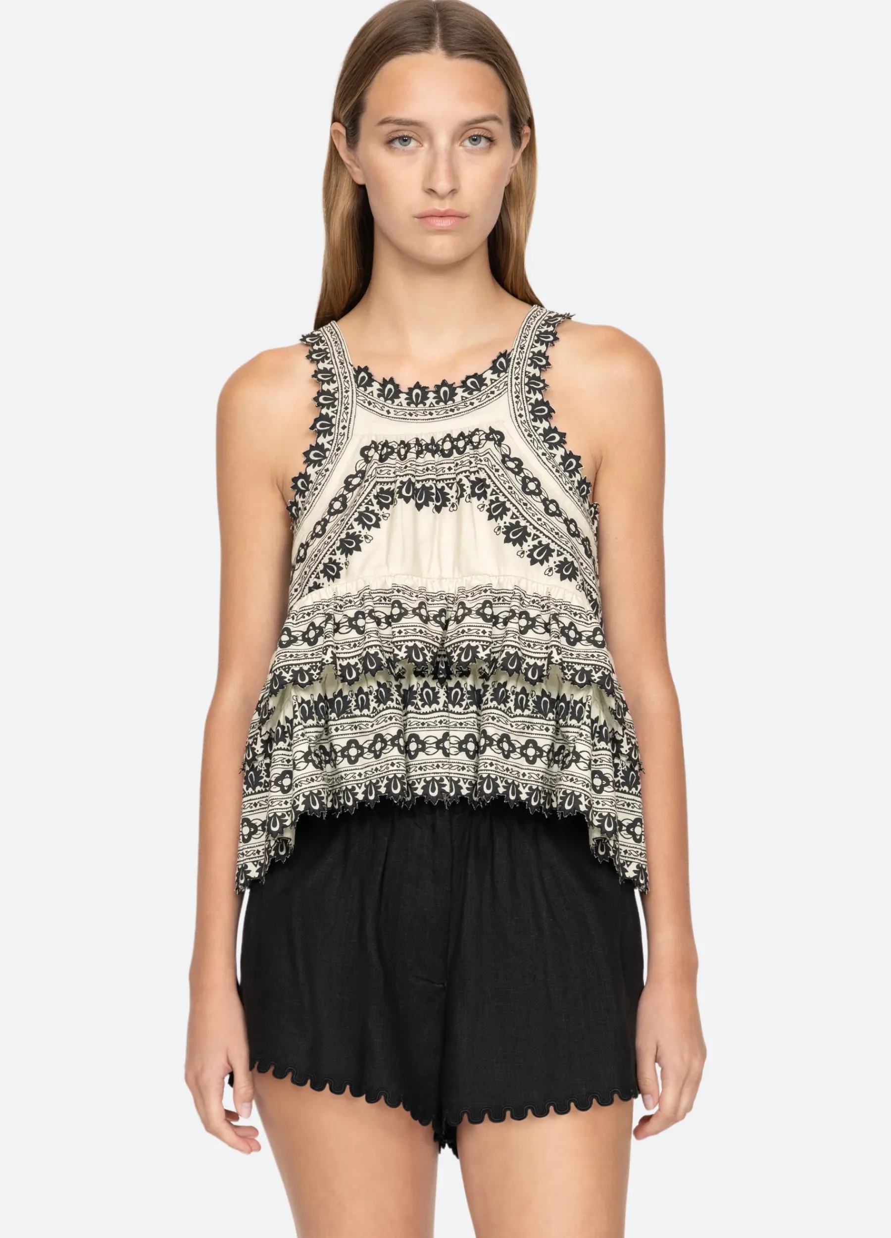 The Amina embroidered tank features a tiered ruffle hem. Designed for an easy, relaxed fit.