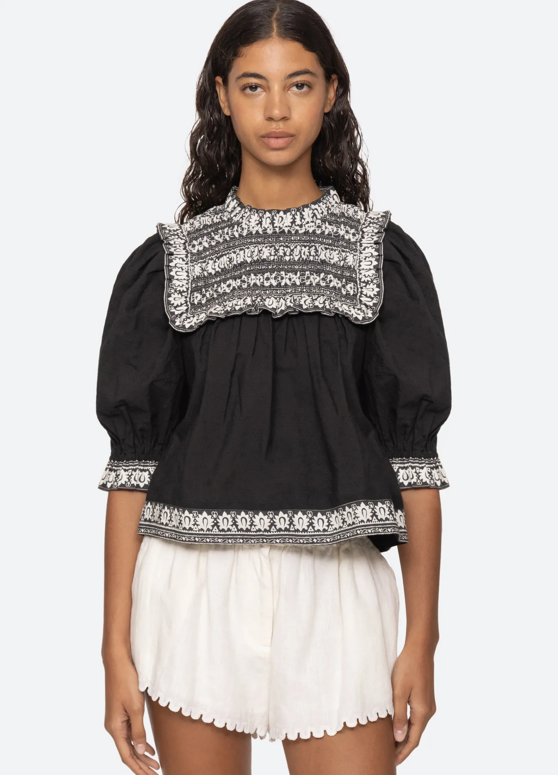 The Amina border print top features puff sleeves, smocked detailing and ruffle trim. Designed for an easy, relaxed fit.