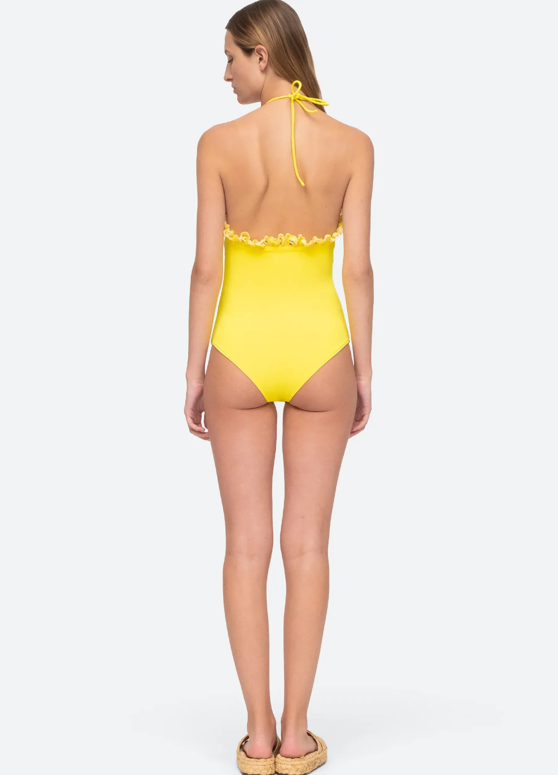The Arabella one piece swimsuit features a center cutout, ruffle embroidered detailing and halter neckline.