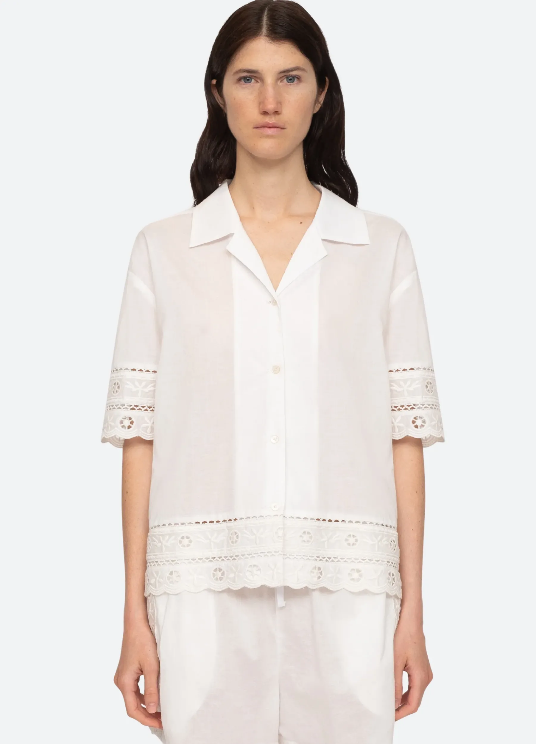 The Arabella embroidered swim short sleeve coverup top features embroidered trim detailing & button front closure.