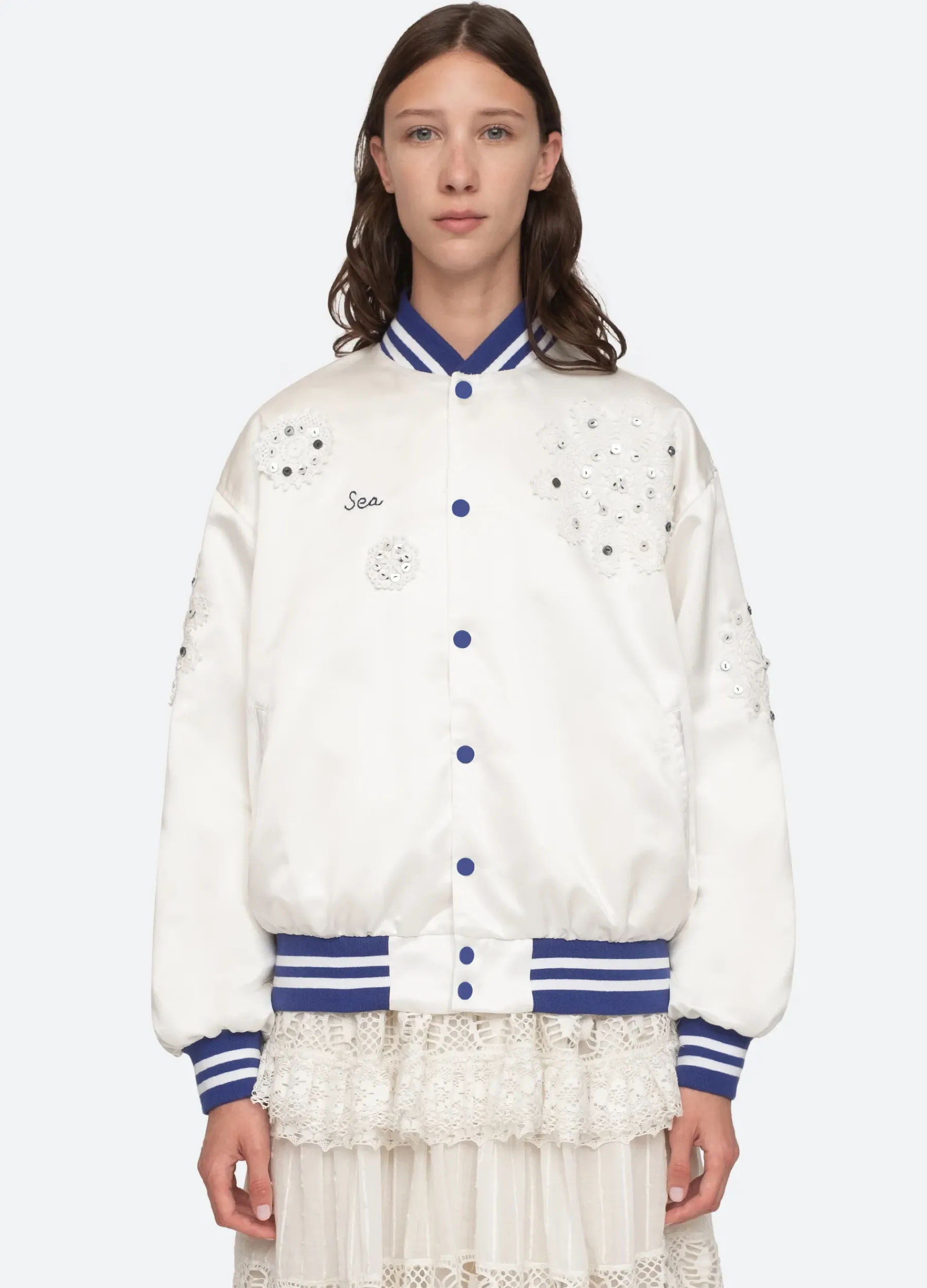 The Betina bomber jacket features beaded and lace embellishments and striped ribbed trim.