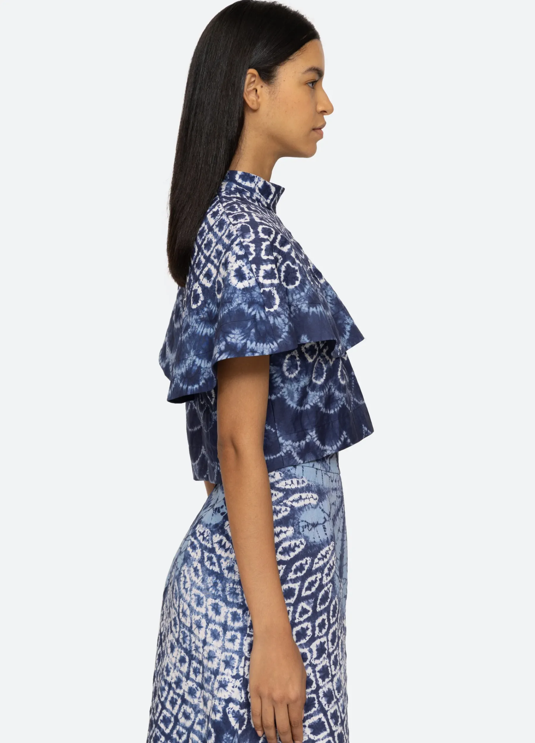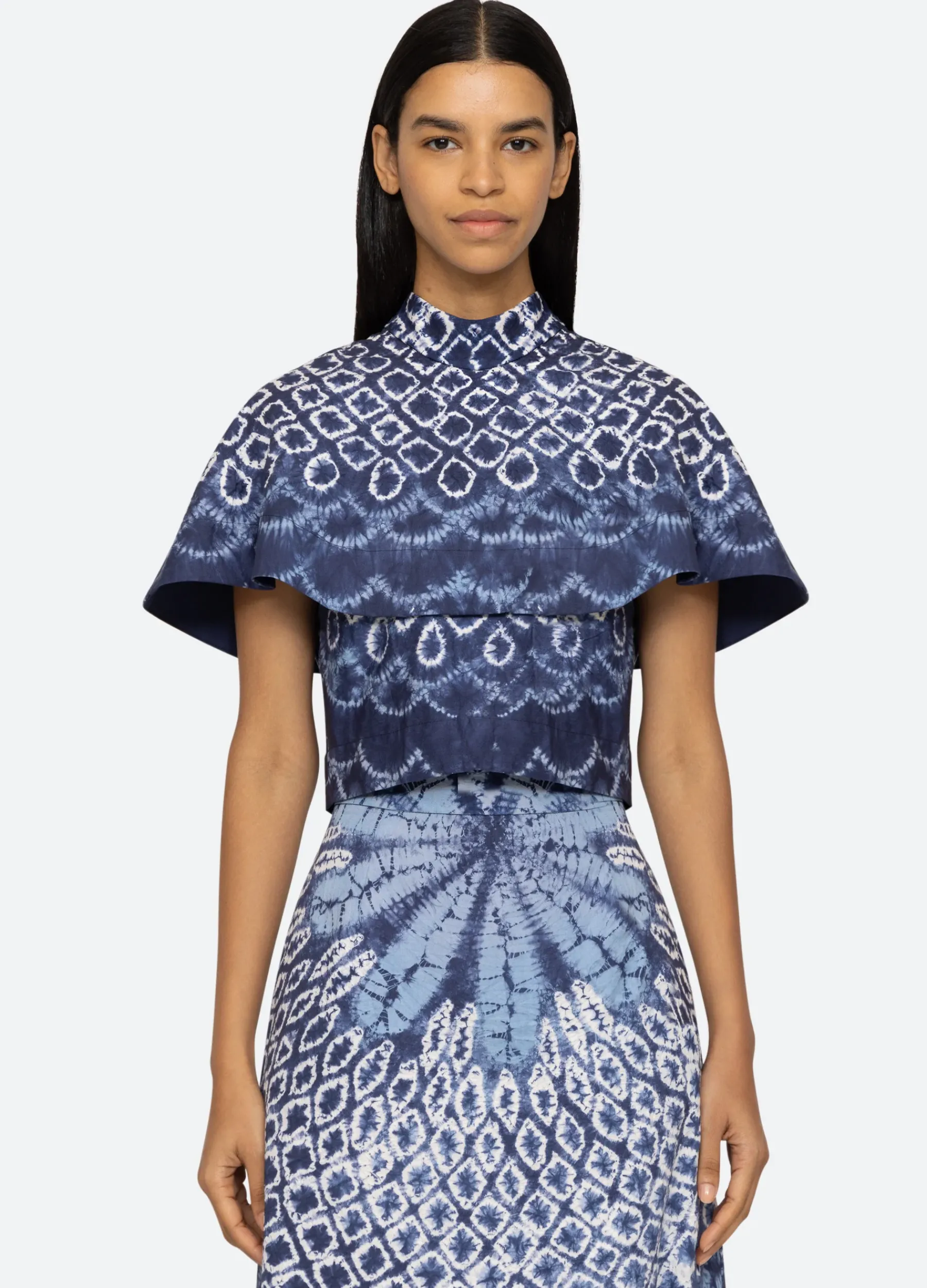 The Blythe tie dye top features a high neckline, cape style silhouette and abstract design.