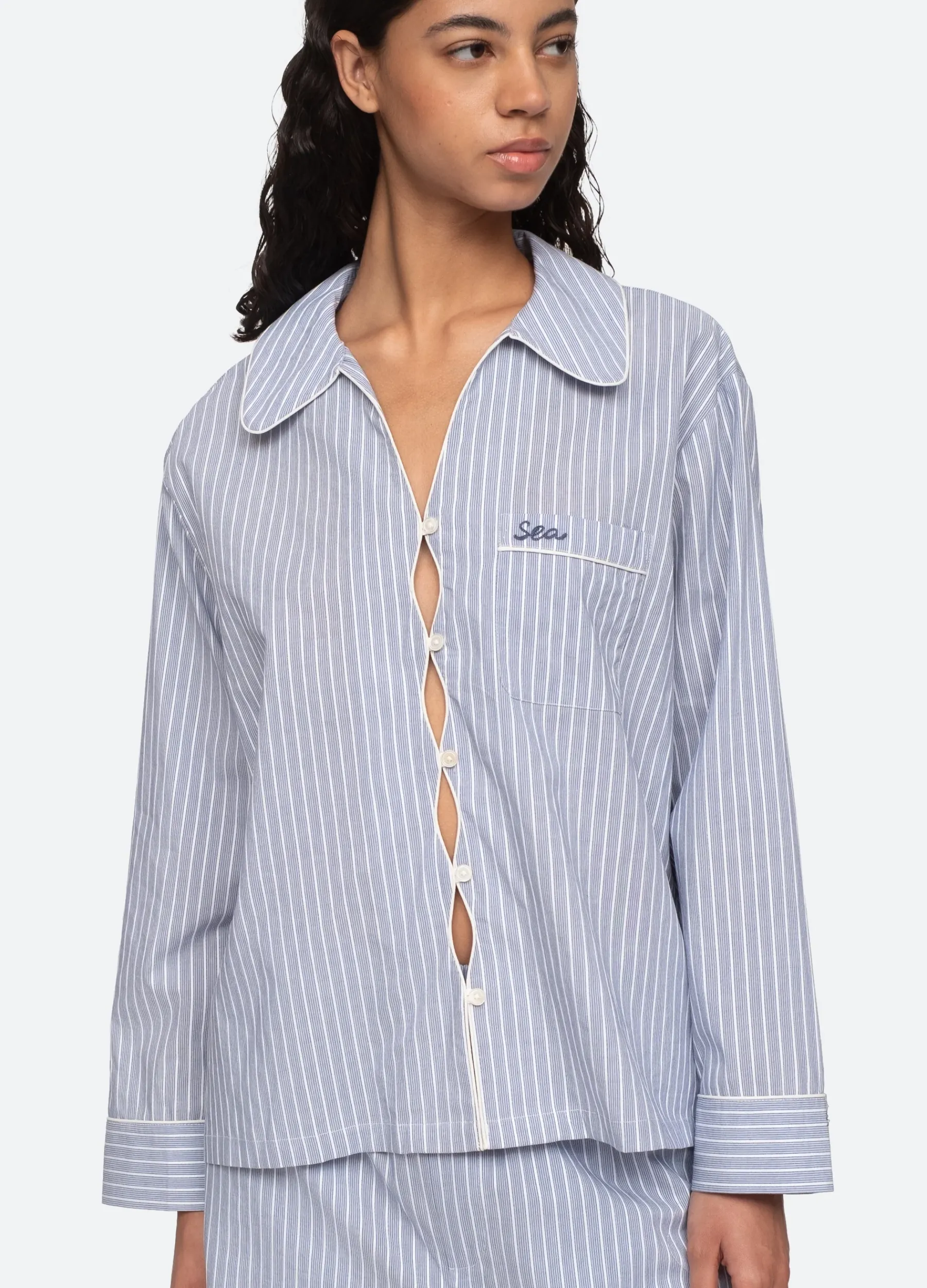 The Bree binding long pajama set features embroidered ‘SEA’ logo and cut-out detailing.