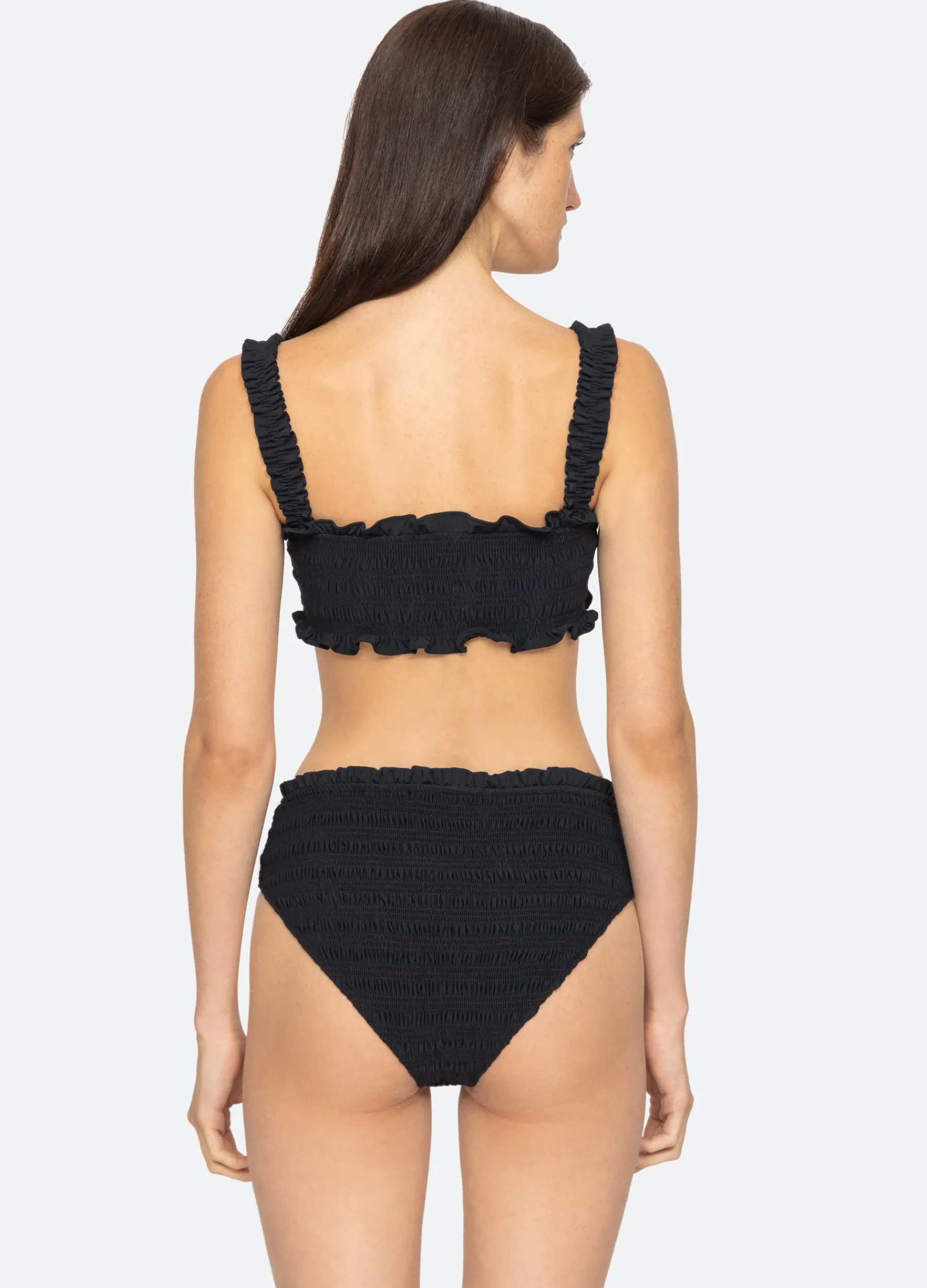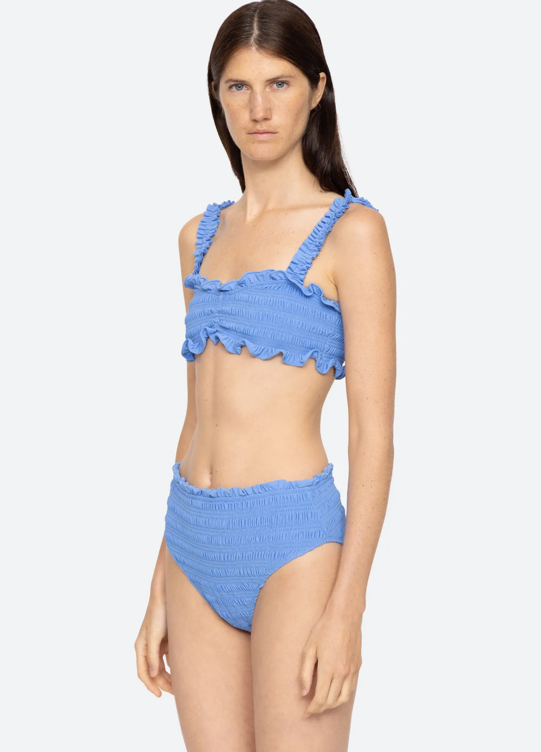 The Brice solid smocked ruffled bikini top features ruffle detailing and ruched straps.