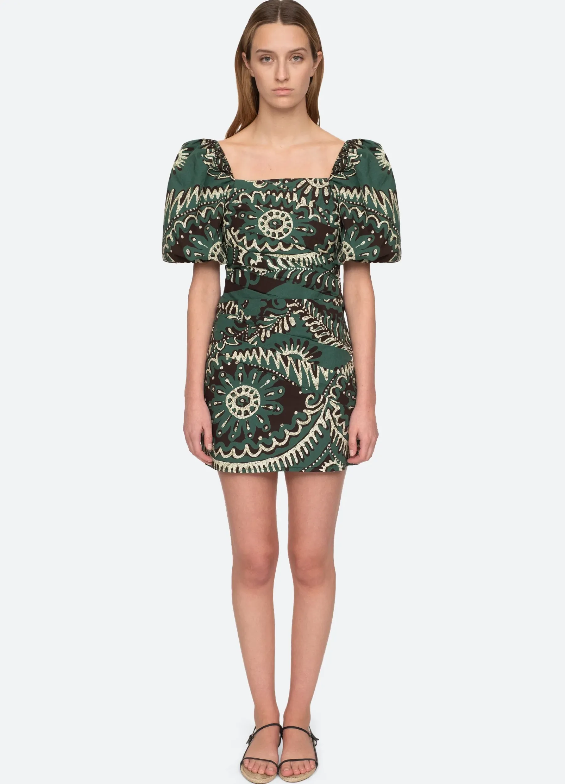 The Charlough graphic print mini dress features short puff sleeves, square neckline and draped detailing.