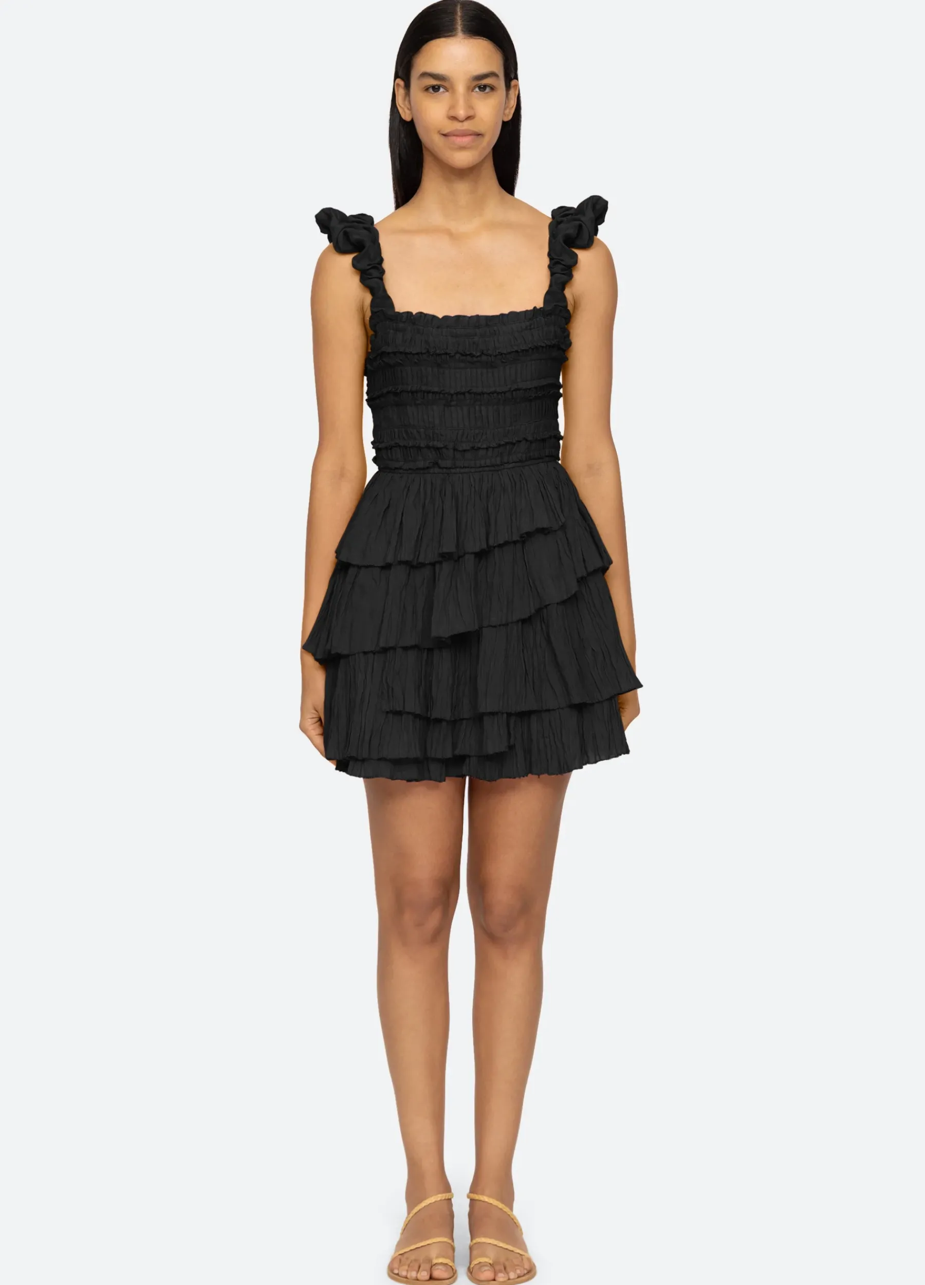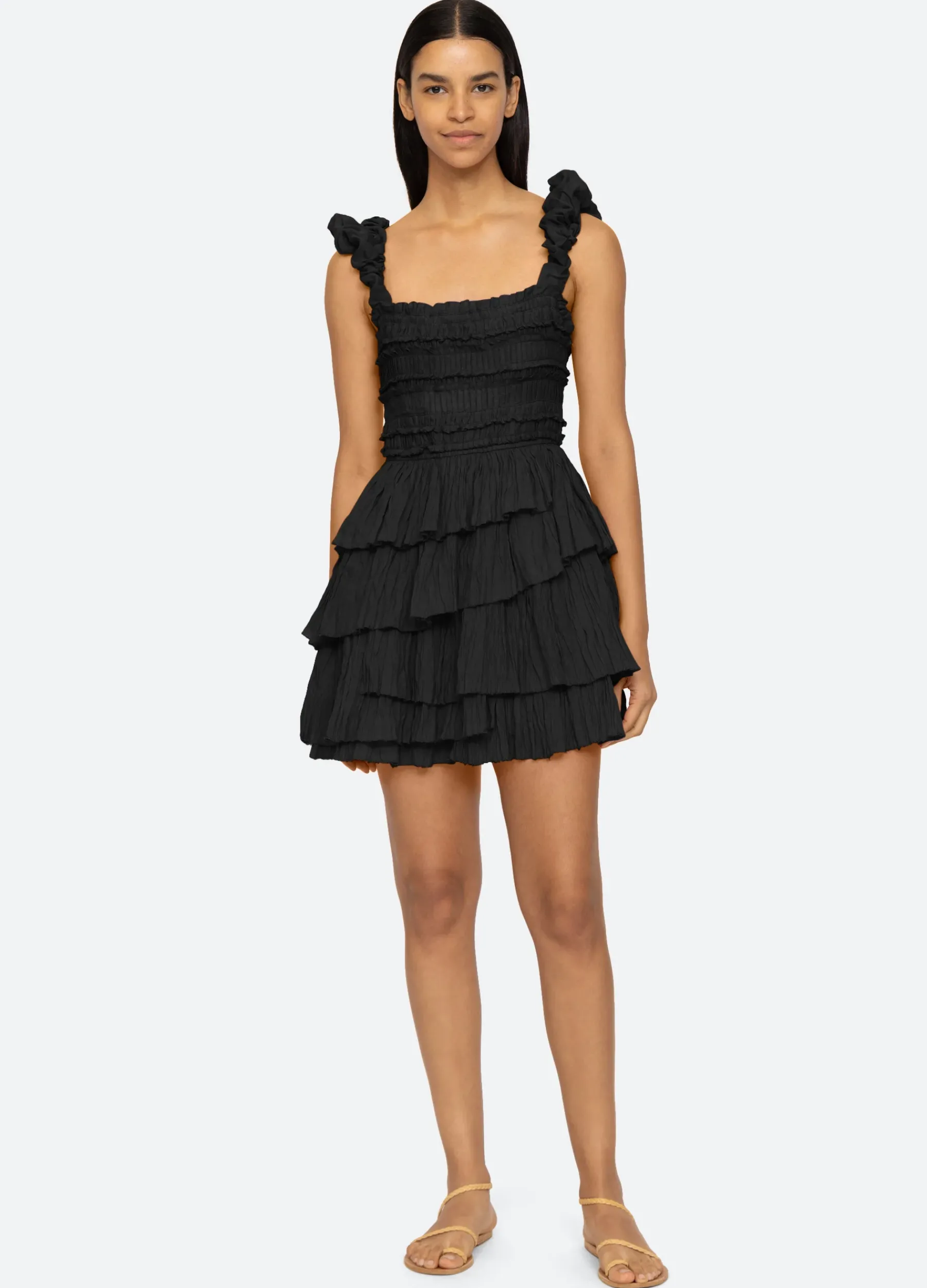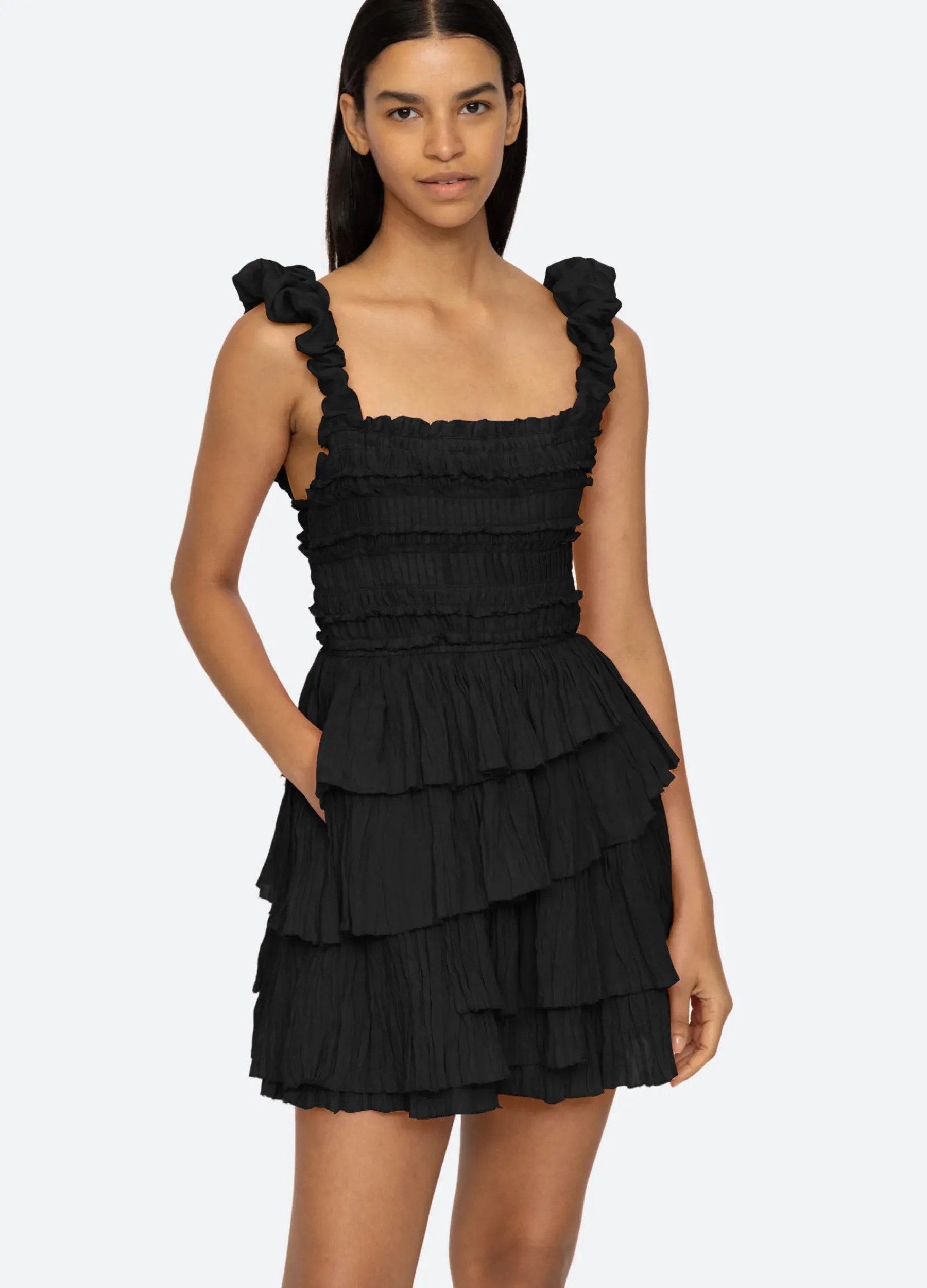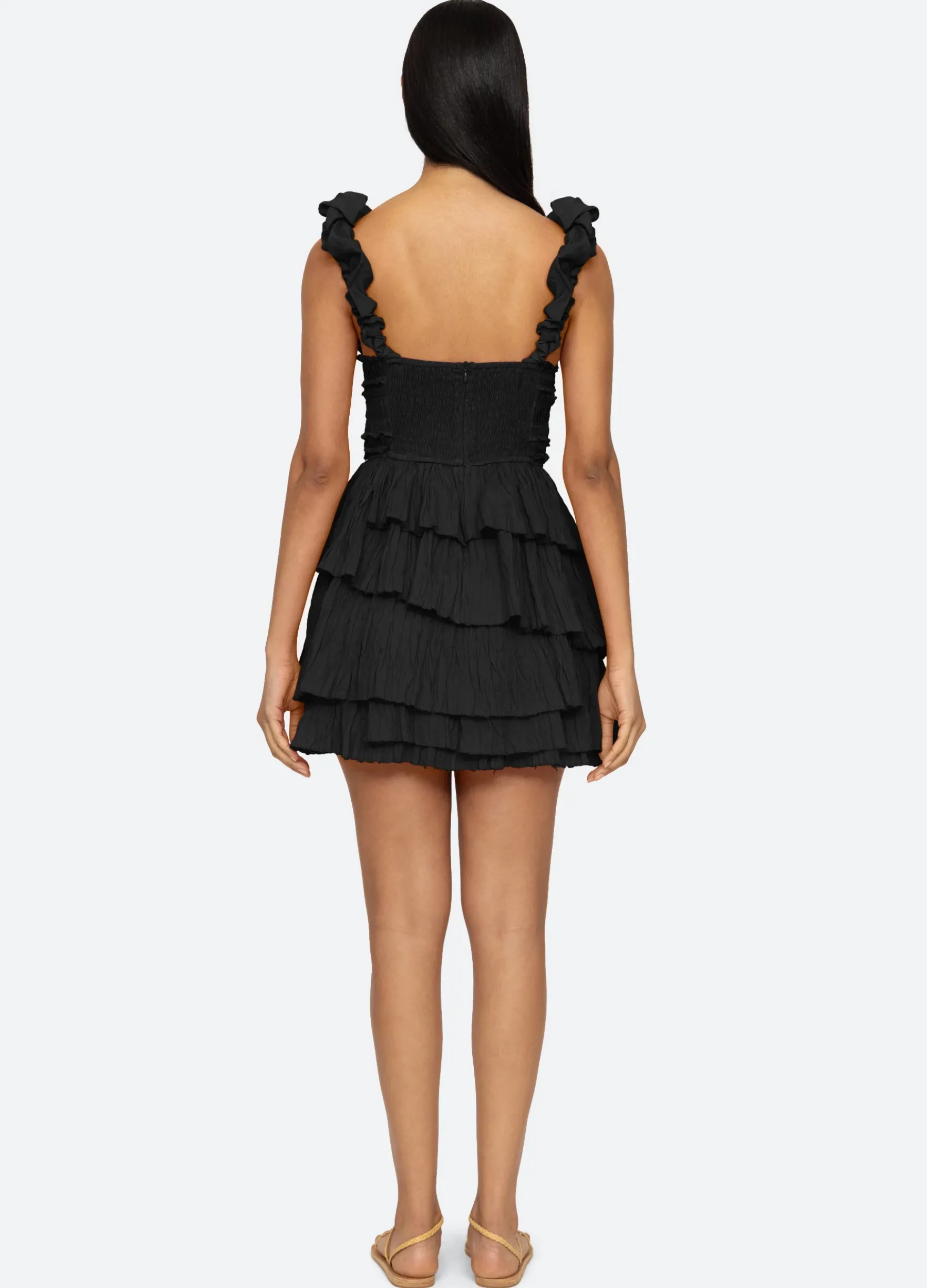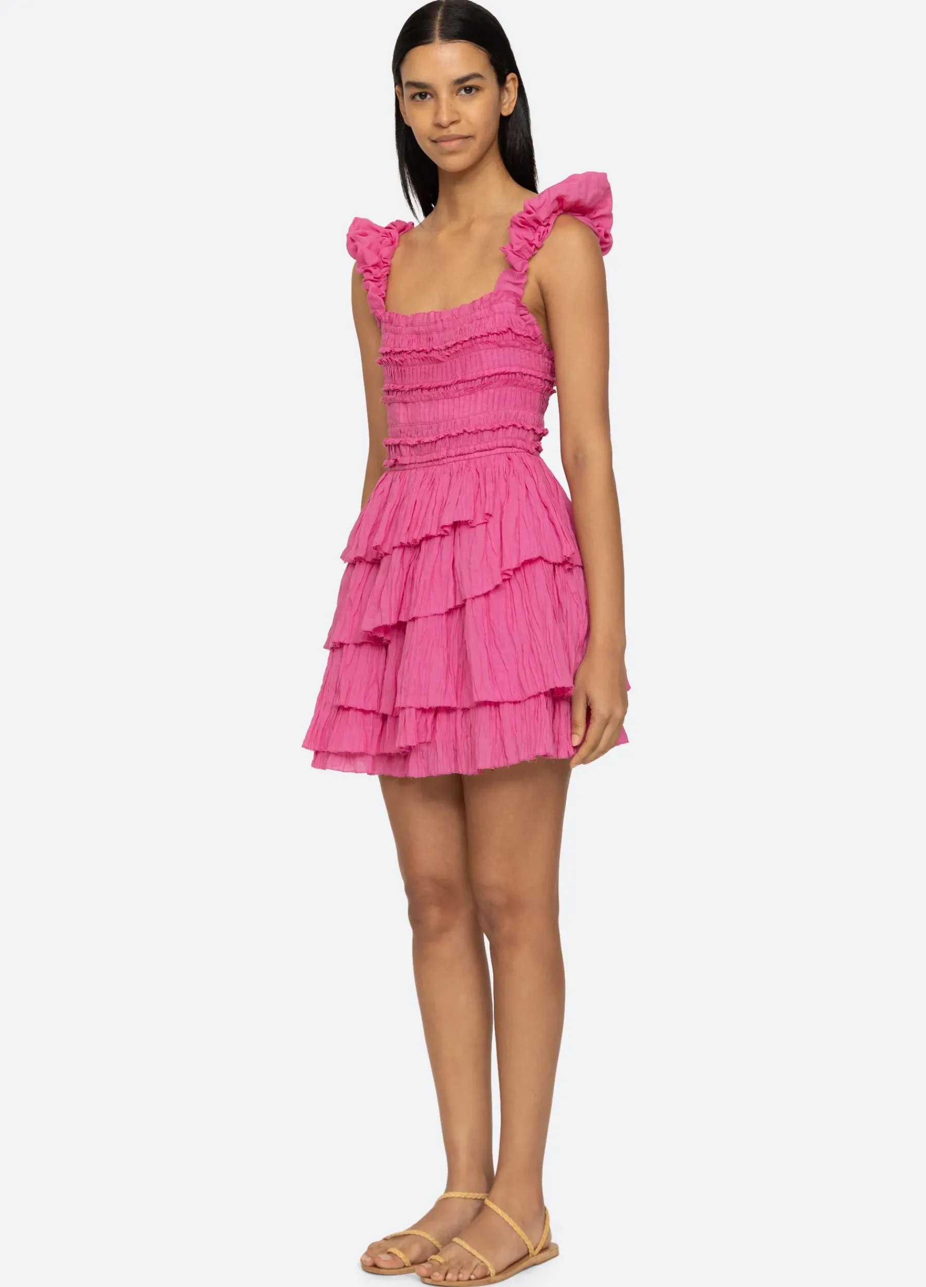 The Cole tiered dress features a smocked bodice, tiered ruffle detailing and mini silhouette.