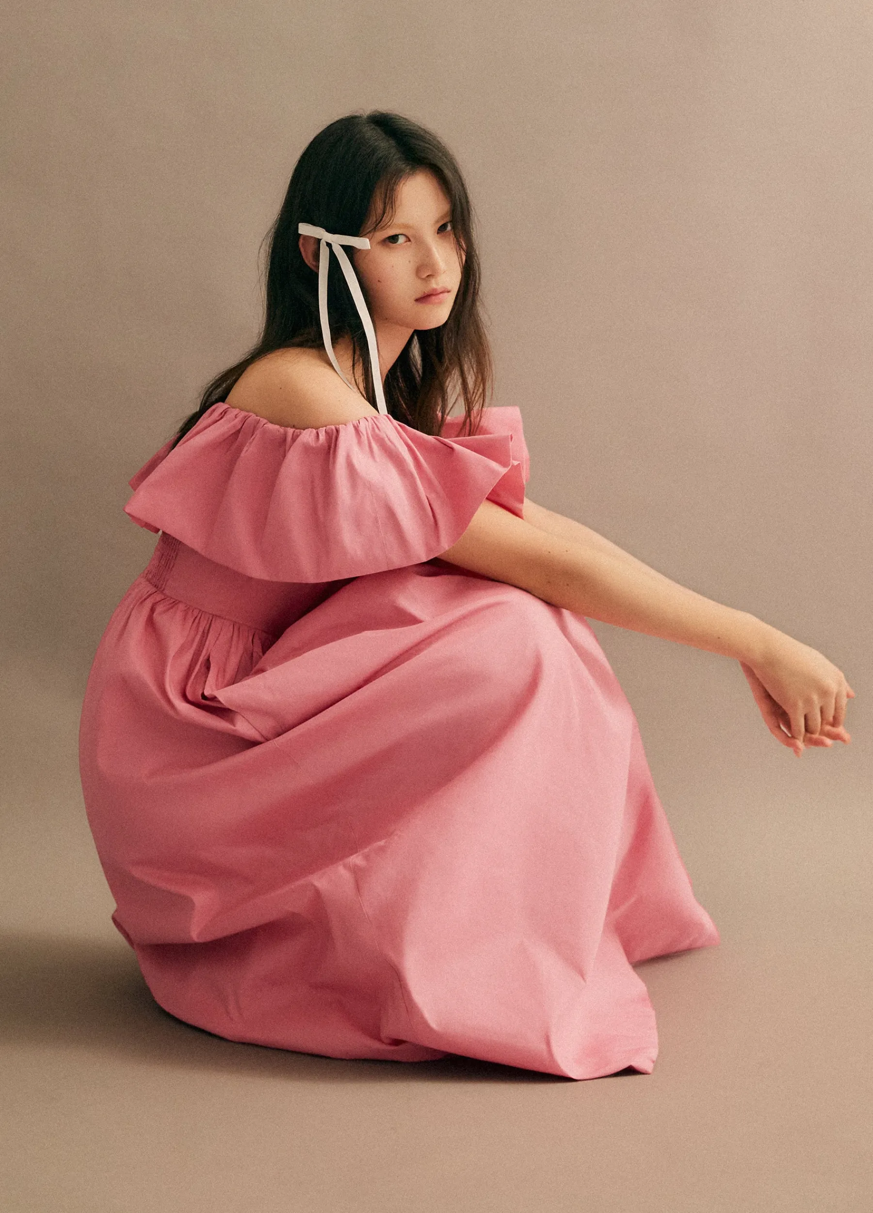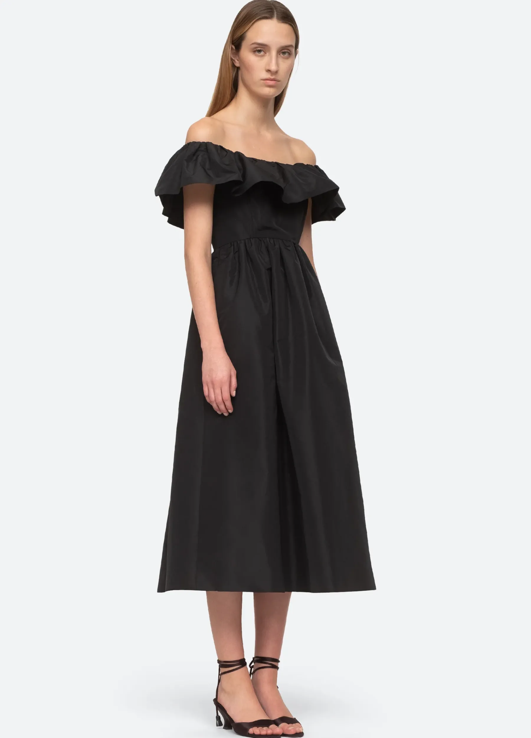 The Diana taffeta off the shoulder dress features an oversized off the shoulder ruffle and full skirt.