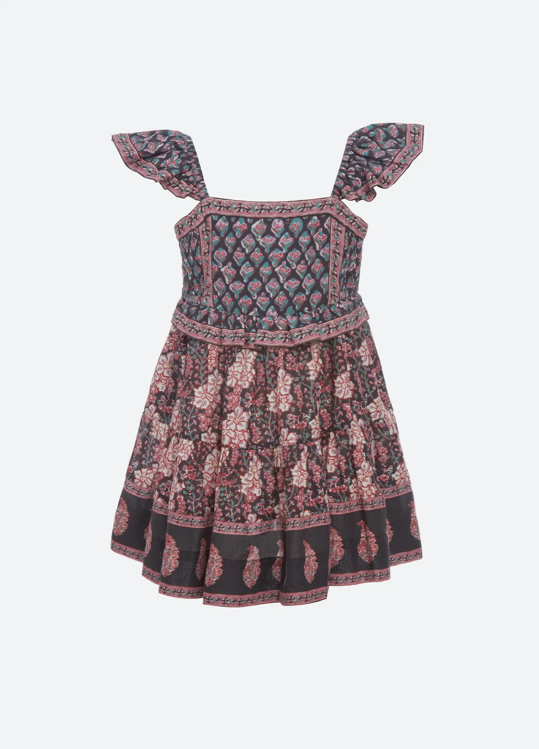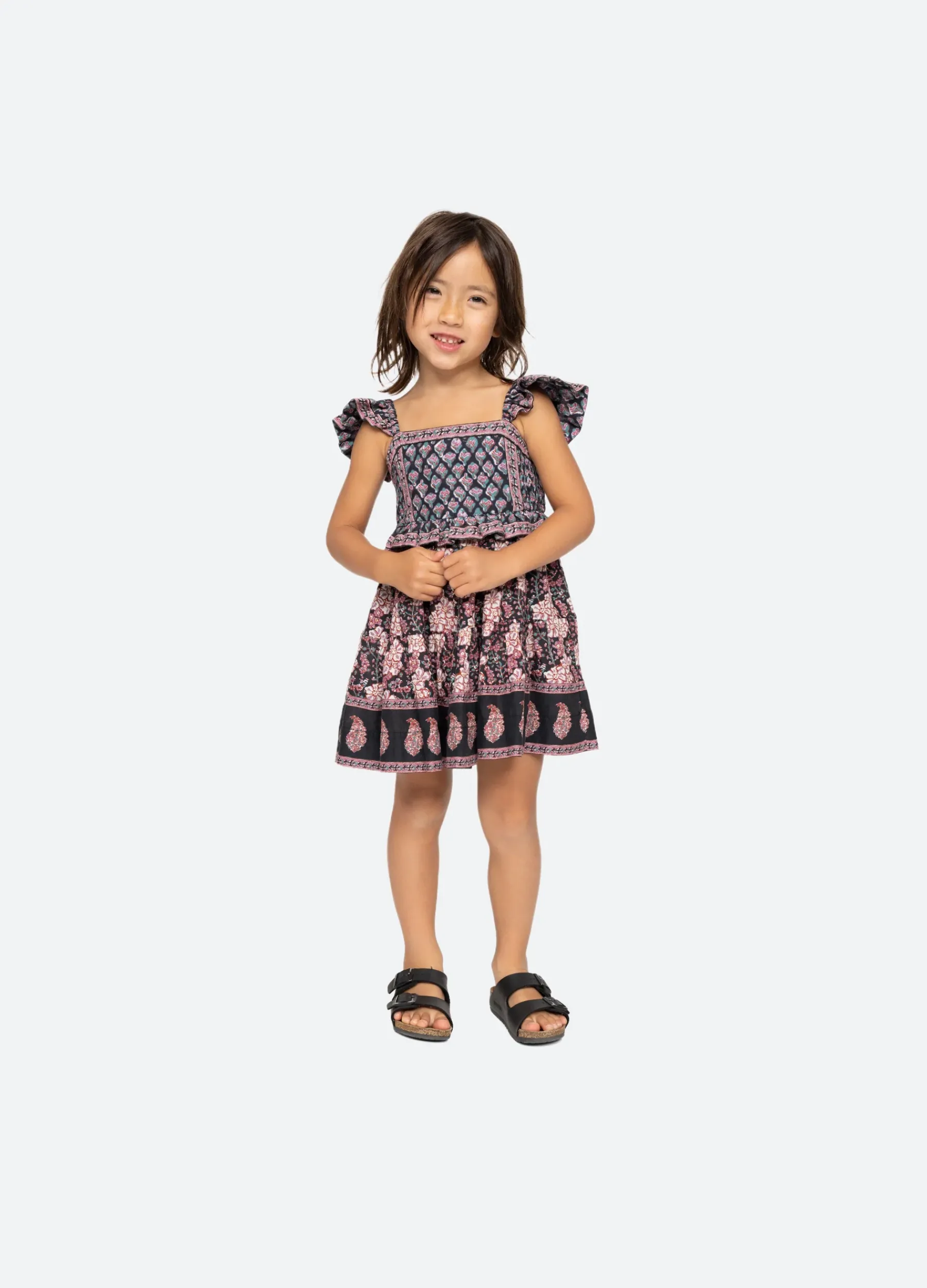 The Donna print kids dress features flutter sleeves and smocked detailing. Part of our mommy & me coordinating collection.