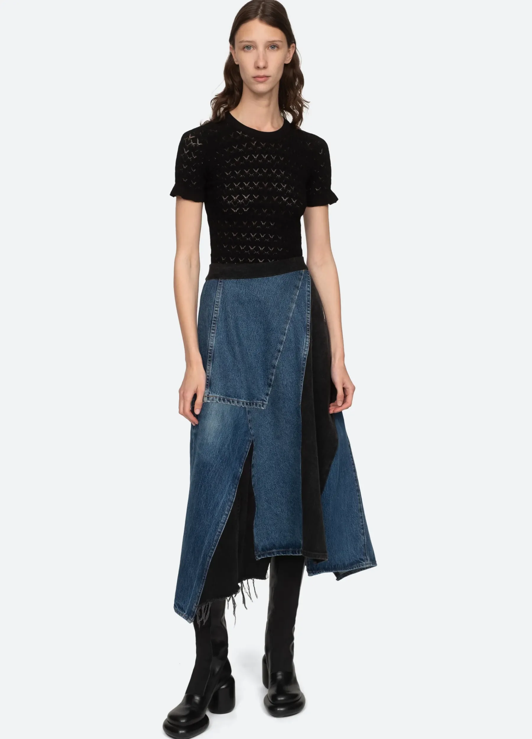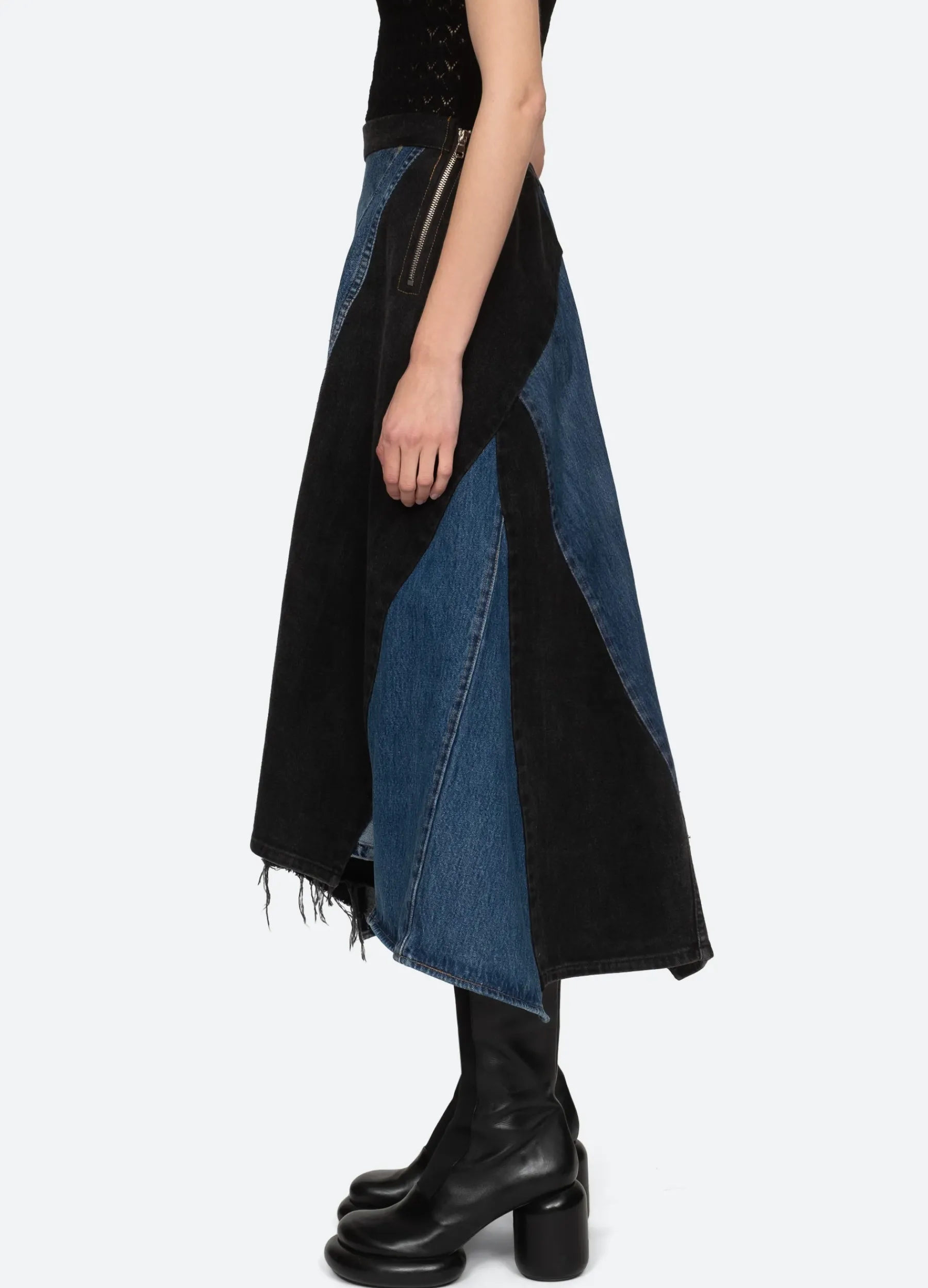 The Elena denim skirt features a variety of denim tones, deconstructed look and finished with a distressed accents.