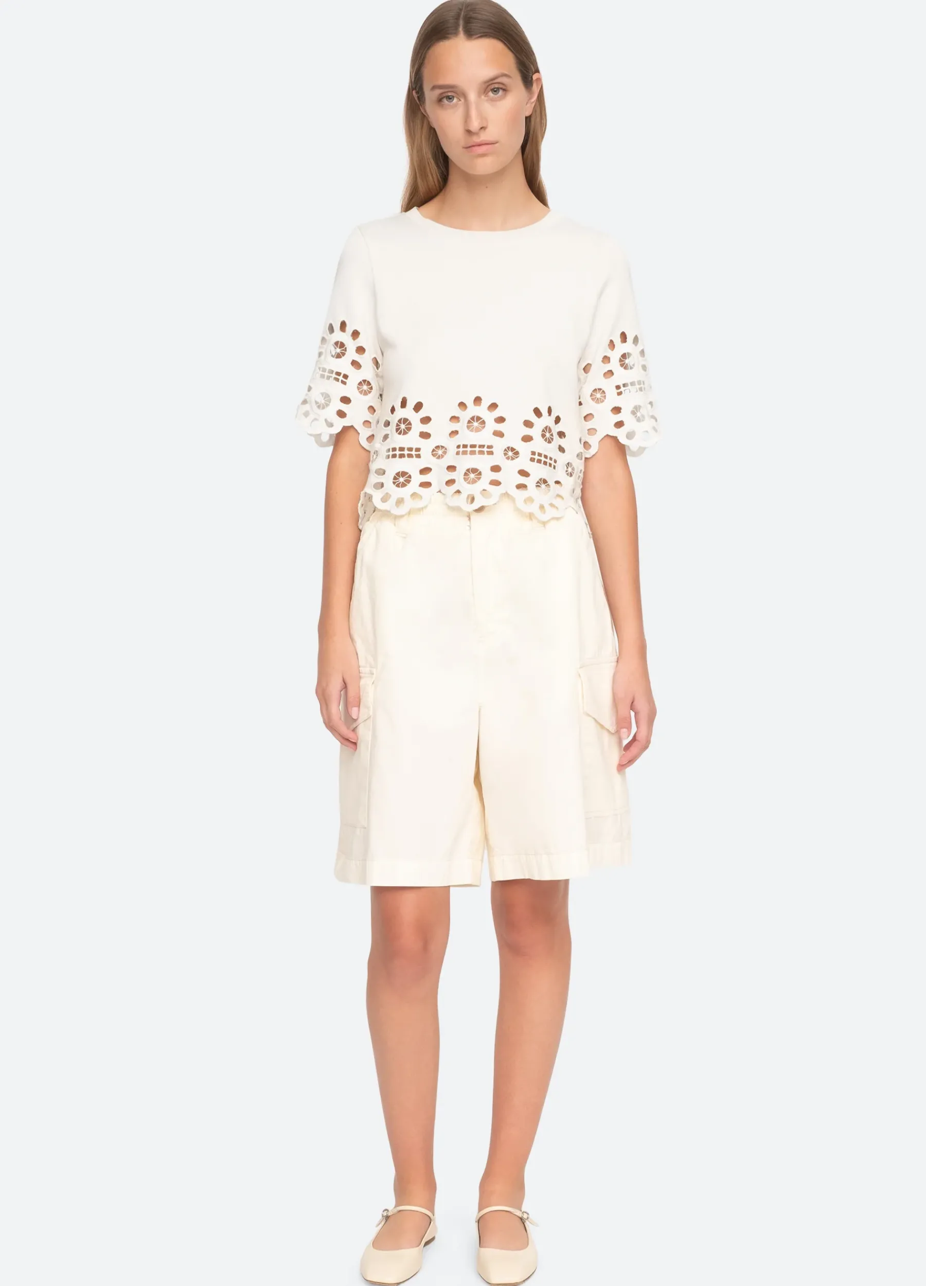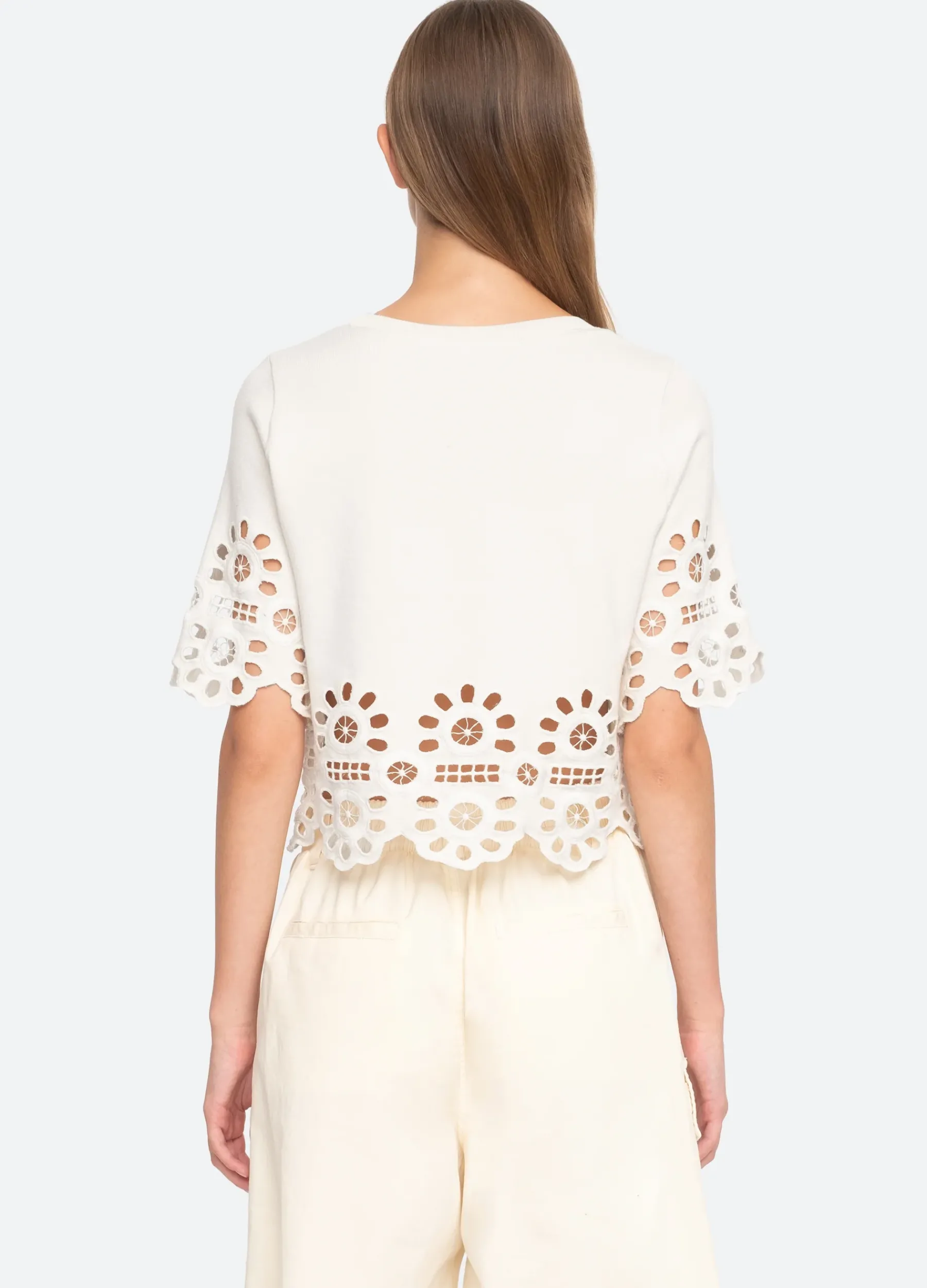 The Elysse embroidered sweater features oversized eyelet detailing on the sleeves and hem. Designed for an easy, relaxed fit.