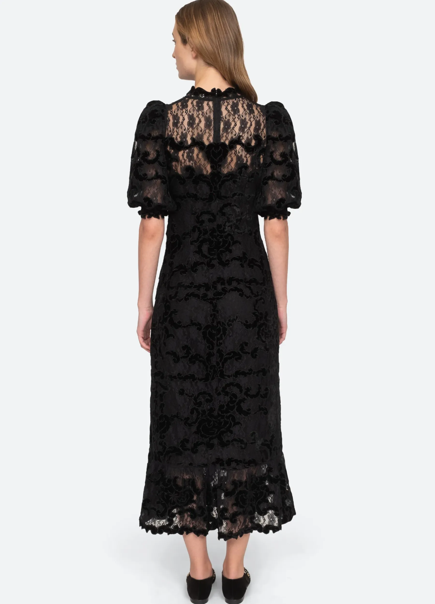 The Evita embroidered lace dress features short puff sleeves and sheer lace detailing.