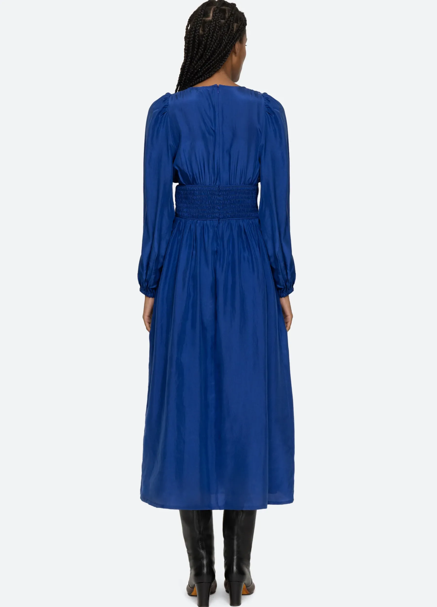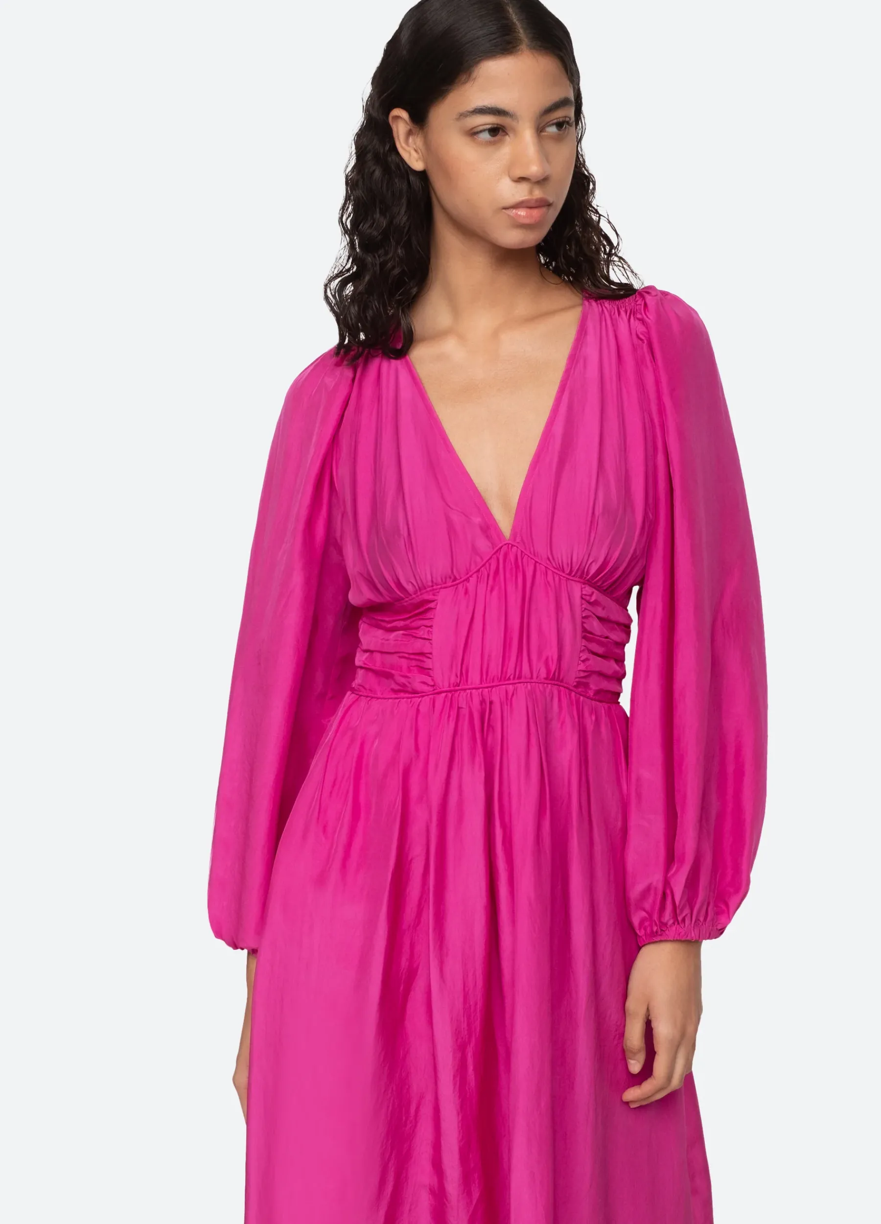 The Fabiola silk habotai dress features a v-neckline, ruched waistline with smocked back and long puff sleeves.