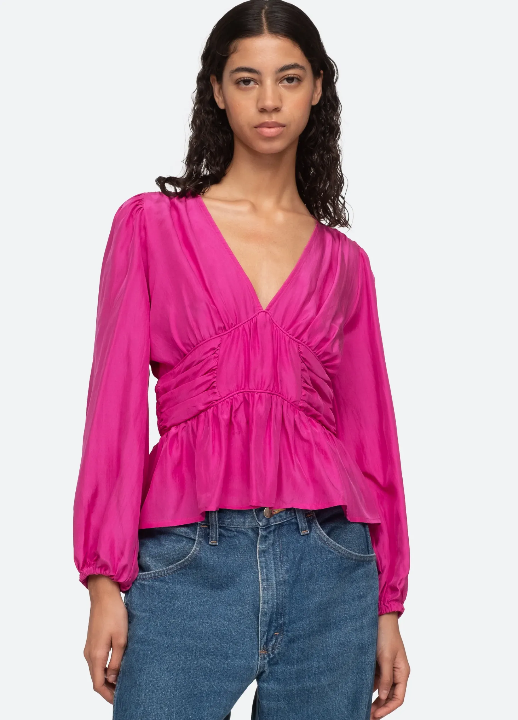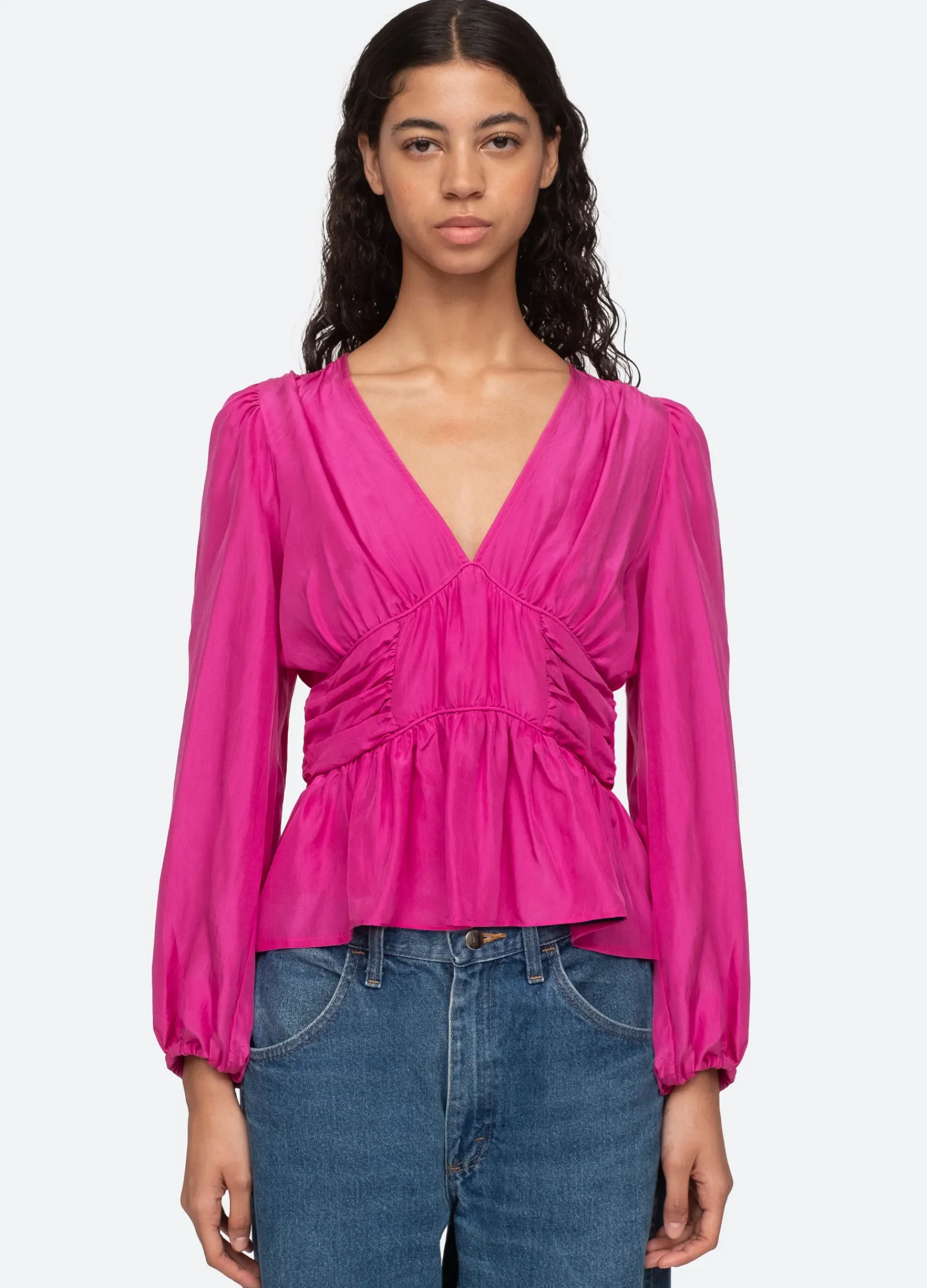 The Fabiola silk habotai top features a v-neckline, long puff sleeves and ruched and smocked detailing.