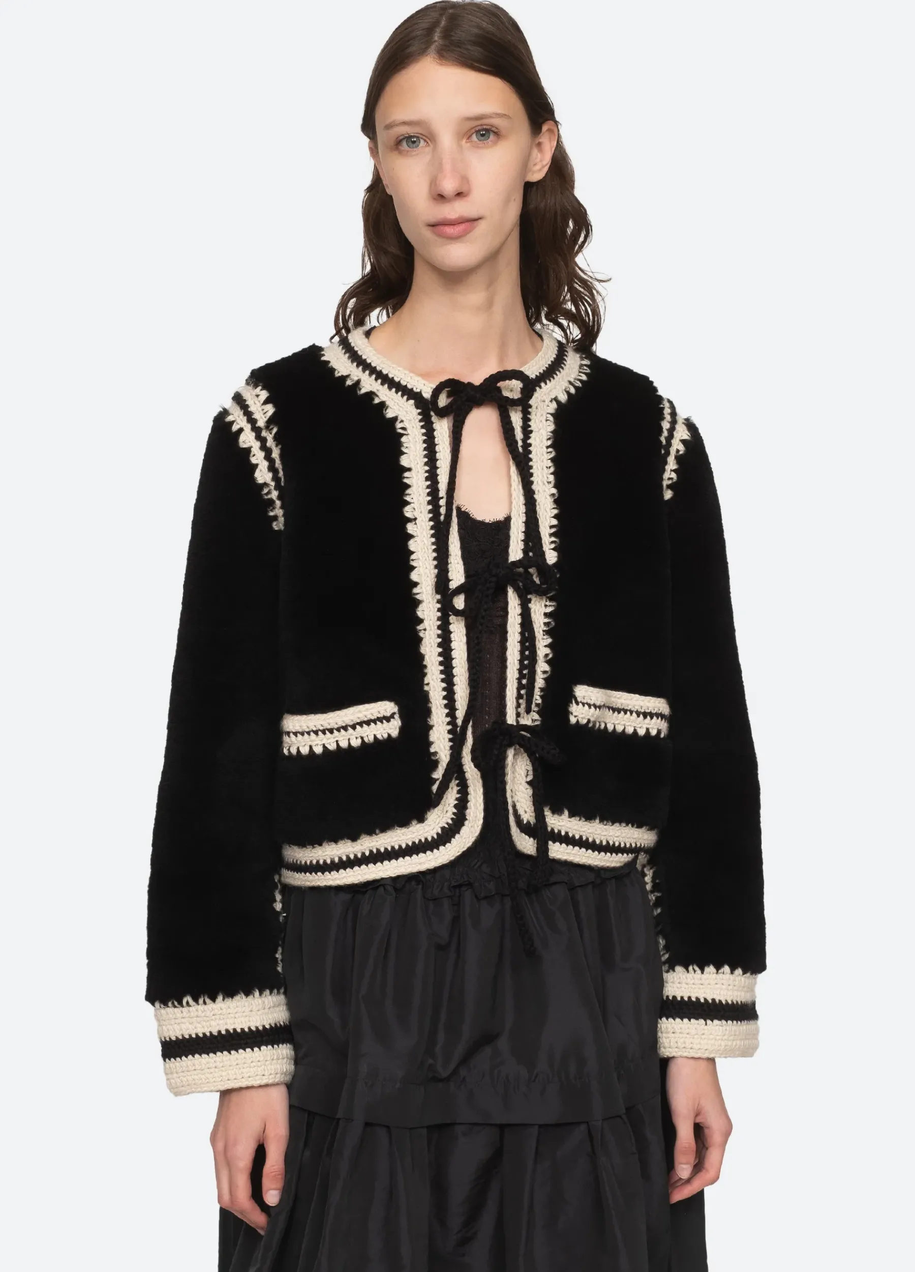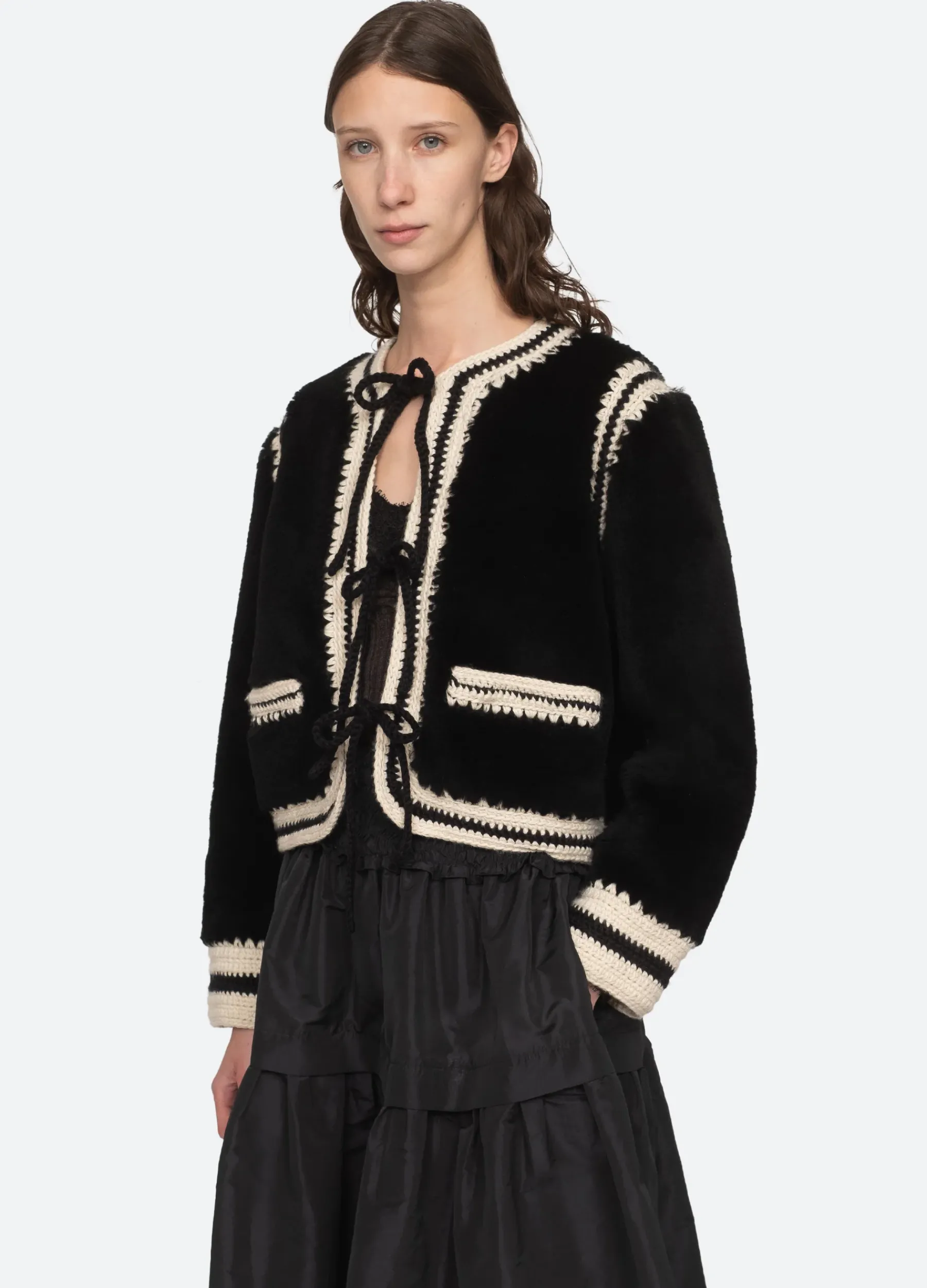 The Harper faux fur jacket features crochet trim detailing and tie front closures.