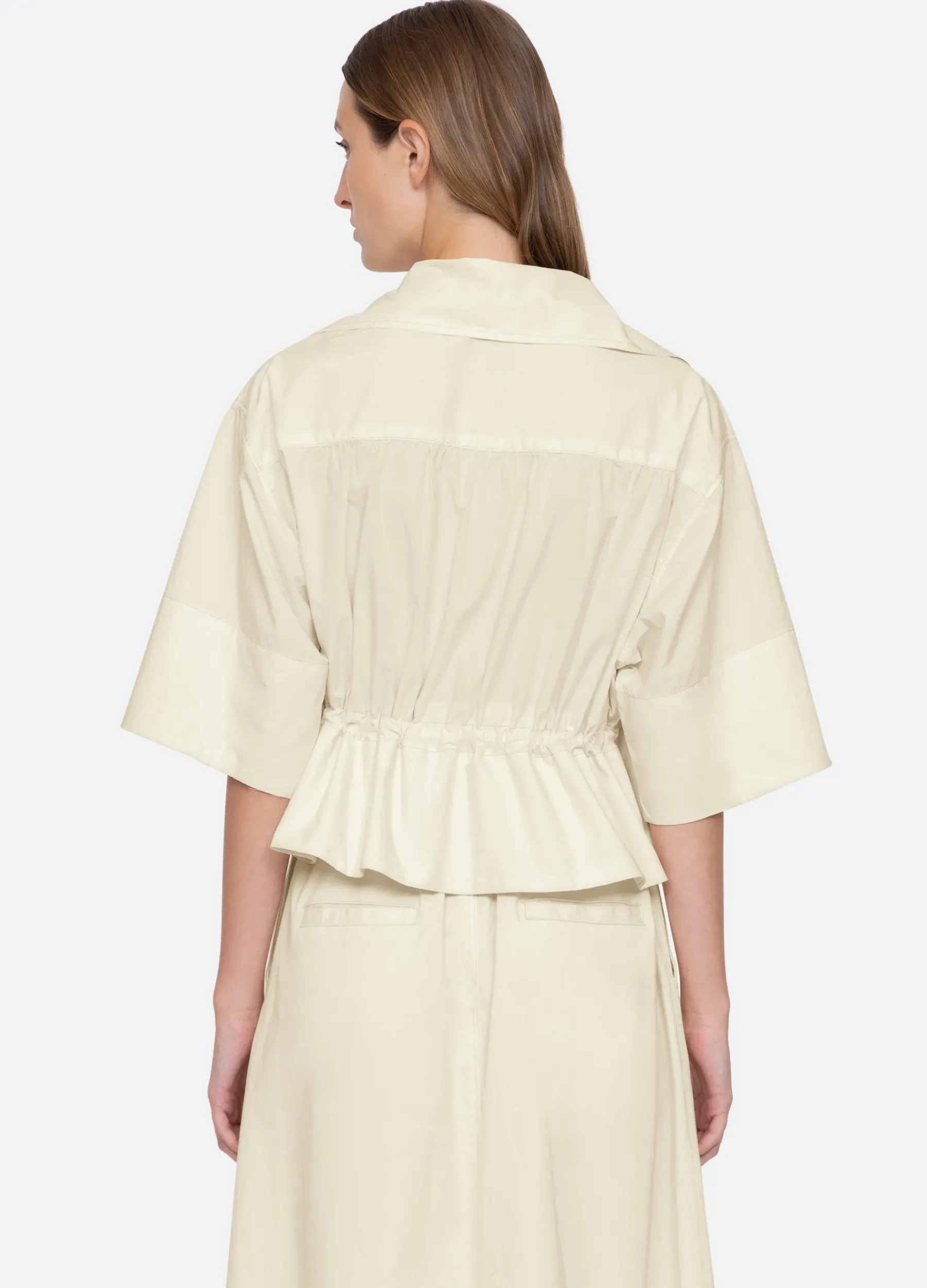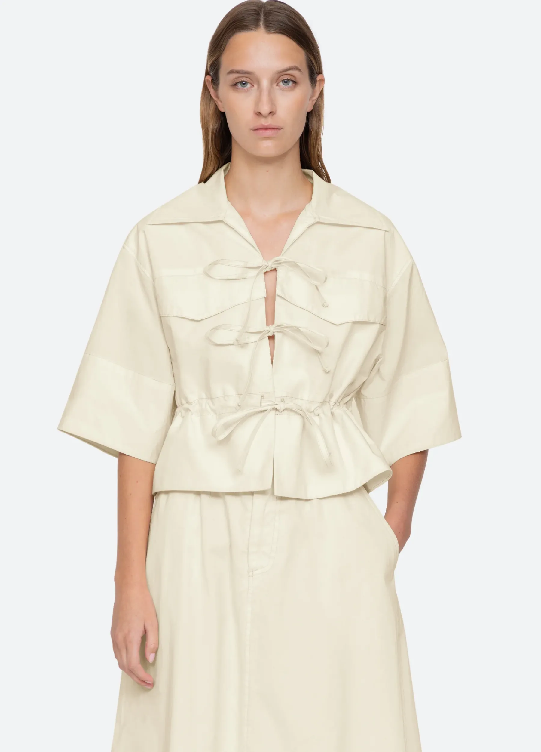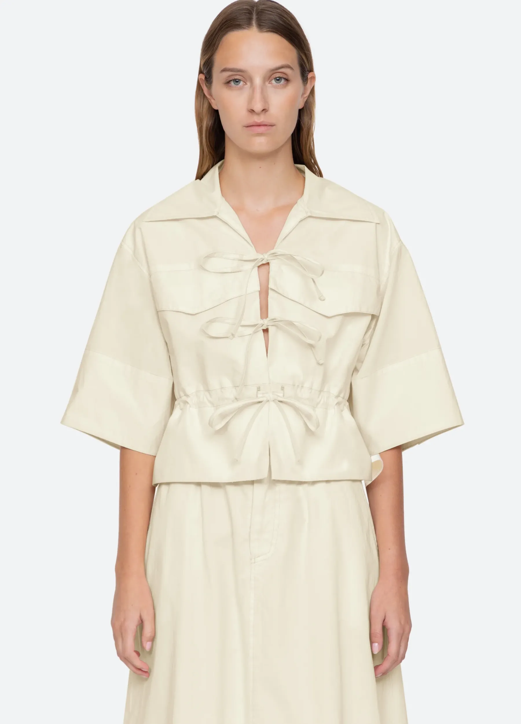 The Karina tie front top features voluminous sleeves, elasticized waist and front tie closures.