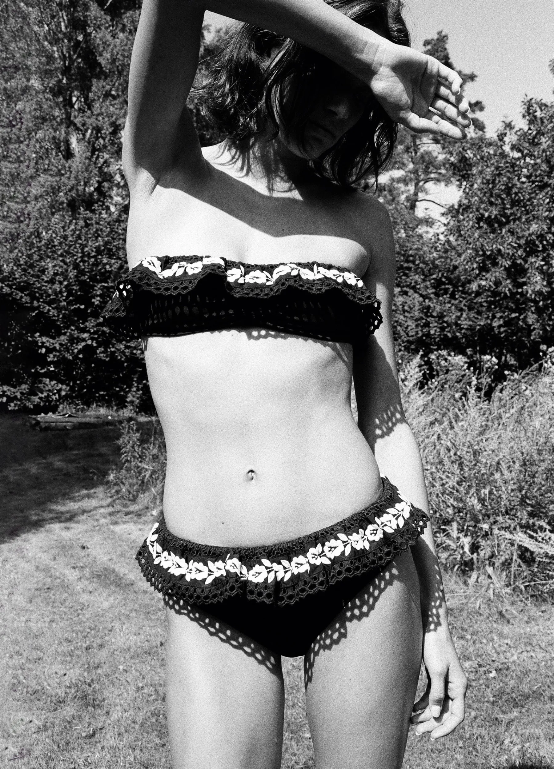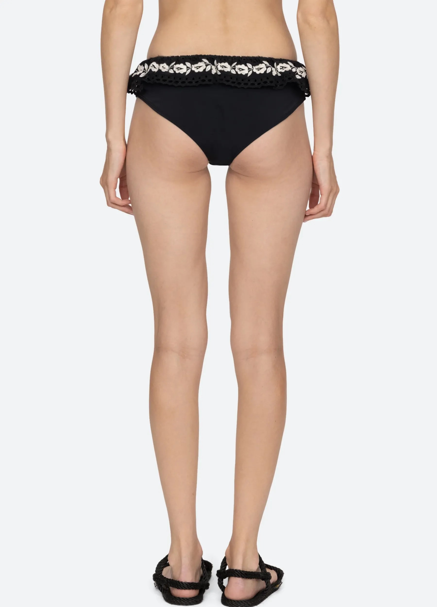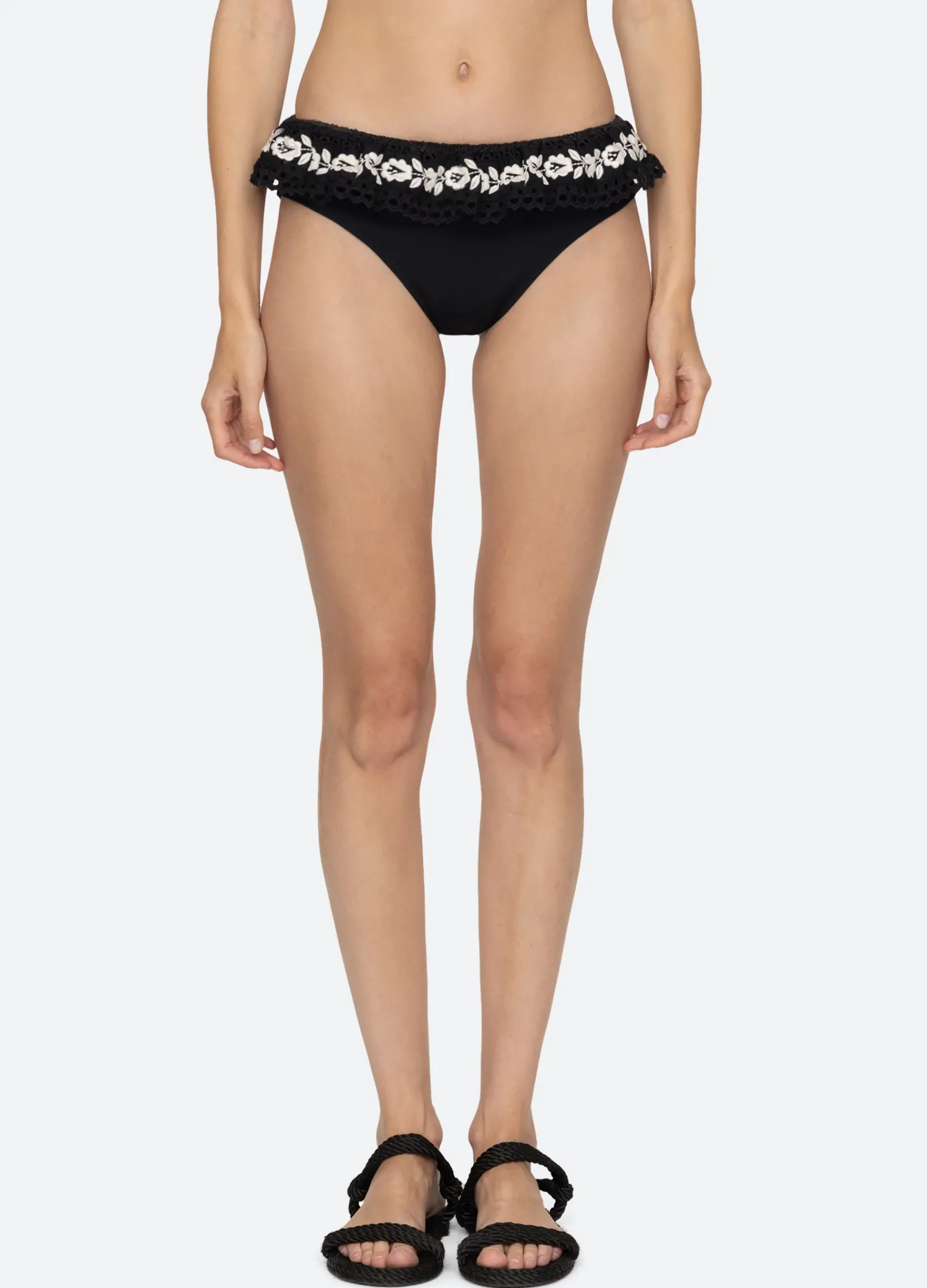 The Kayta embroidered ruffled bikini bottom features a ruffle tier and floral embroidered trim.