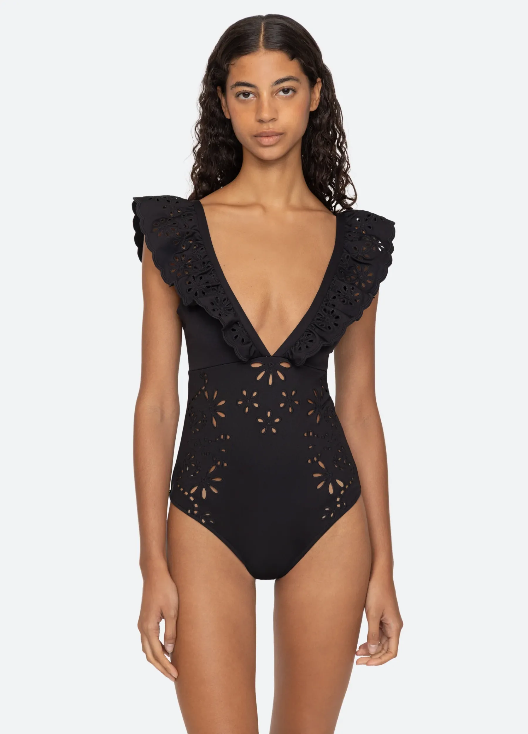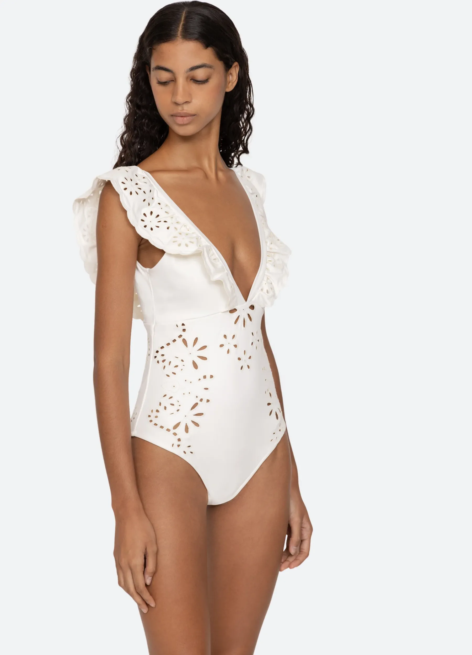 The Liat eyelet one piece swimsuit features a plunging neckline traced with ruffle and floral embroidered detailing.