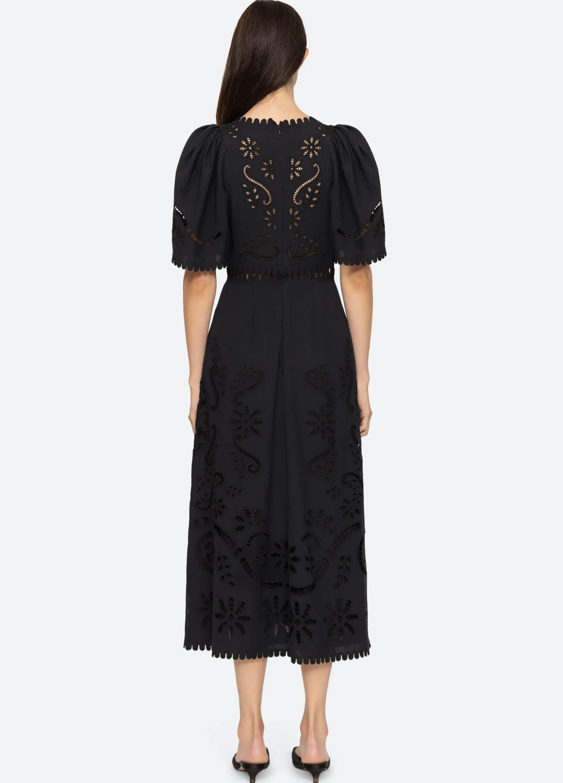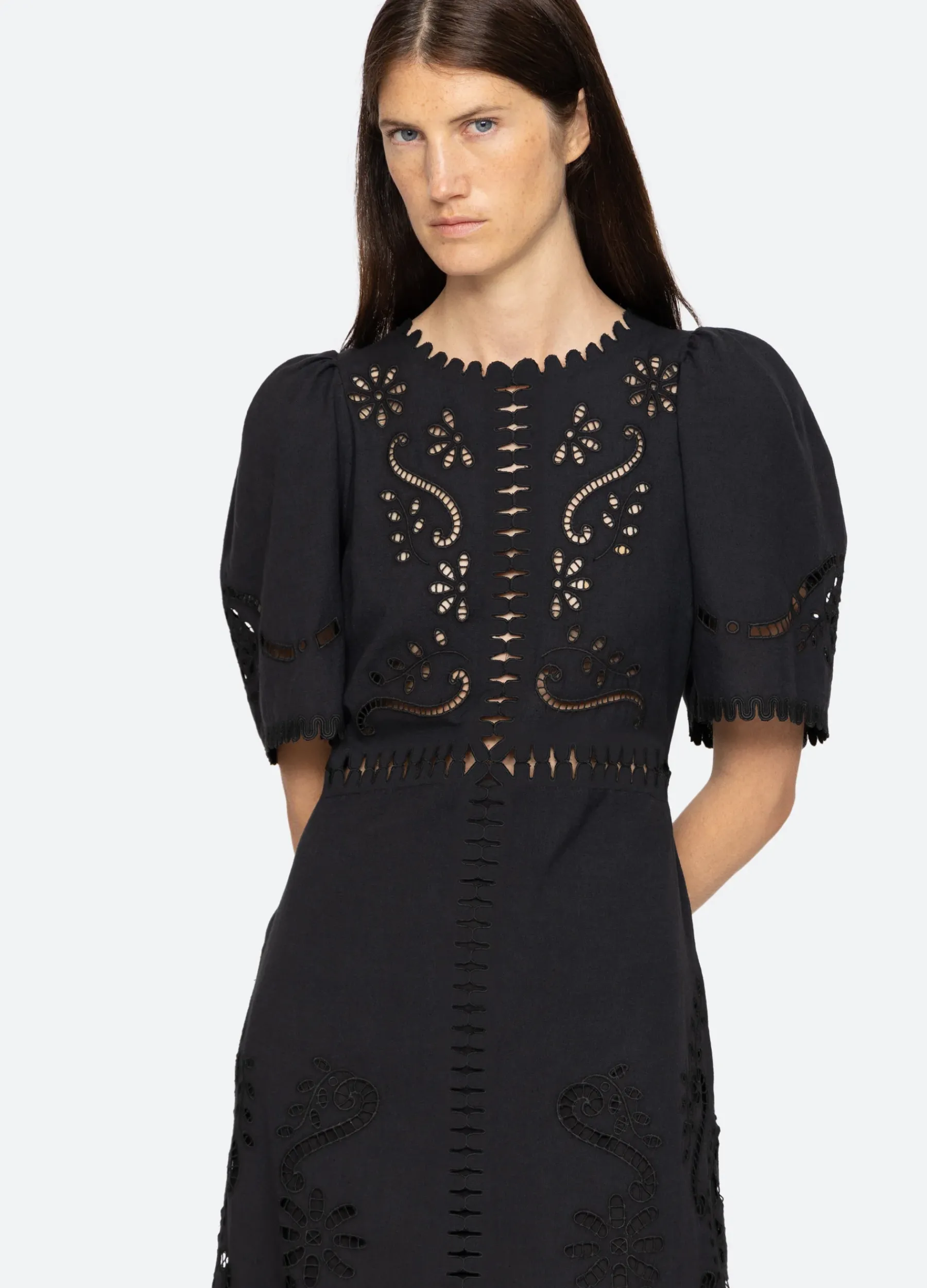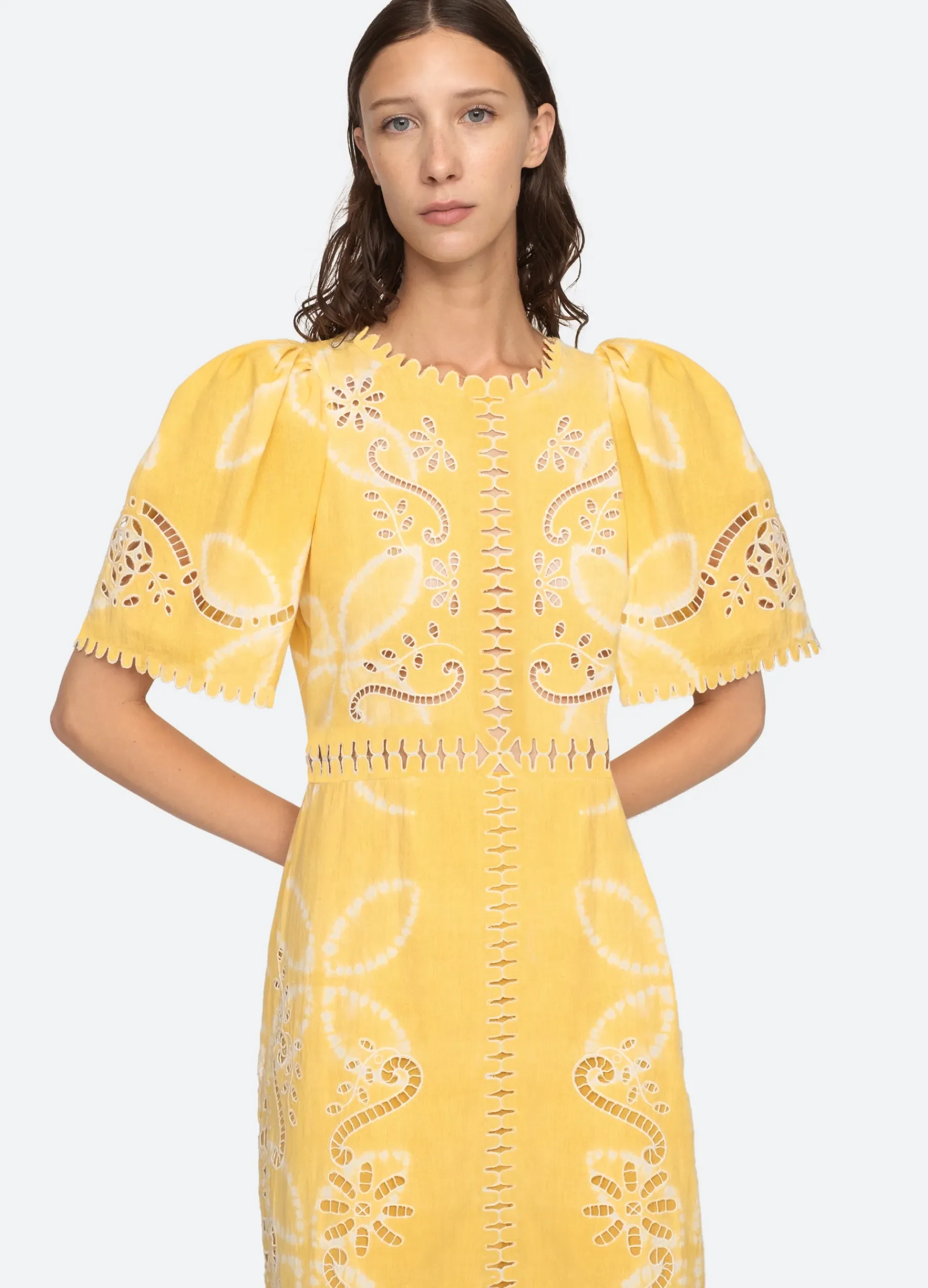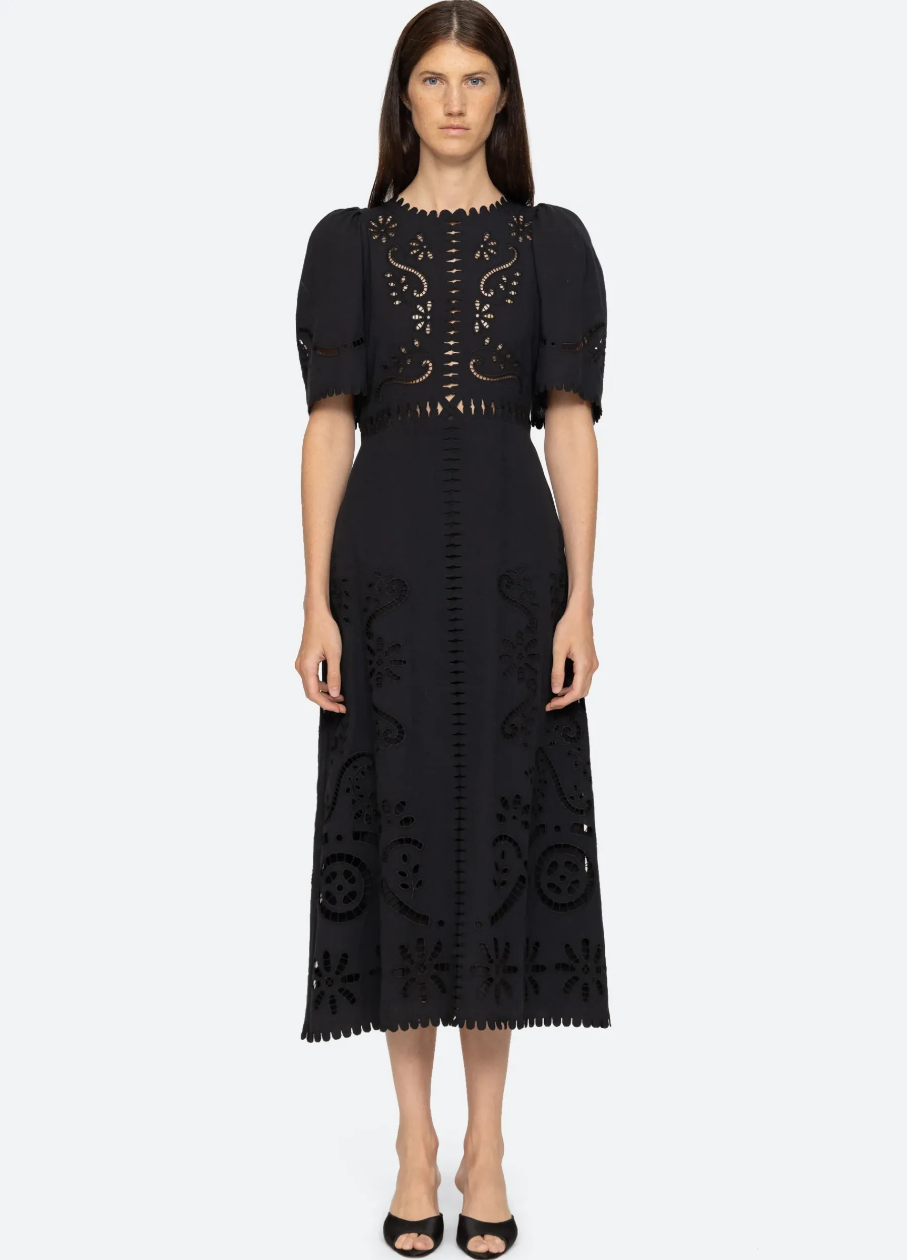 The Liat short sleeve embroidered dress features eyelet floral detailing, cutout accents and scalloped trim detailing.