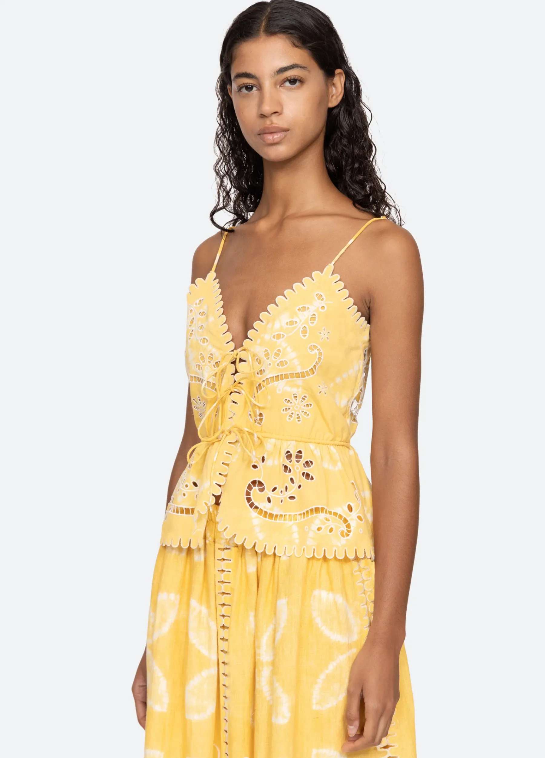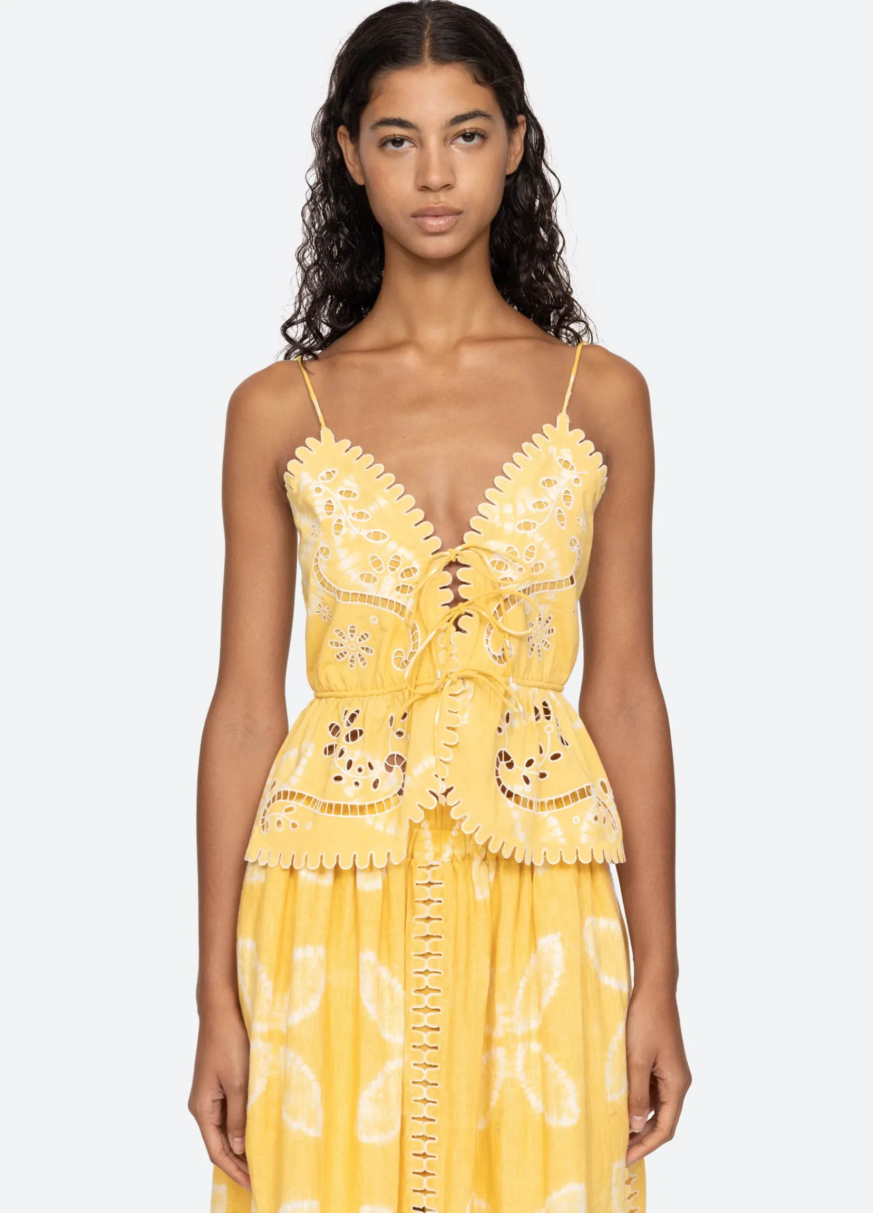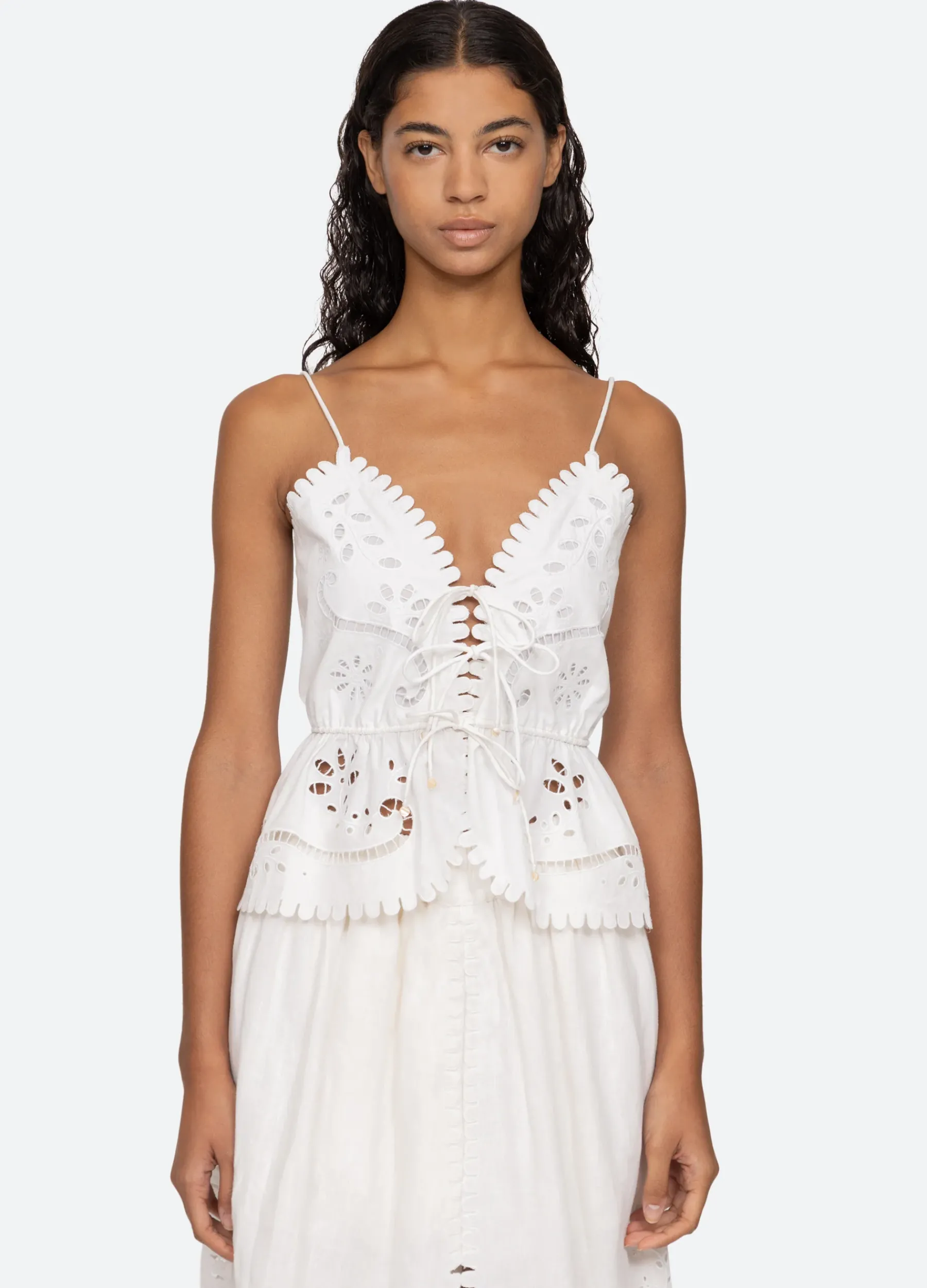 The Liat embroidered cami top features floral eyelet detailing, scalloped trim and front tie closure.