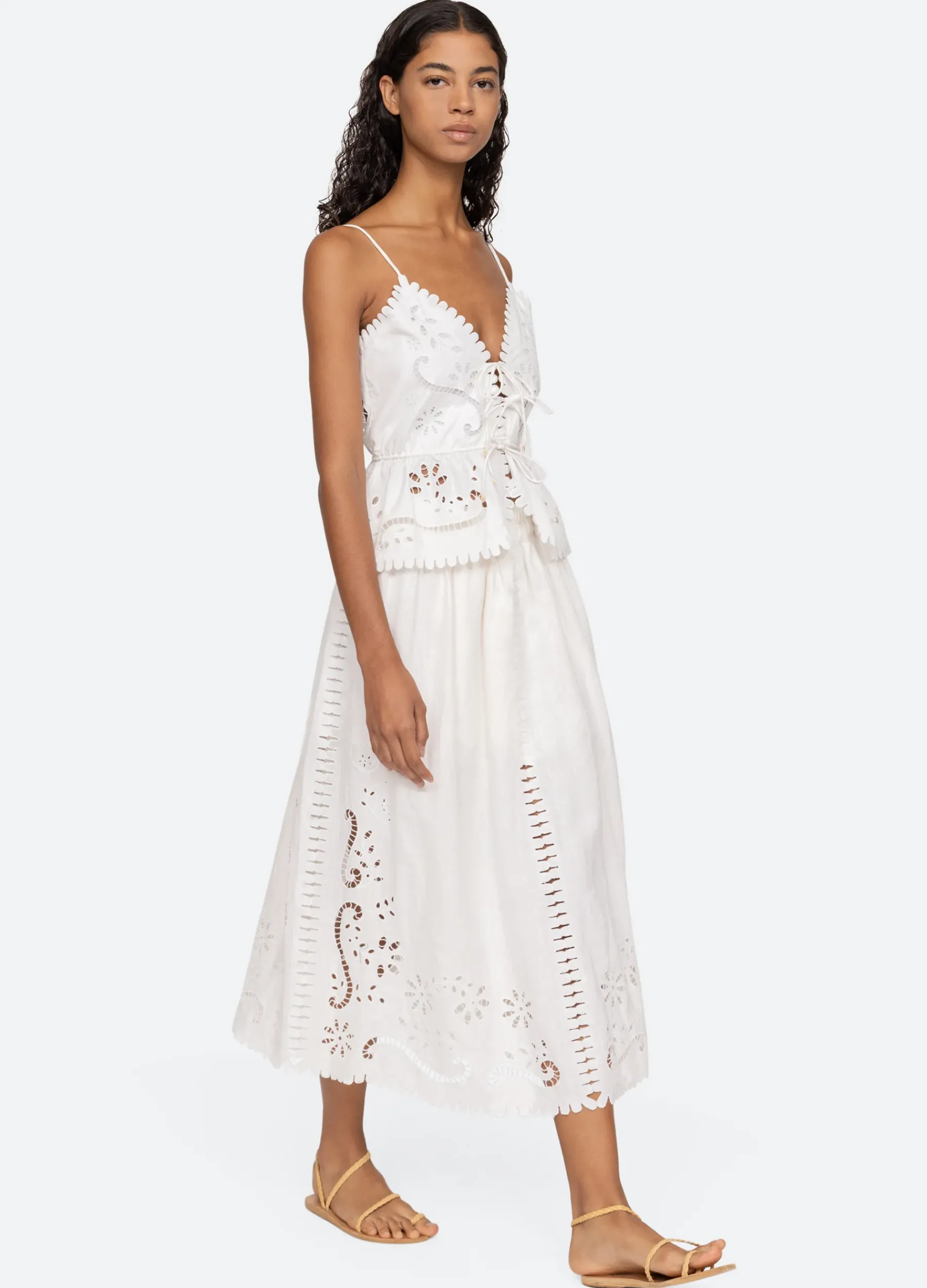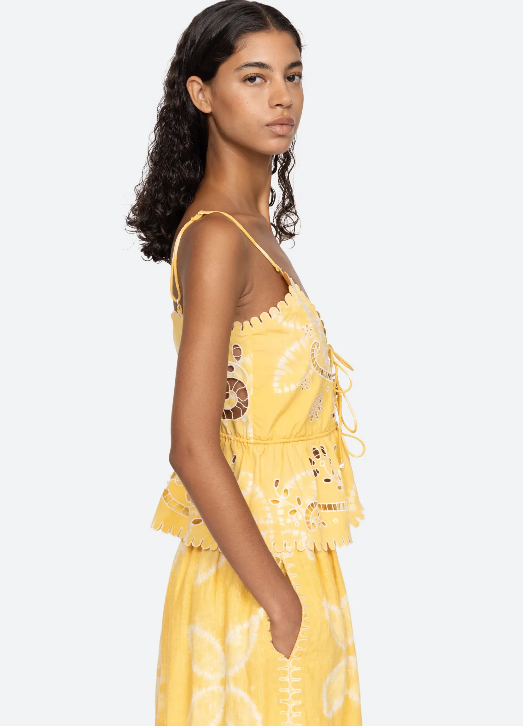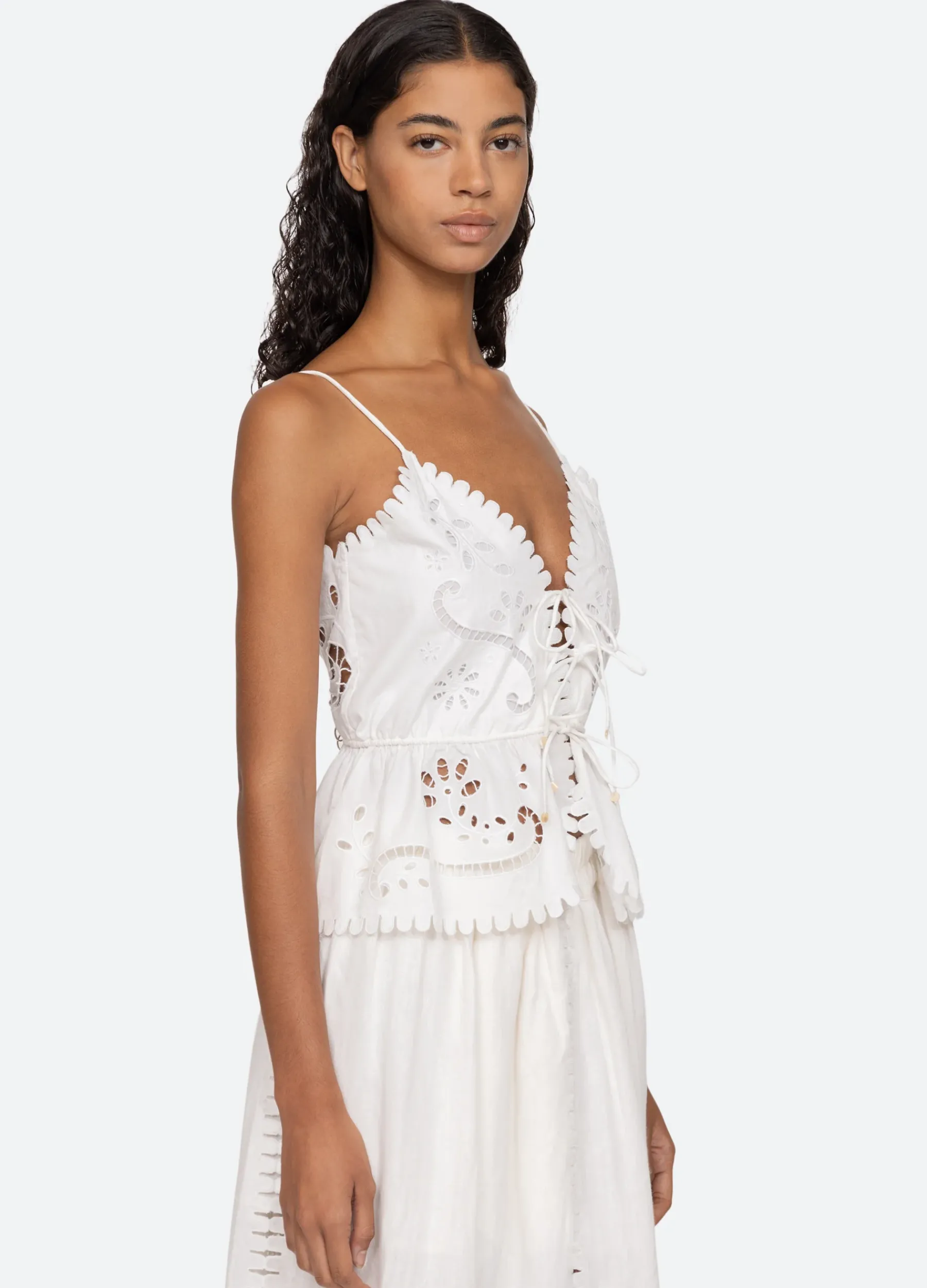 The Liat embroidered cami top features floral eyelet detailing, scalloped trim and front tie closure.