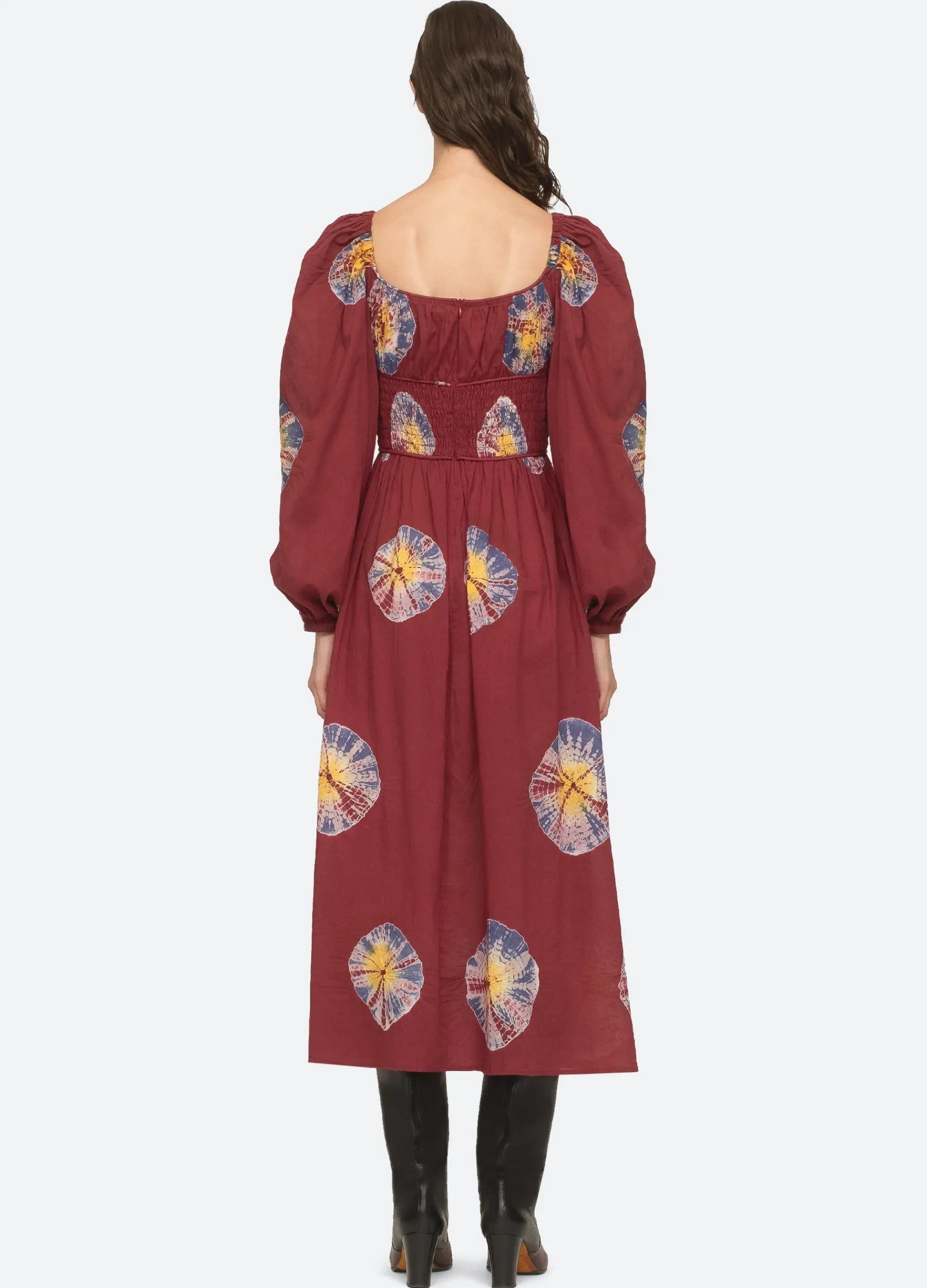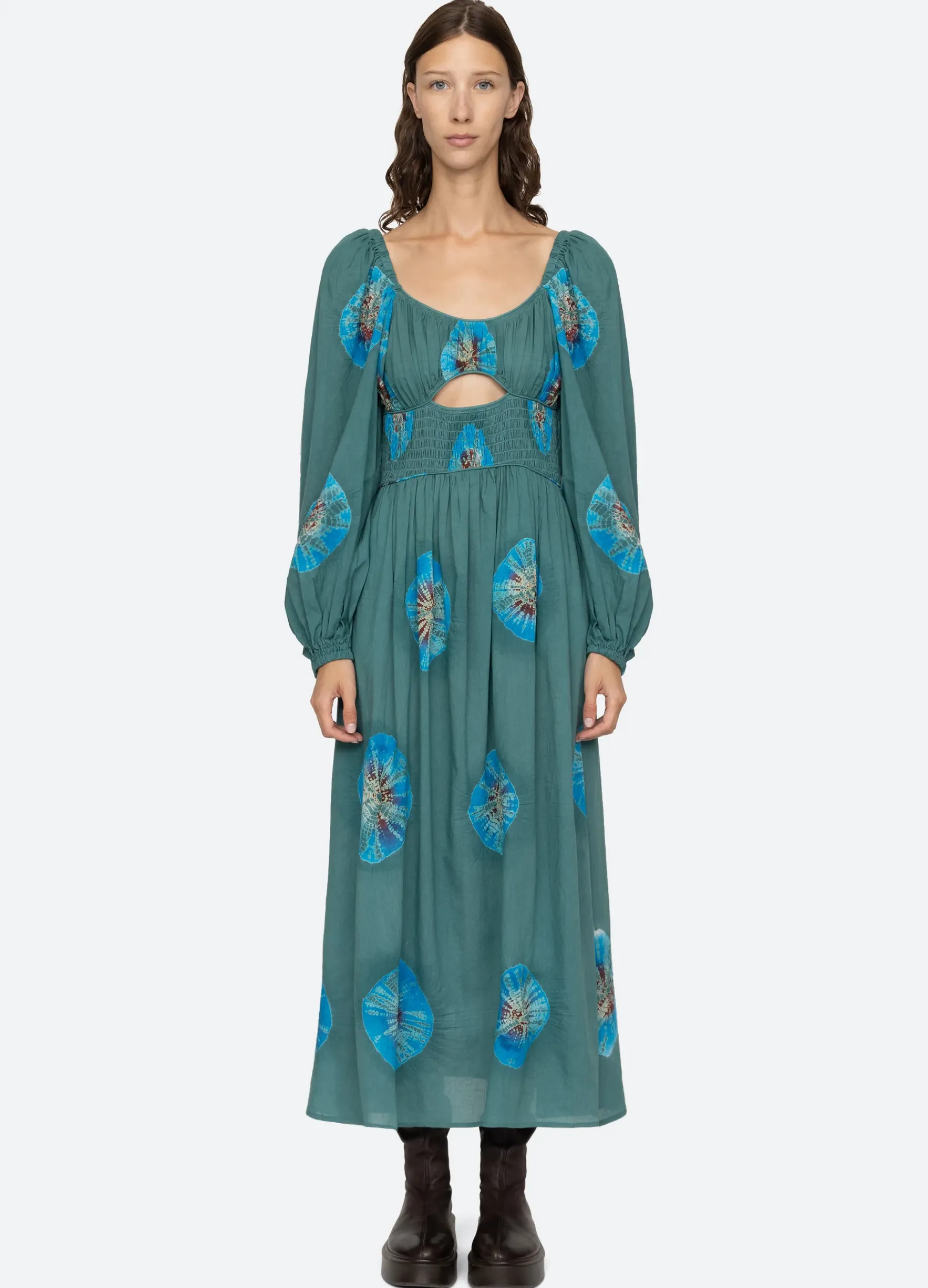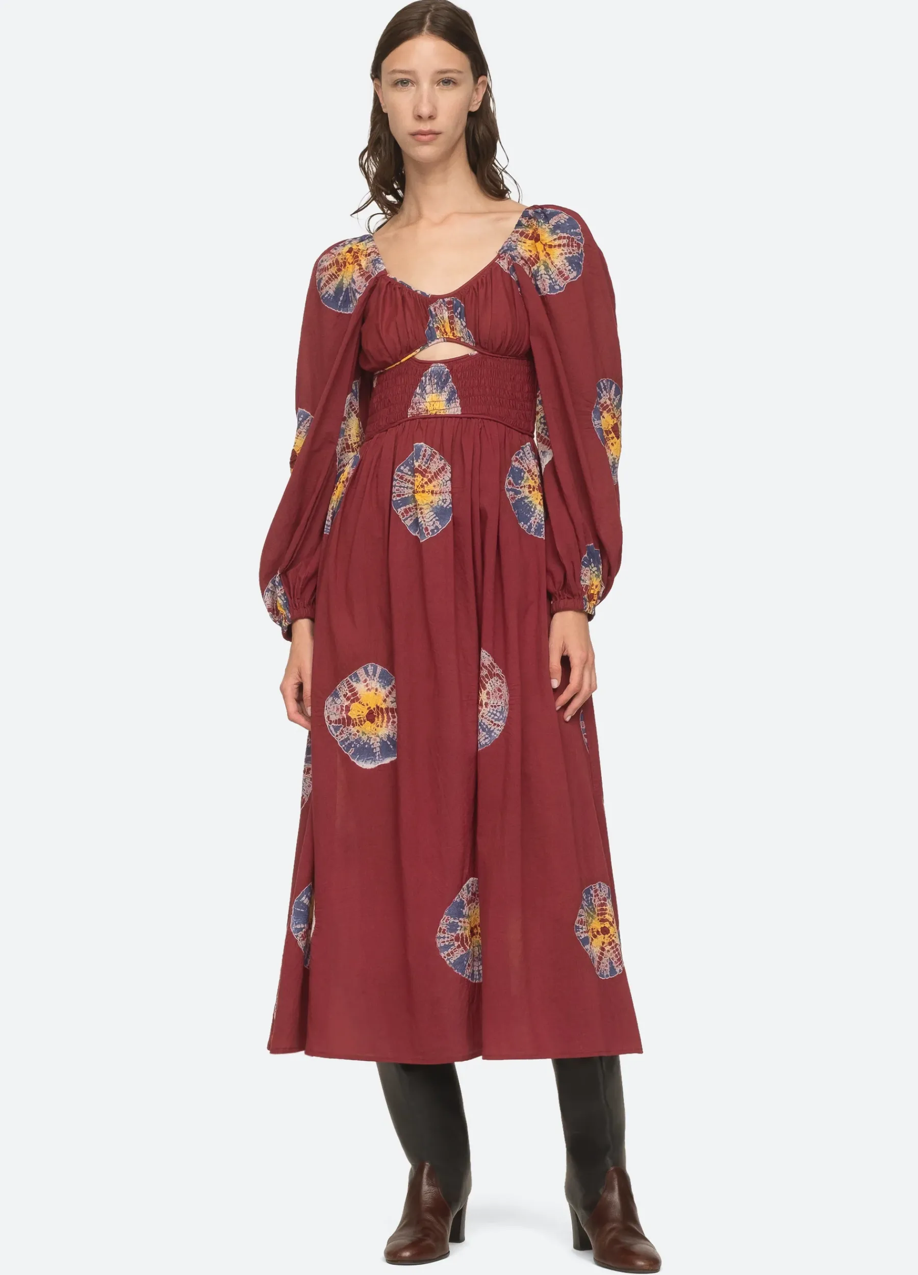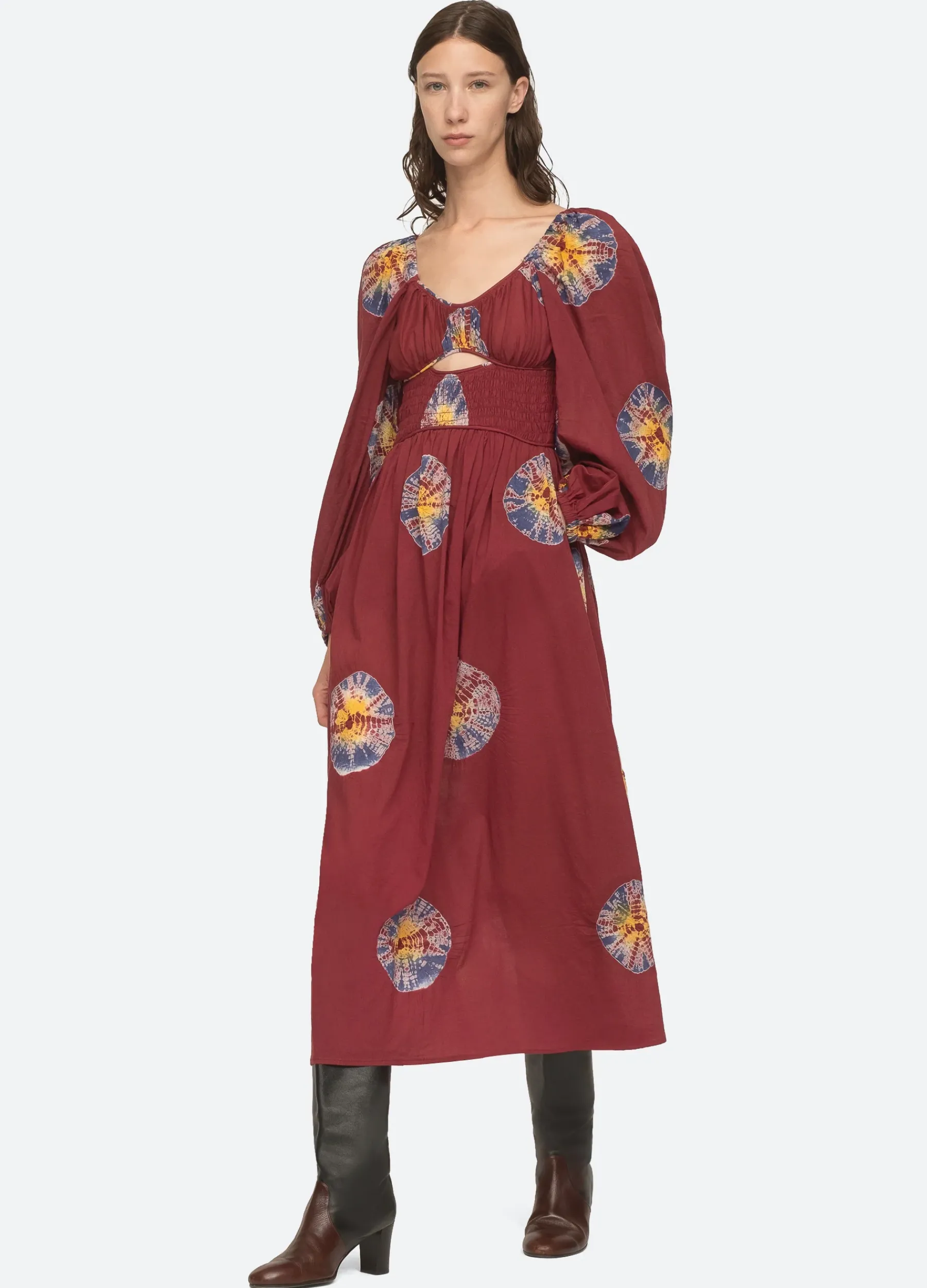 The Lourdes tie dye long sleeve dress features long puff sleeves, cutout accent and smocked detailing.