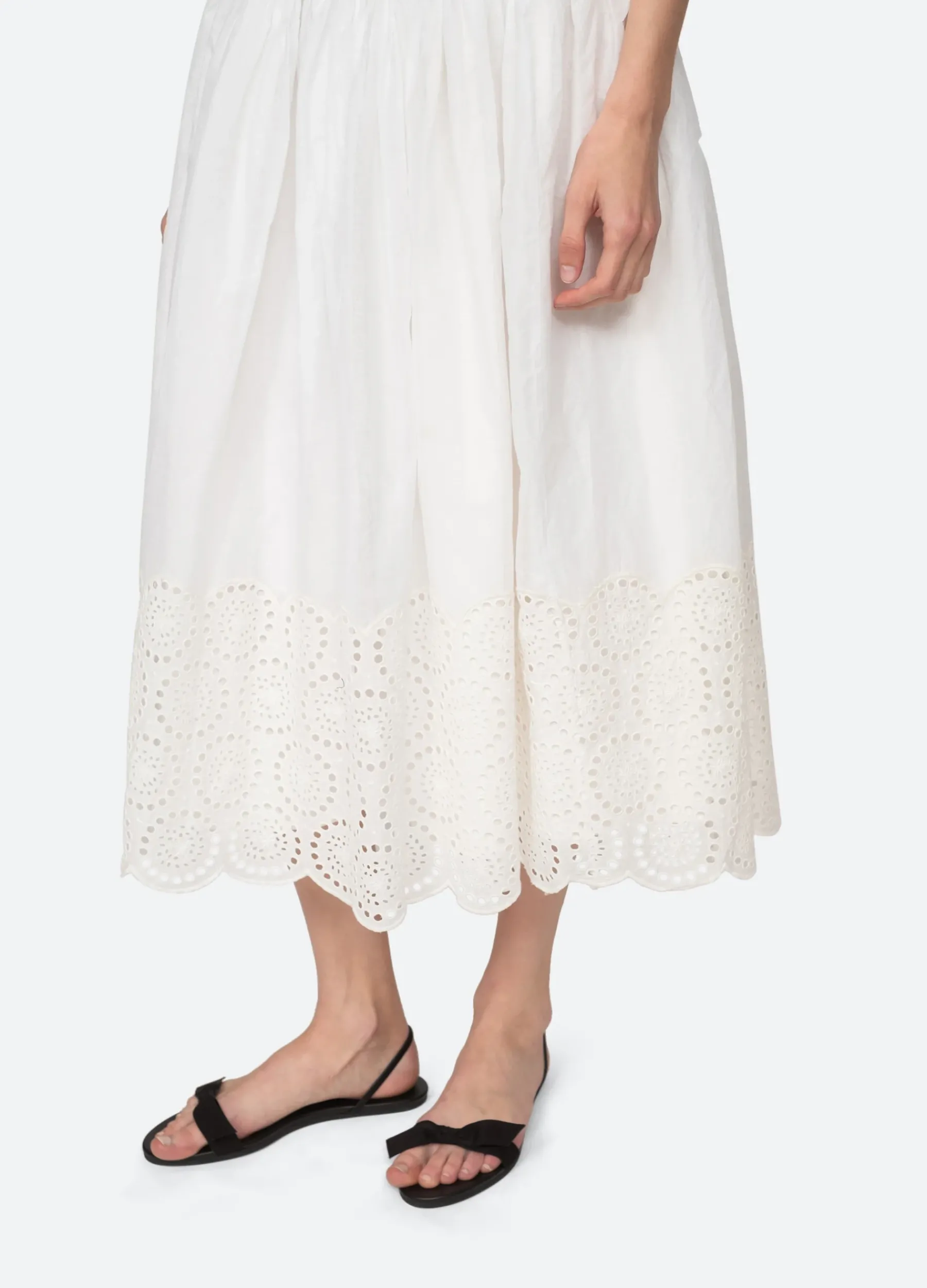 The Maeve eyelet dress features a dropped waist silhouette with full skirt.