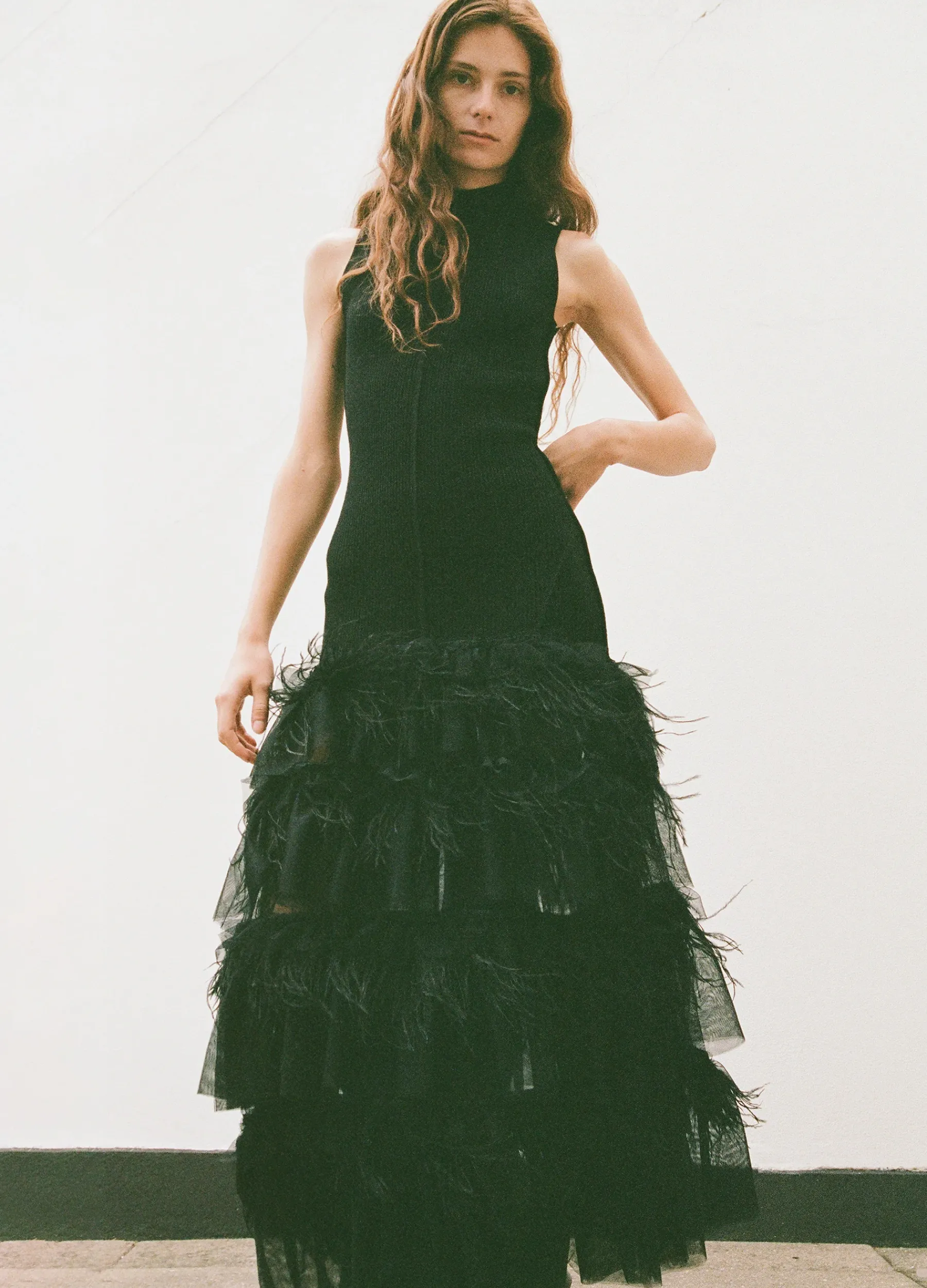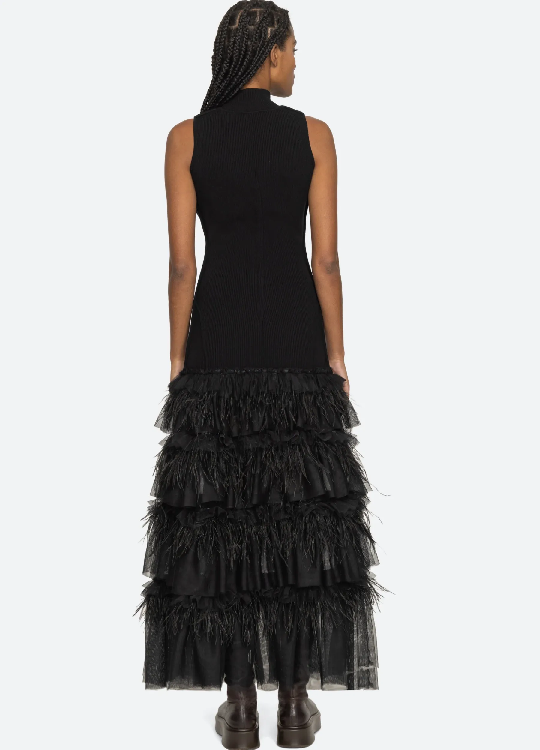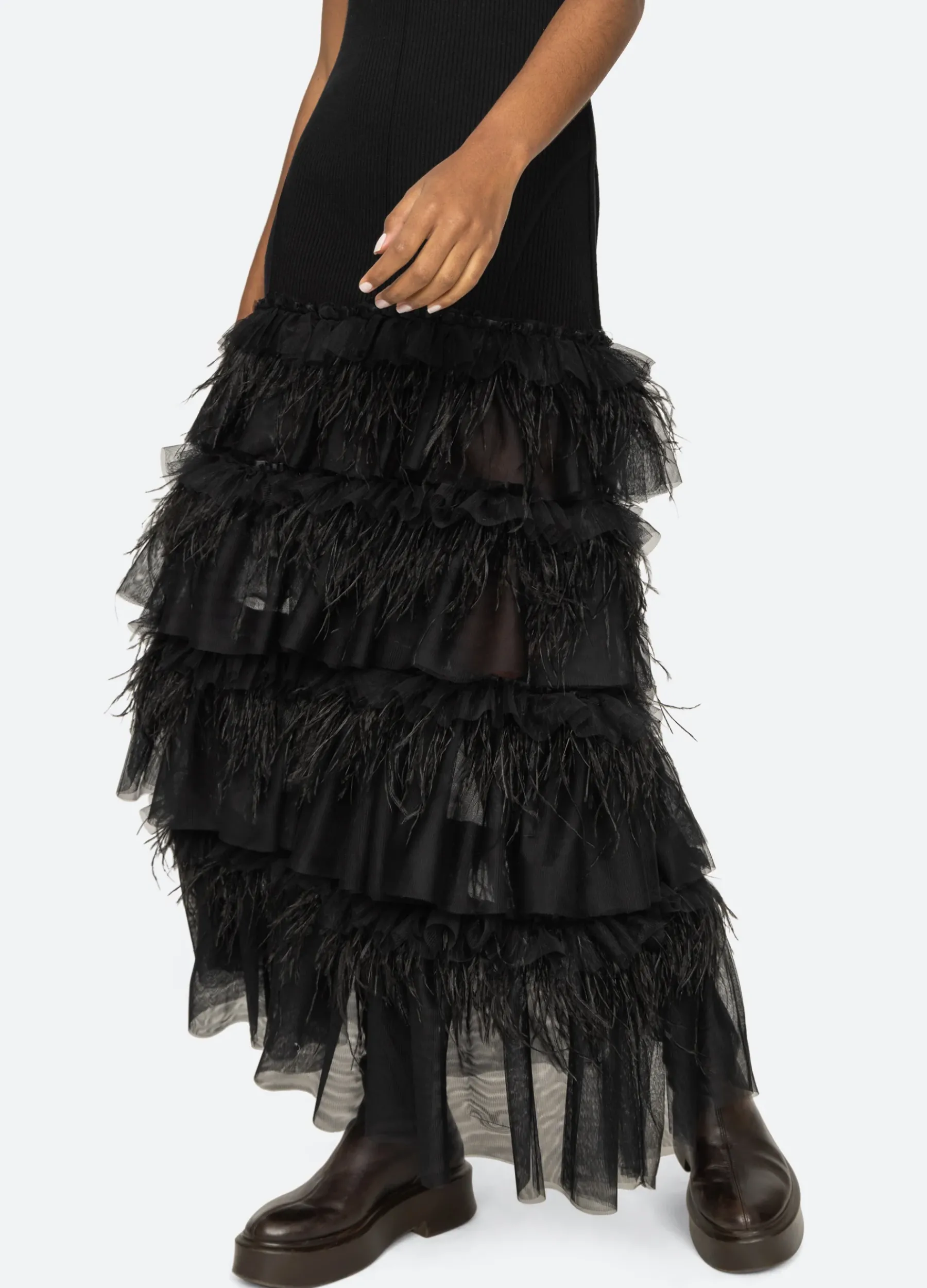 The Misha combo knit maxi dress is trimmed with tiers of tulle and ostrich feathers.