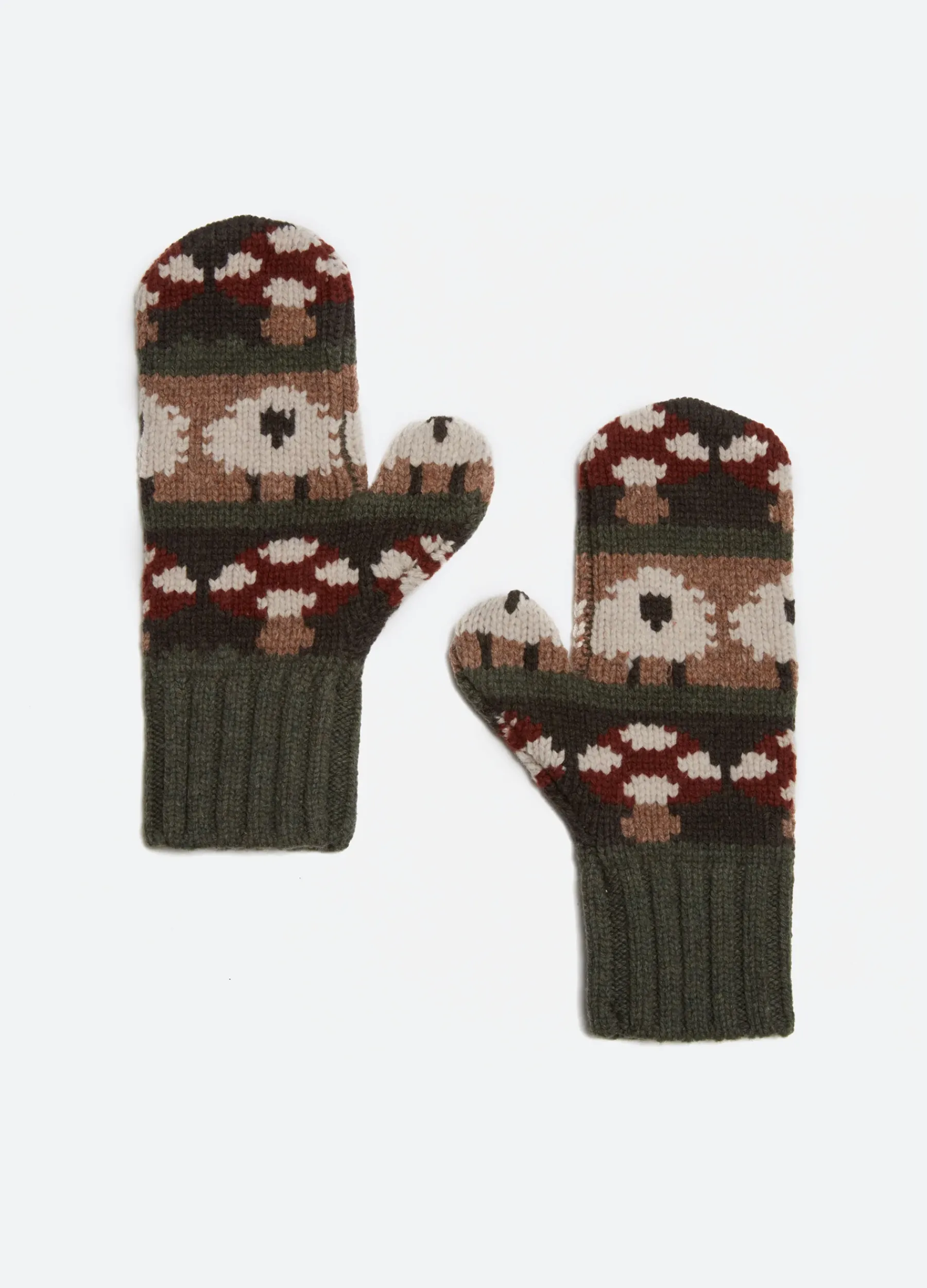 The Molly mittens feature a playful sheep and mushroom motif.