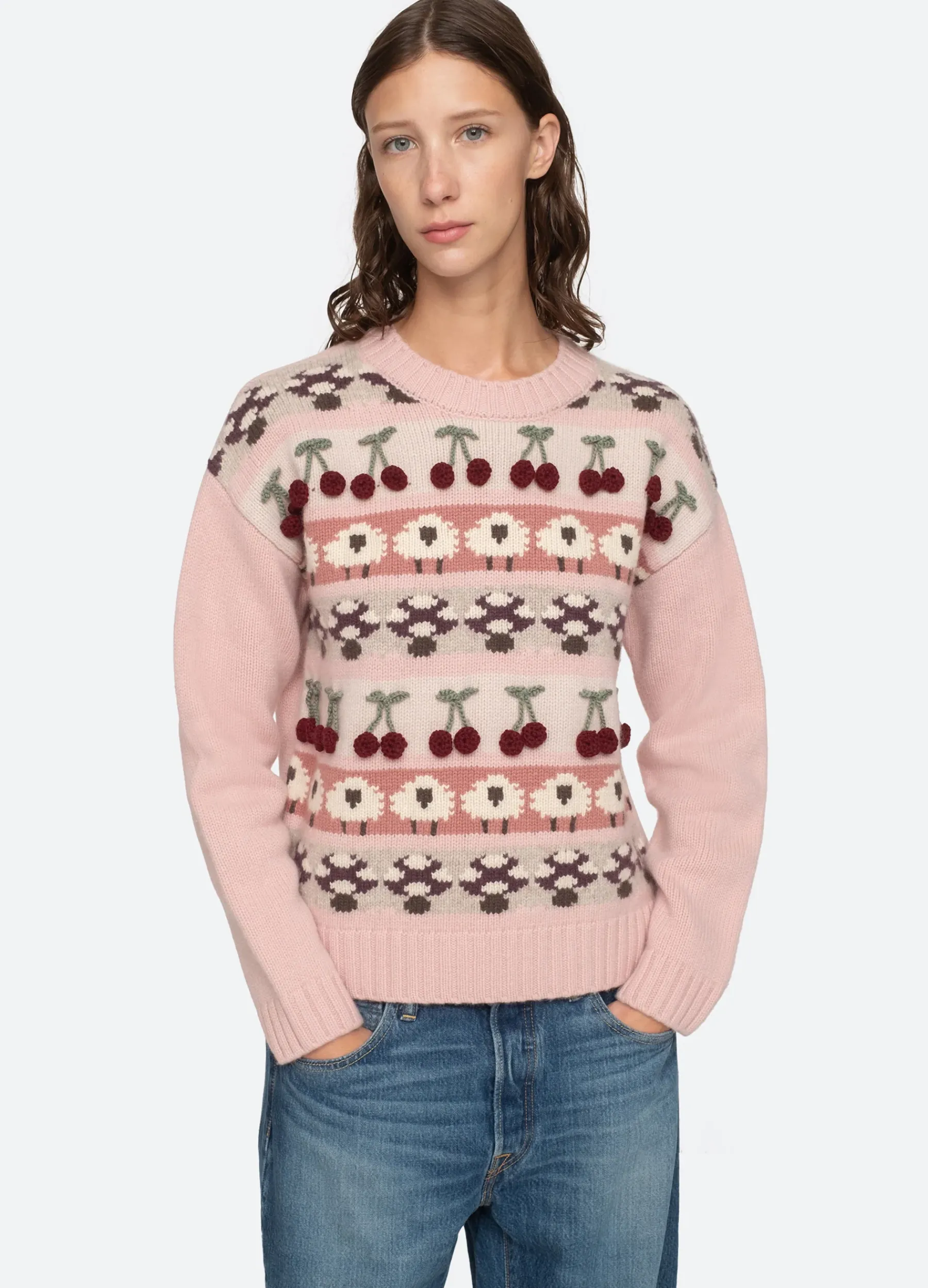 The Molly sweater features a playful motif of sheep, 3D cherries and mushrooms.