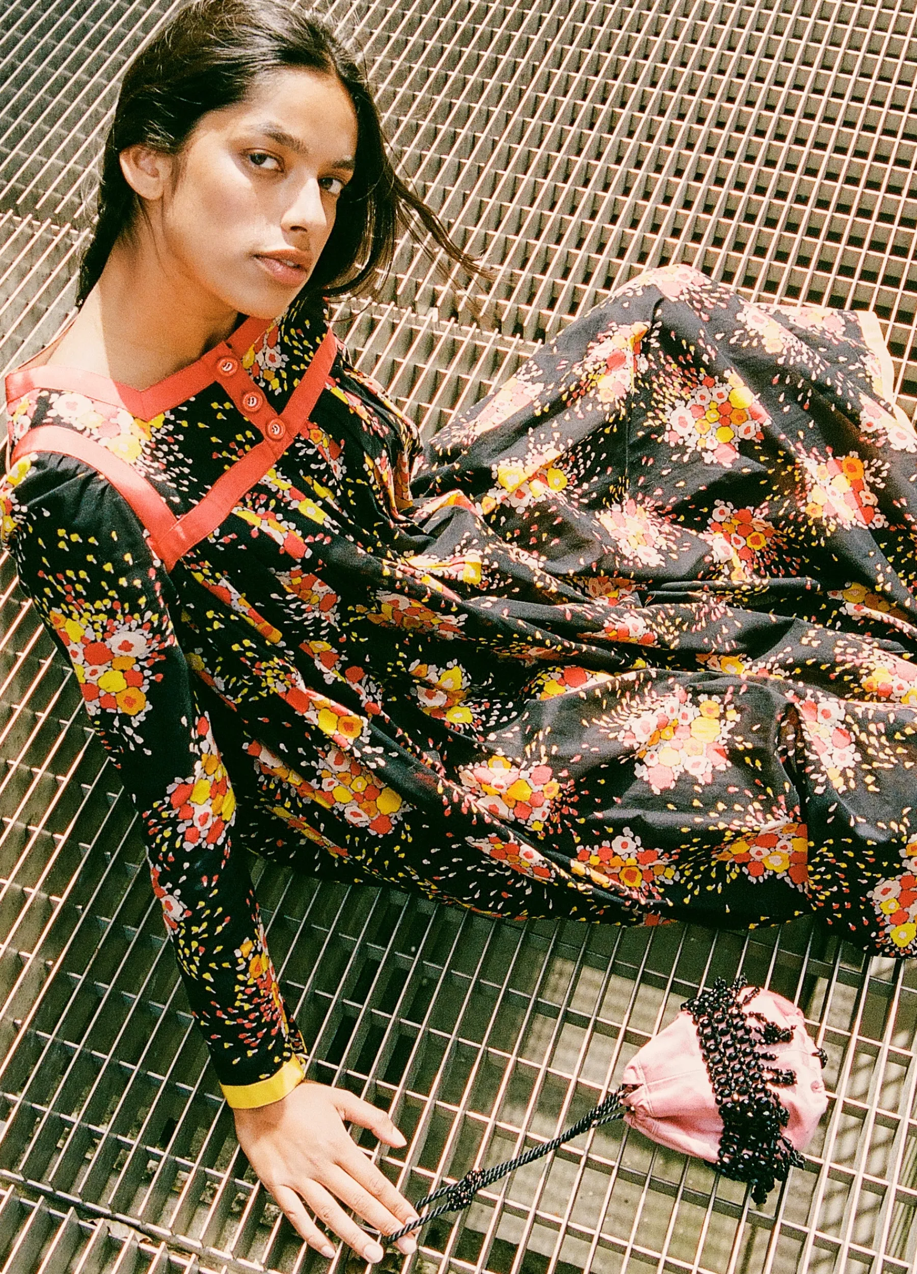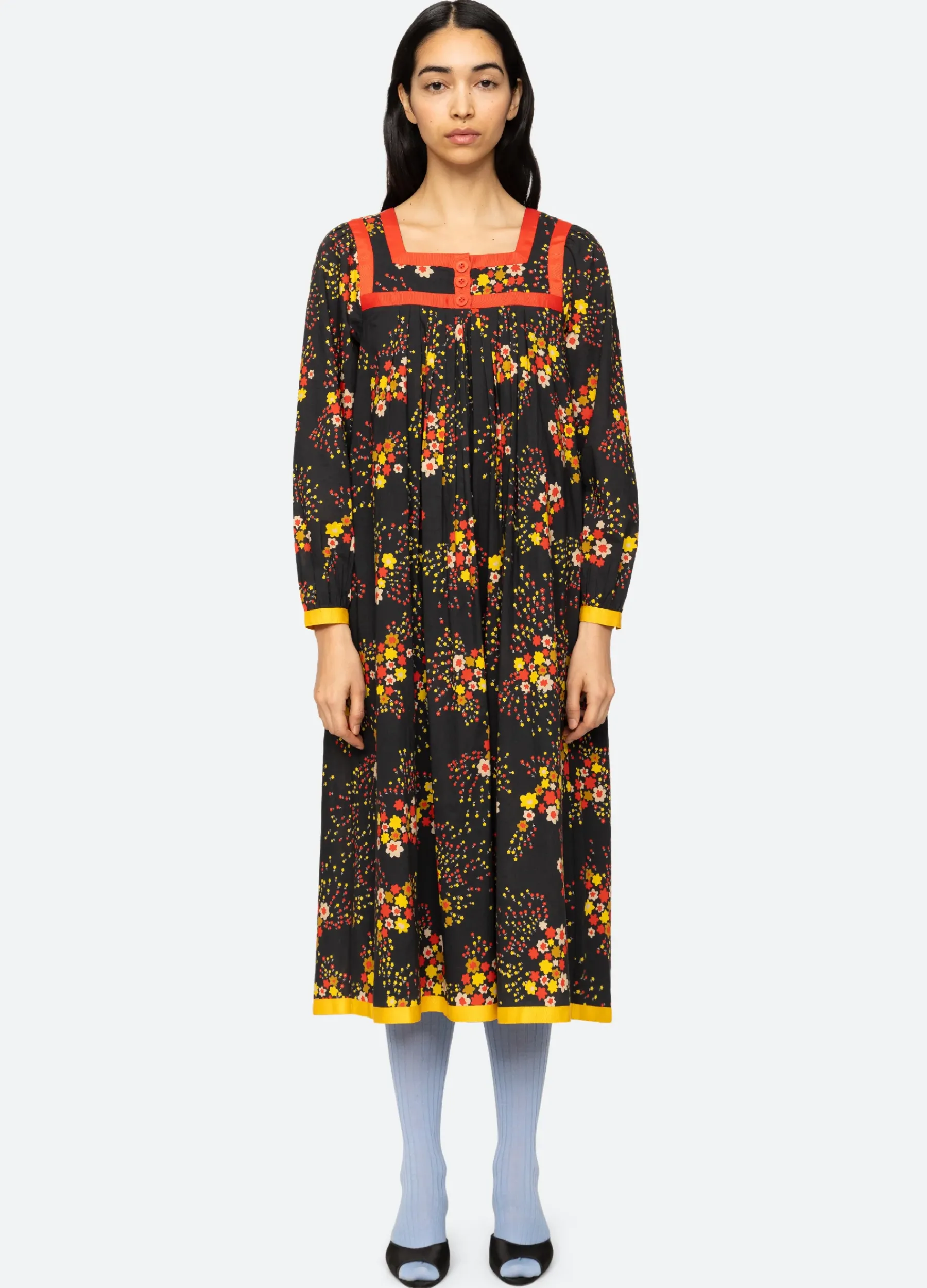 The Paloma Vintage x Sea collection was born from Monica and Ferial’s shared passion for vintage. Monica discovered Paloma Vintage on a trip to Copenhagen and immediately was drawn to the shop’s unique curation of vintage treasures. Over the years, Monica forged a friendship with Ferial which led to designing a capsule collection together inspired by Ferial’s vintage finds and unique styling sensibility. The Paloma flora dress features a square neckline, long sleeves and solid trim detailing. Designed for an oversized fit.