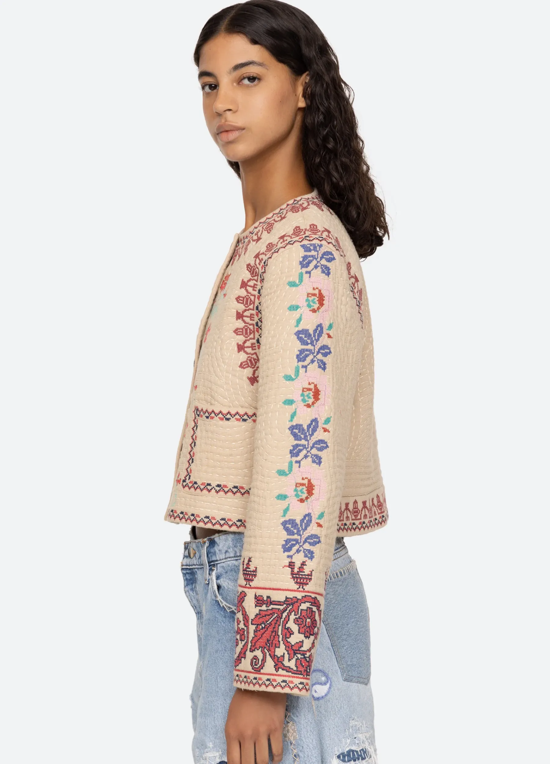 The Ramona embroidered jacket features cross stitch embroidery, cropped silhouette and front button closure. Designed for an easy, relaxed fit.