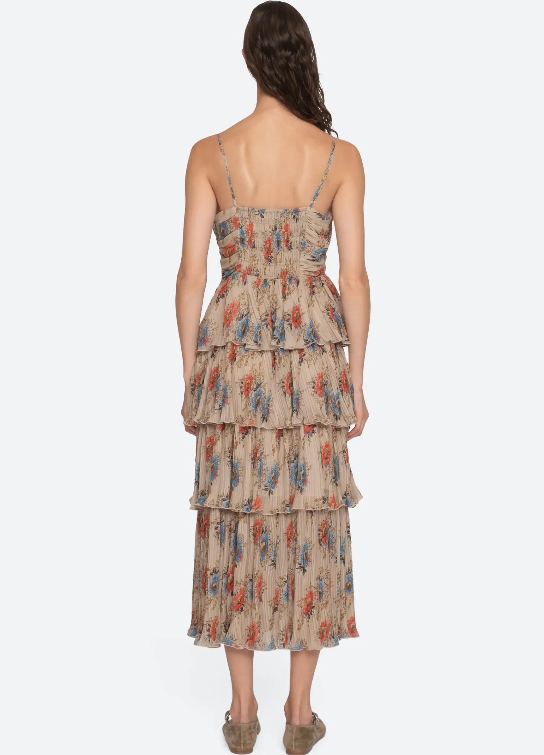 The Roanne floral print tiered dress features a ruched bodice, smocked back and tiered skirt.