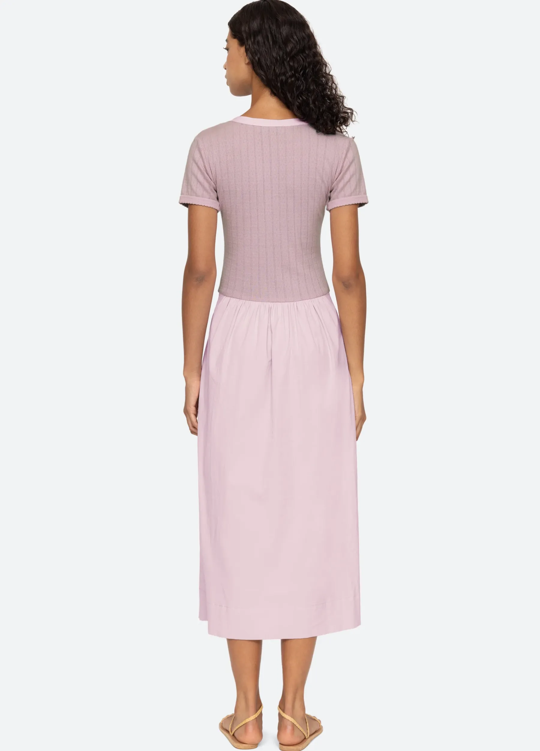 The Salome dress features short sleeves, ribbed bodice and button front closure.