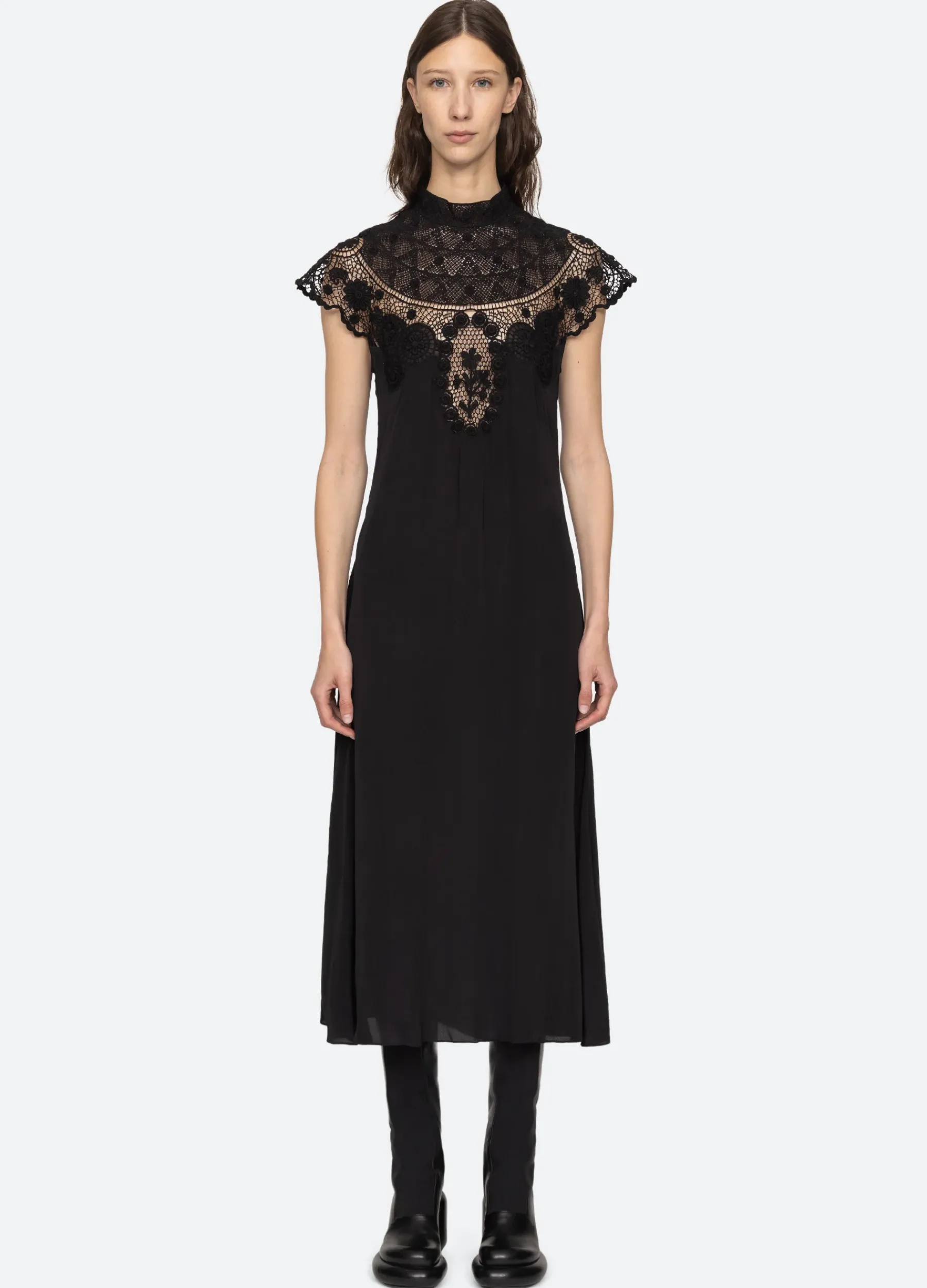 The Serita dress features intricate crochet lace detailing around the neckline and flutter sleeves.