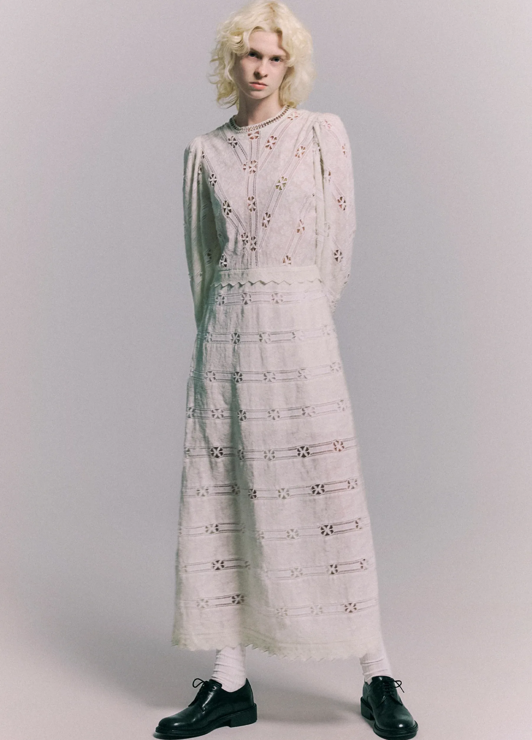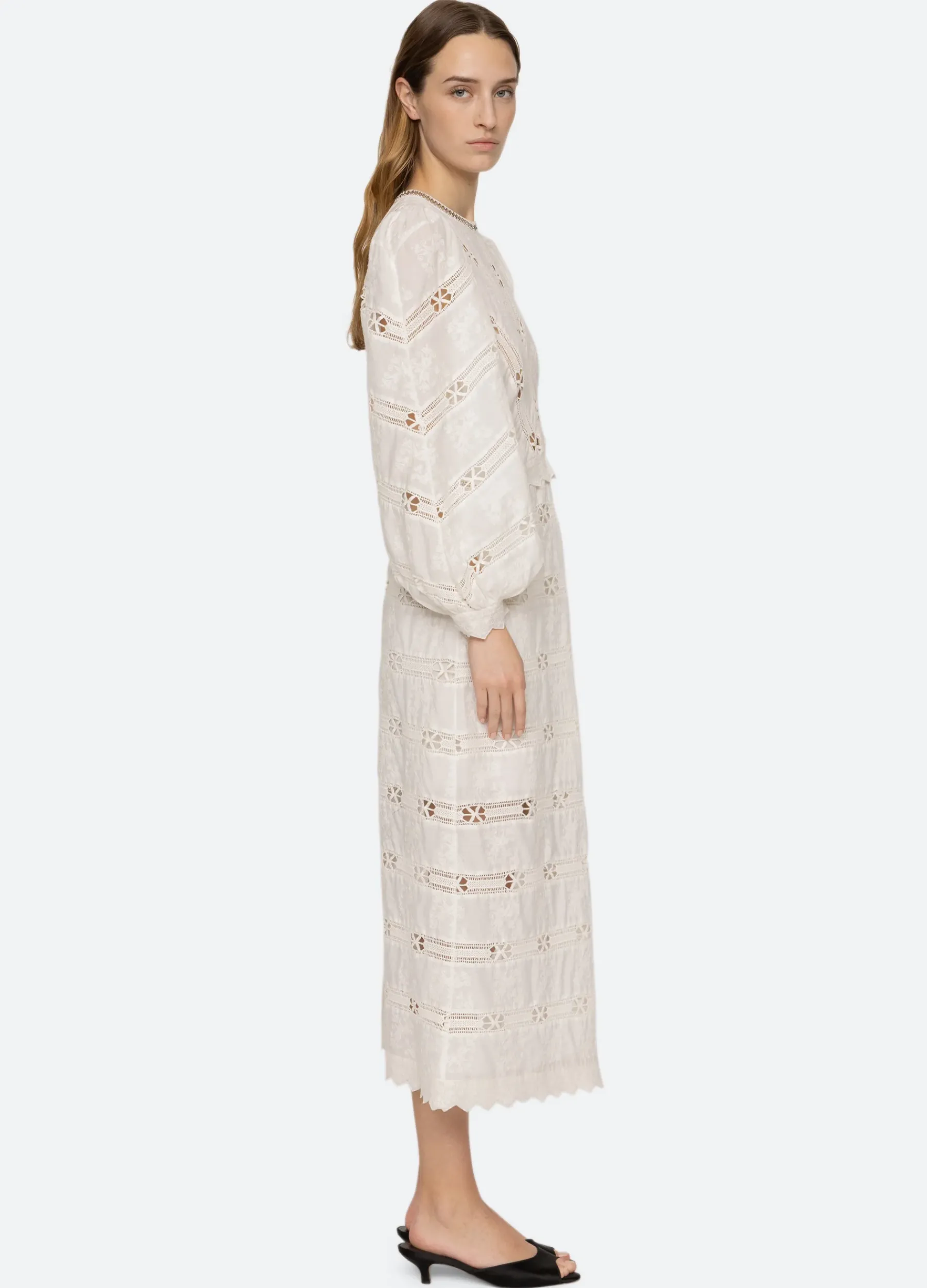 The Sharika embroidered lace dress features long puff sleeves, scalloped trim and crocheted metal chain accents.