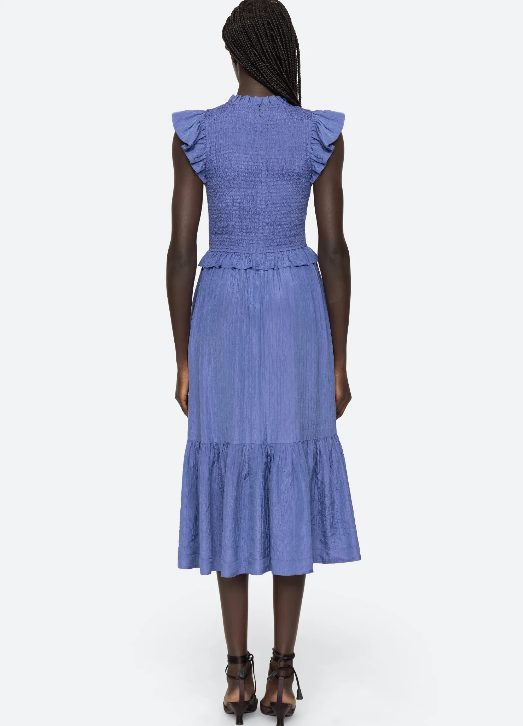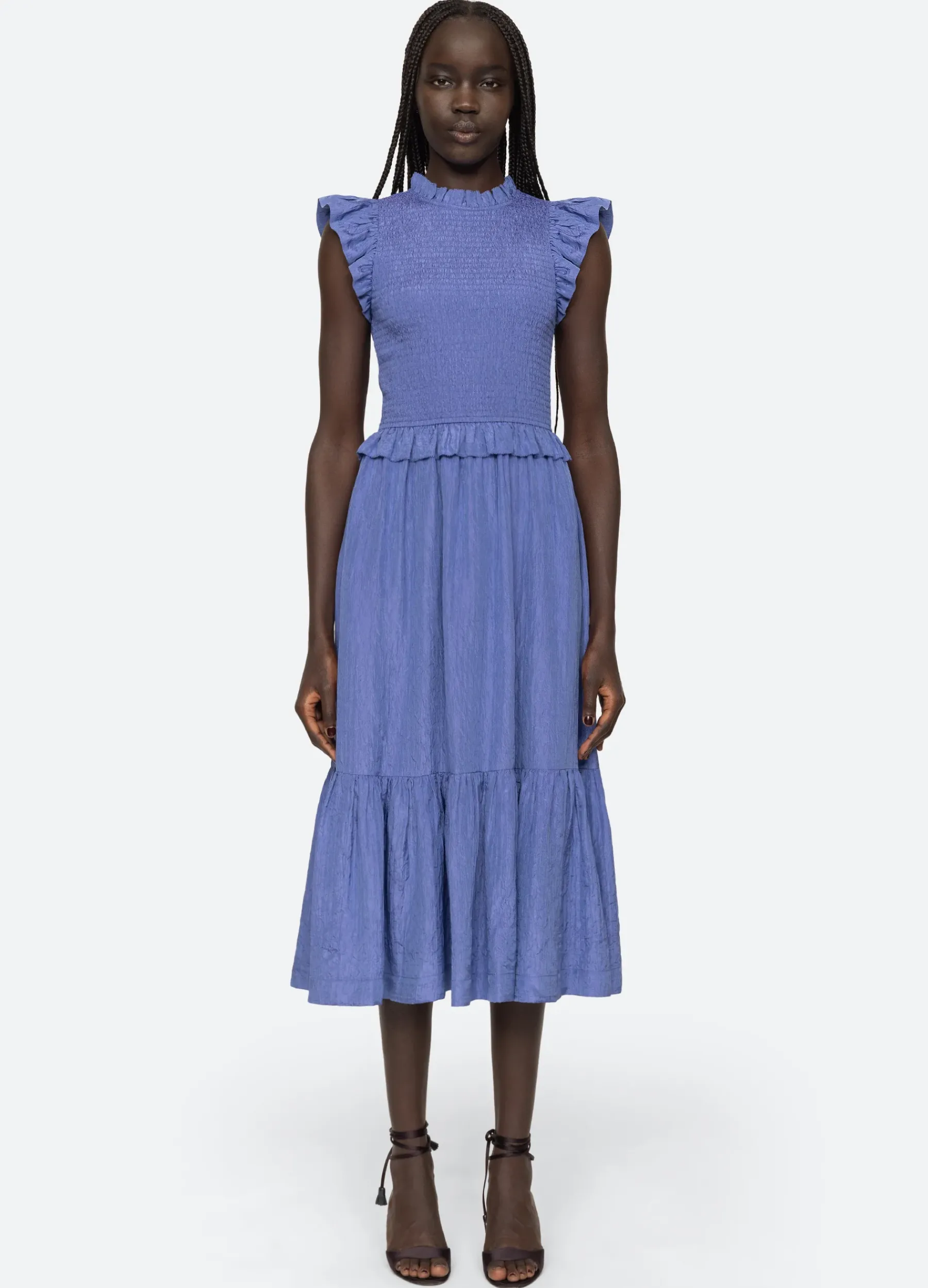 The Siya silk dress features a smocked bodice for a more form-fitting shape, ruffle neckline and delicate flutter sleeves.