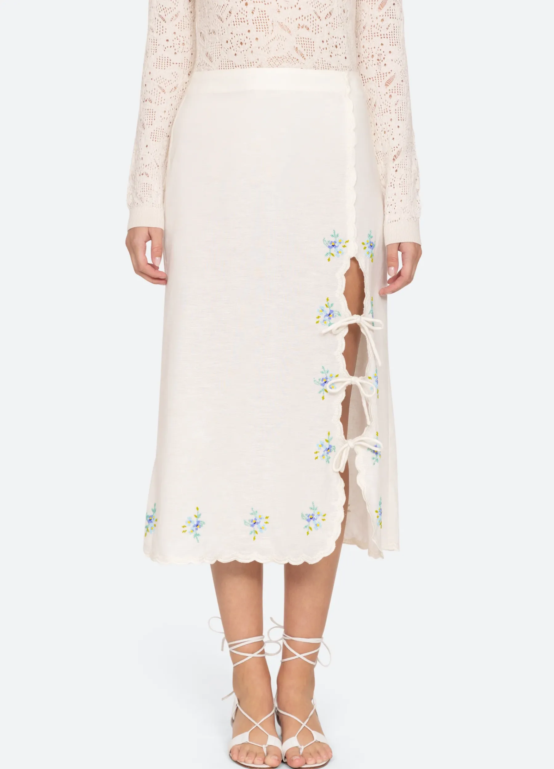 The Tania beaded skirt features an asymmetrical front slit with self ties, floral beaded detailing and scalloped hemline.
