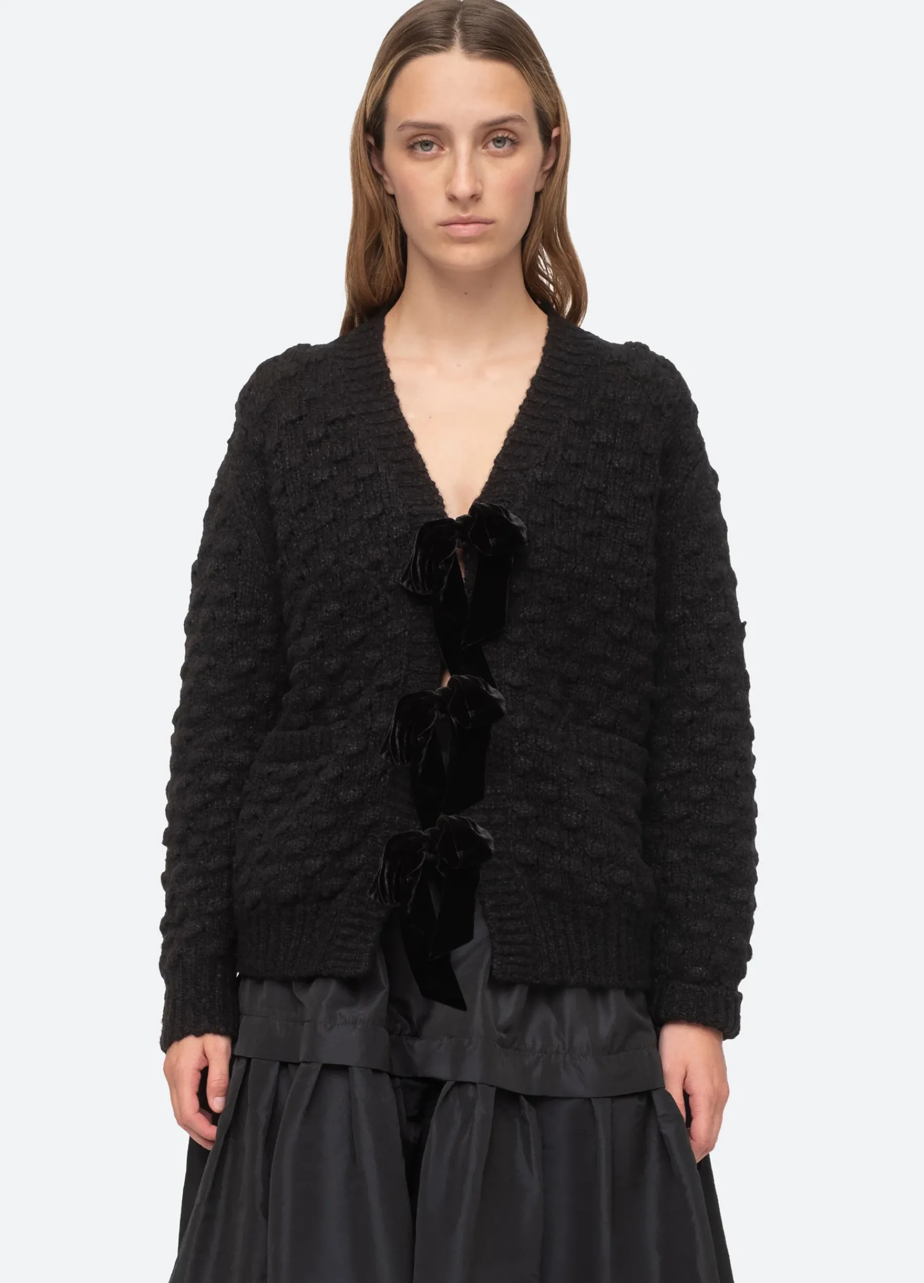 The Teresa bow tie long sleeve cardigan features velvet bow tie closures and is designed for an oversized, relaxed fit.