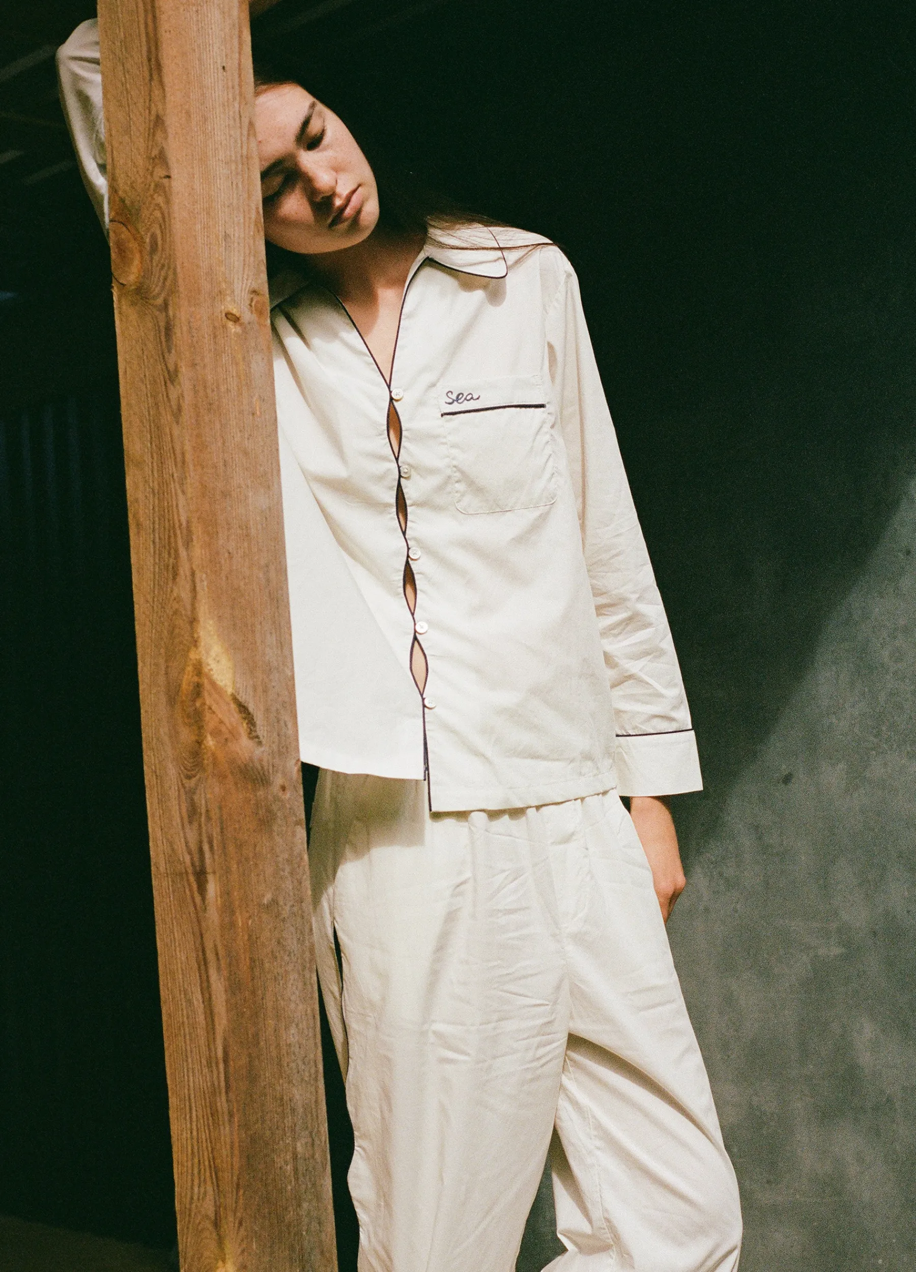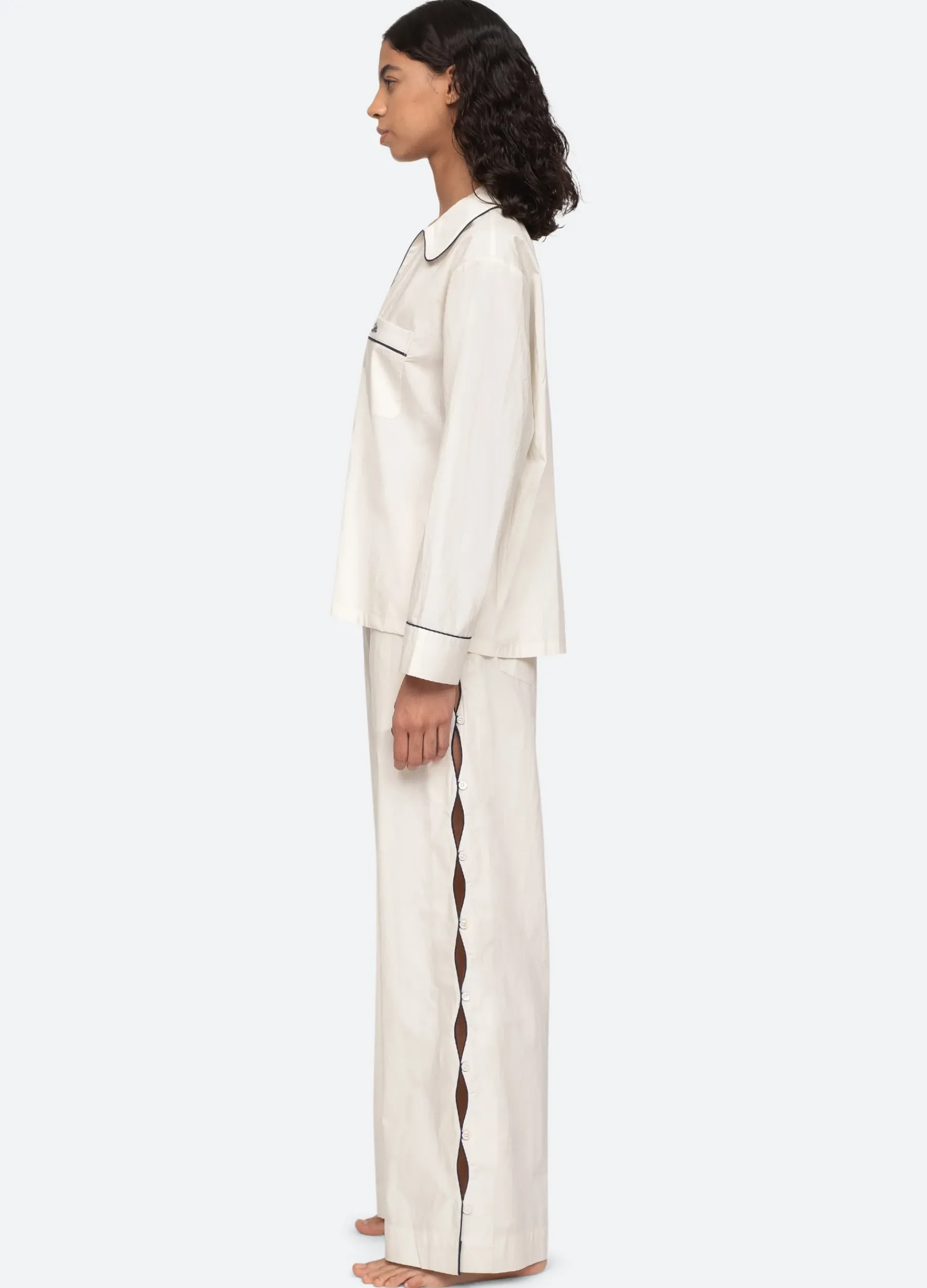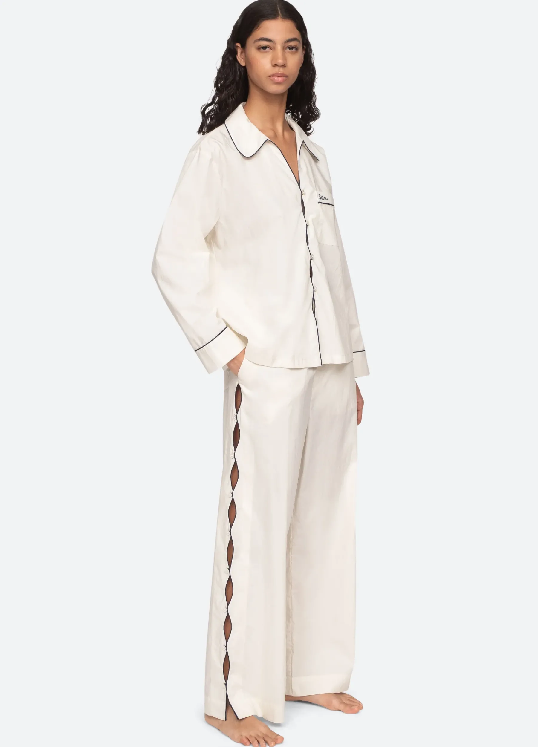 The Vesta binding long pajama set features embroidered ‘SEA’ logo and cut-out detailing.