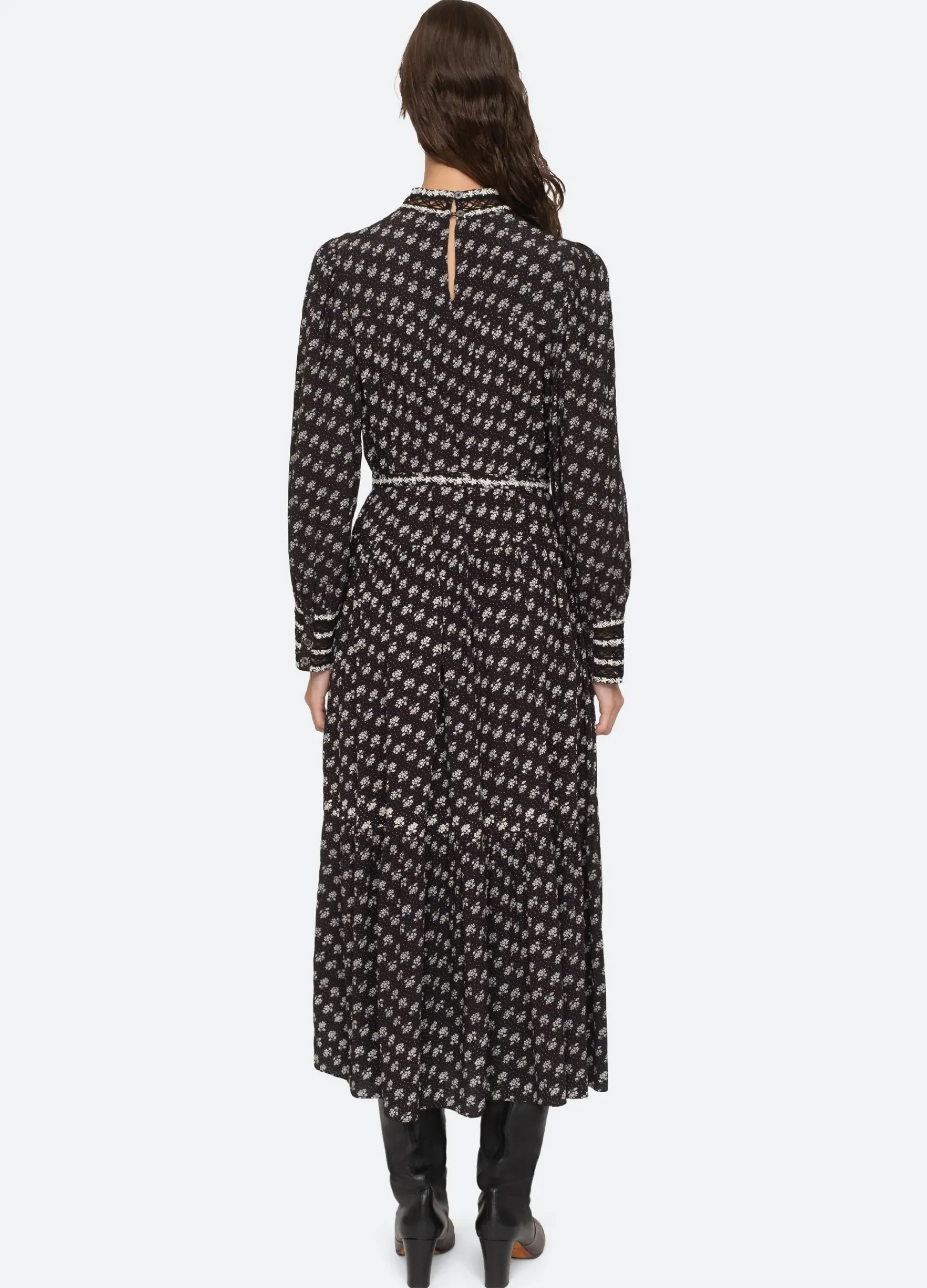 The Ada floral print long sleeve dress features embroidered detailing and lace insets.