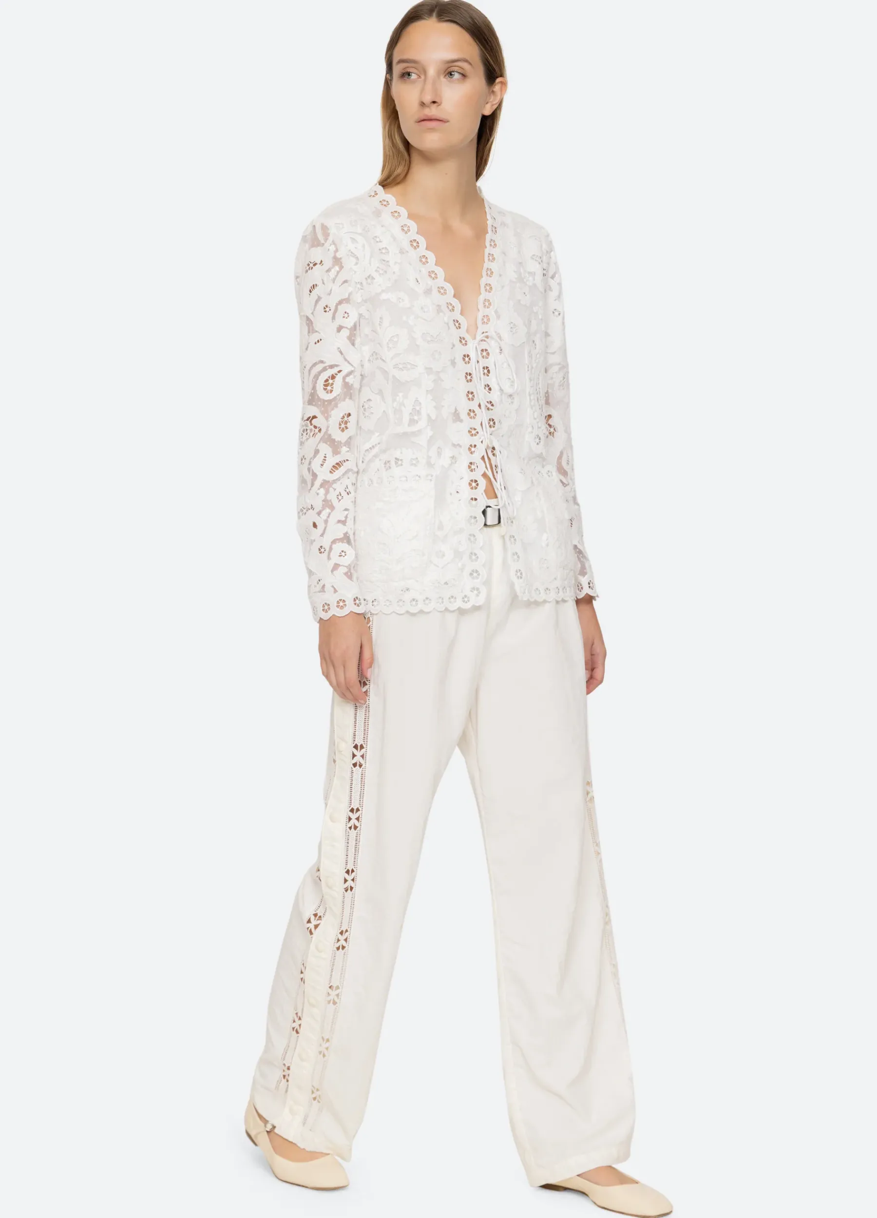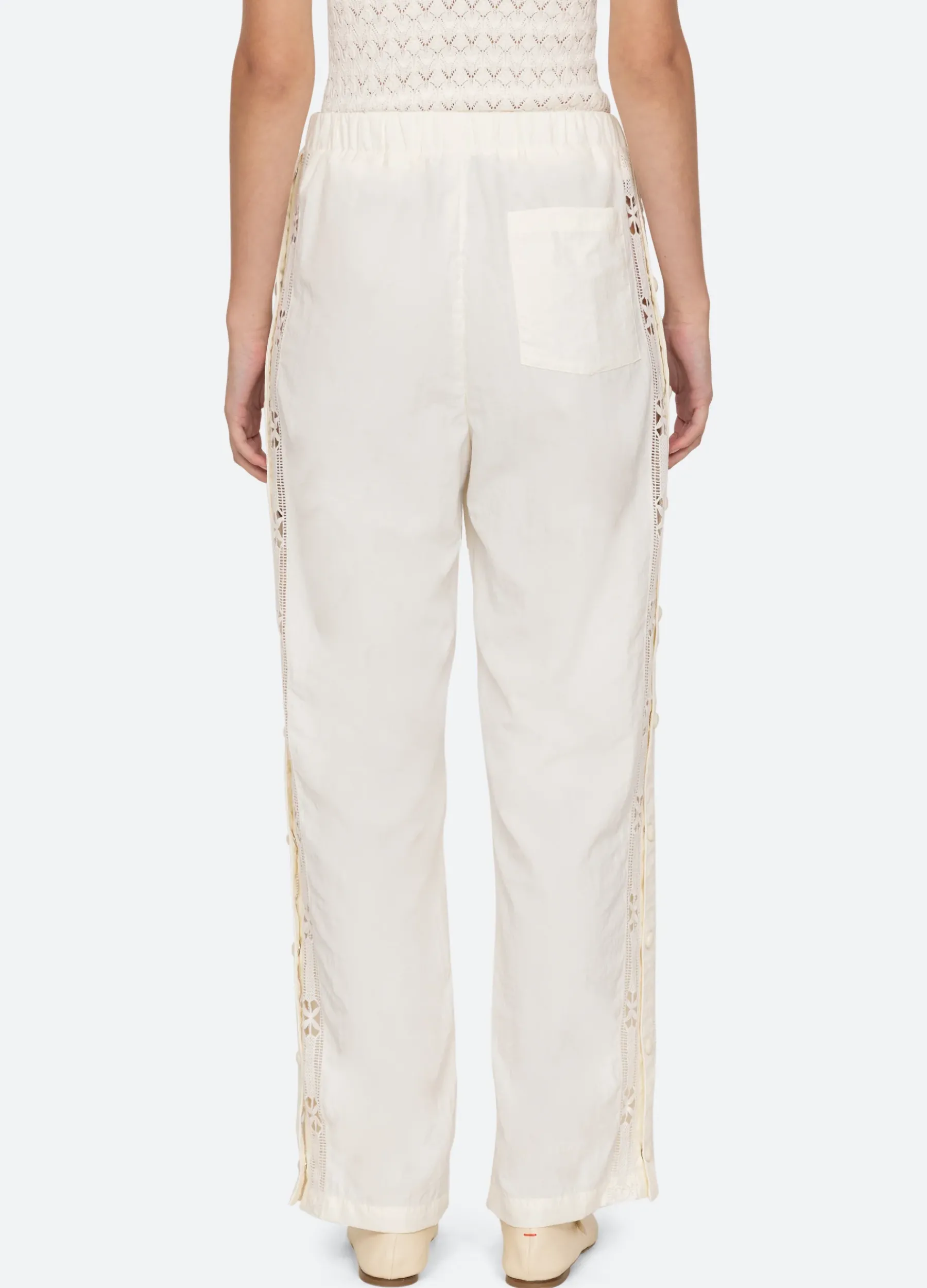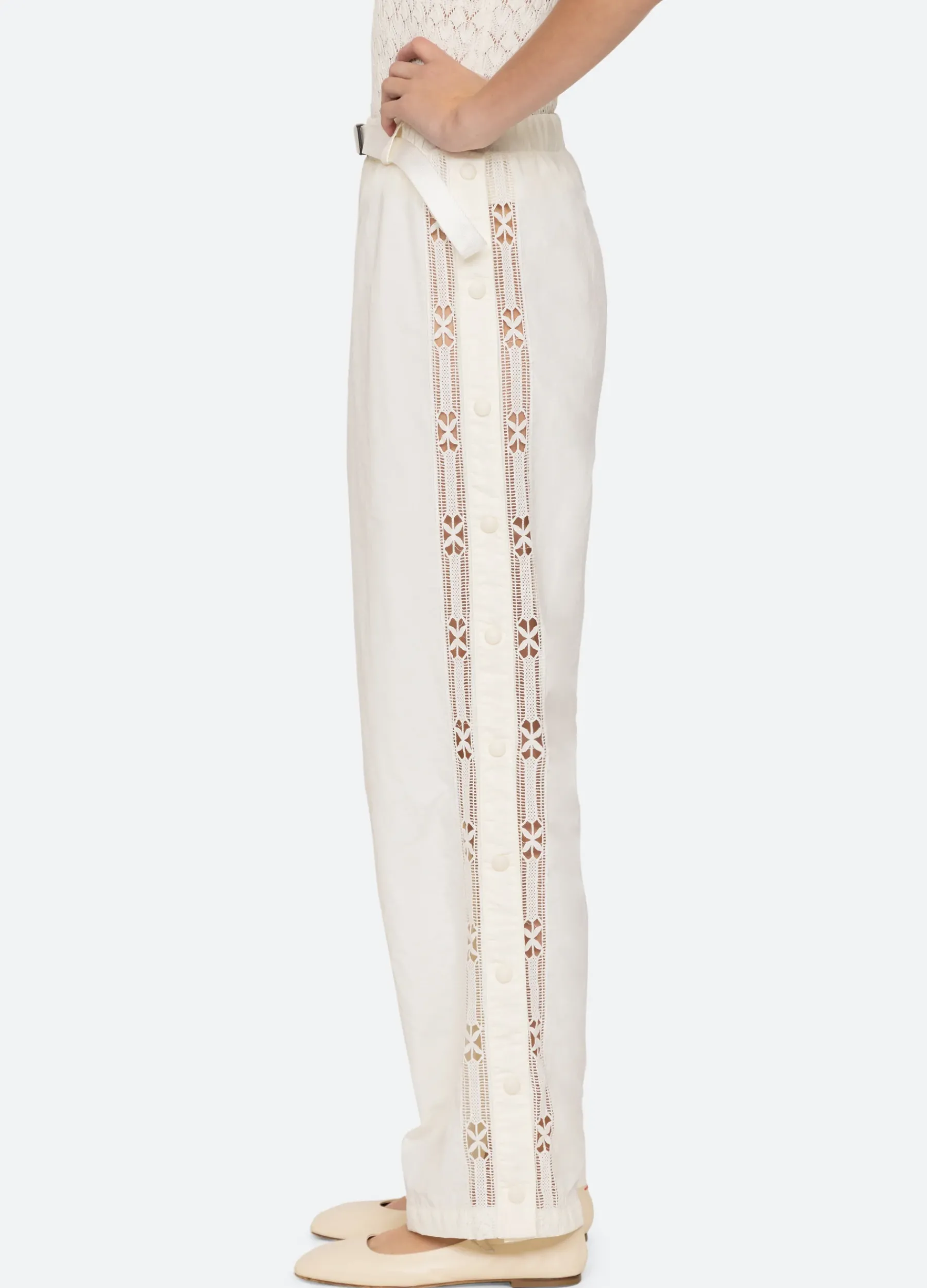 The Anisley windbreaker pants feature an elasticized waist with belt, lace trim detailing down the side of the leg.