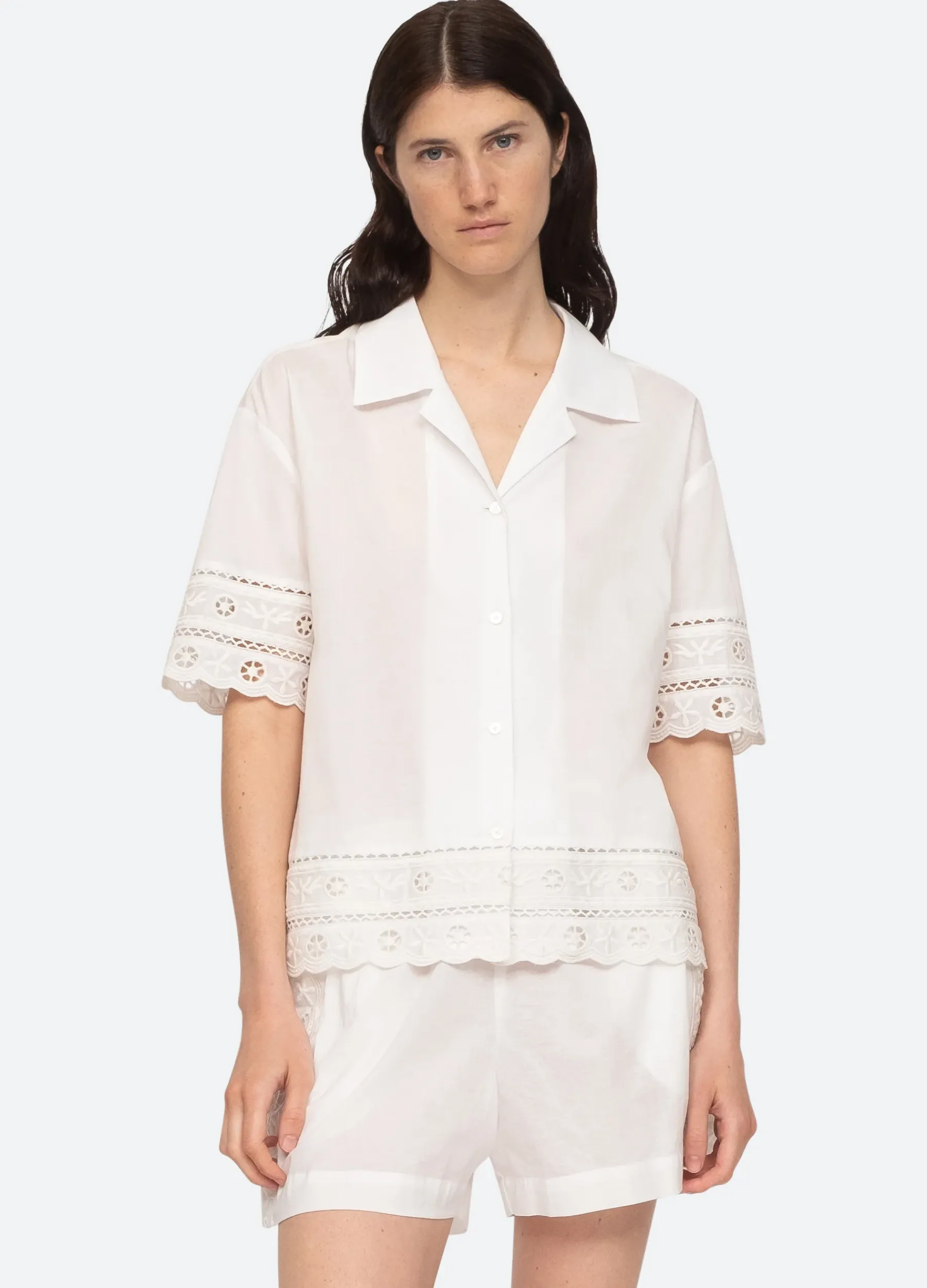 The Arabella embroidered swim short sleeve coverup top features embroidered trim detailing & button front closure.