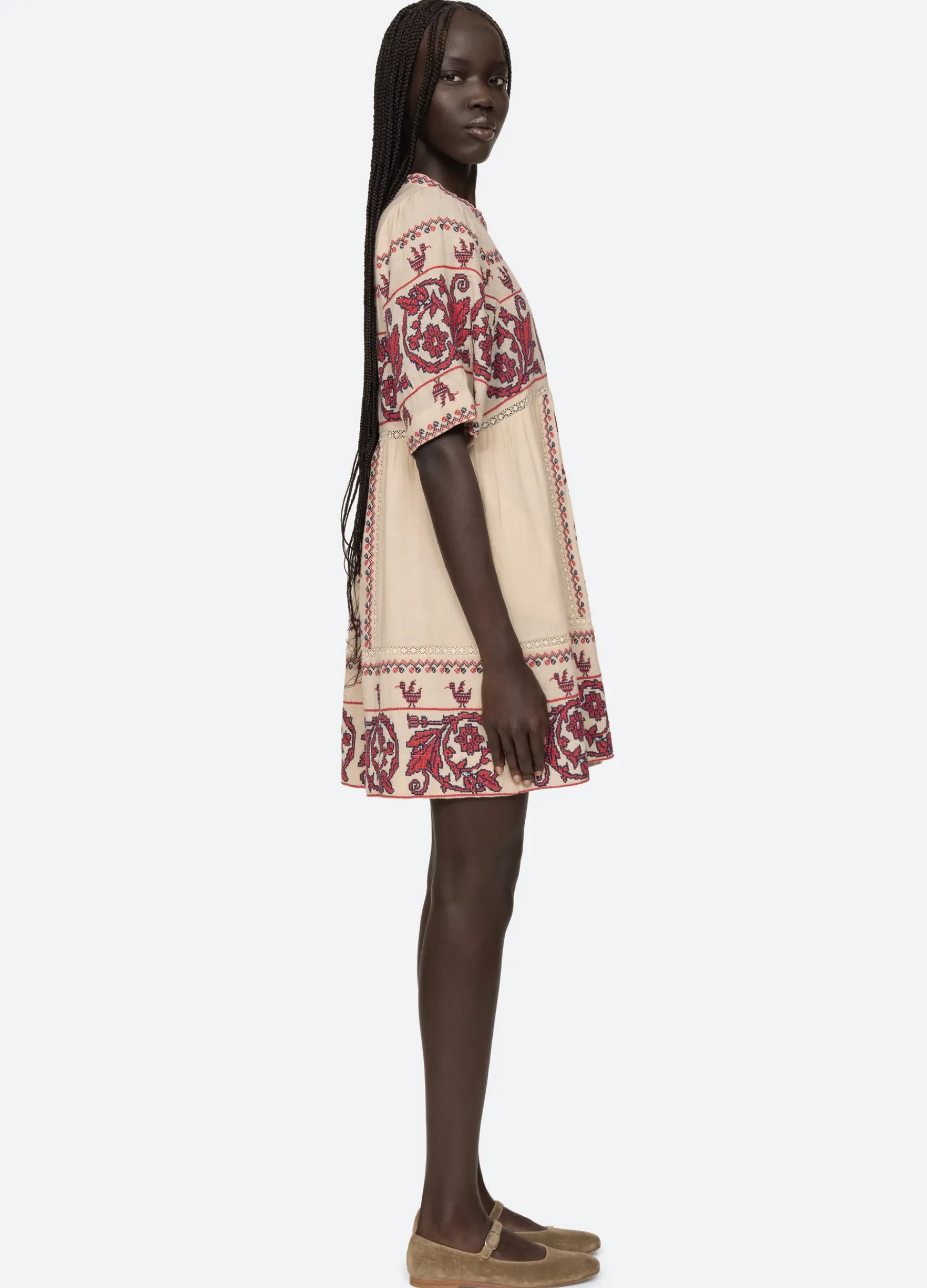 The Beena embroidered dress features short sleeves, cross stitching embroidery throughout and a mini silhouette.