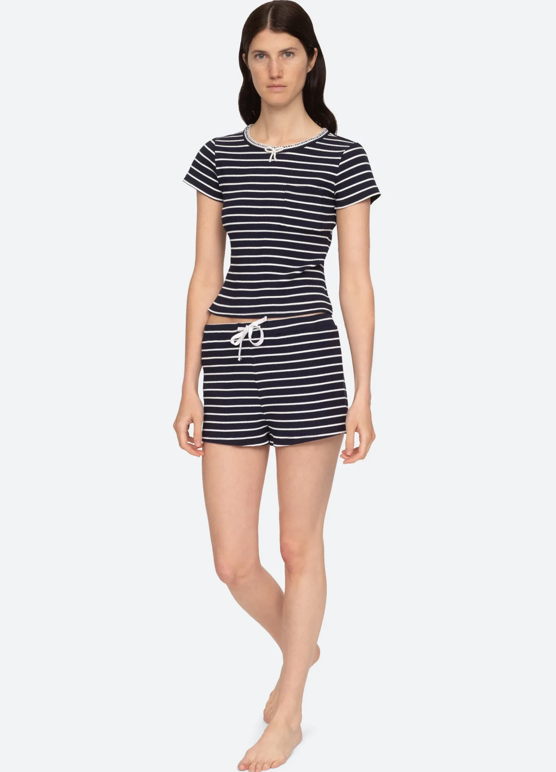 The Bernadette ribbed short pajama set features a decorative bow and patch pocket.