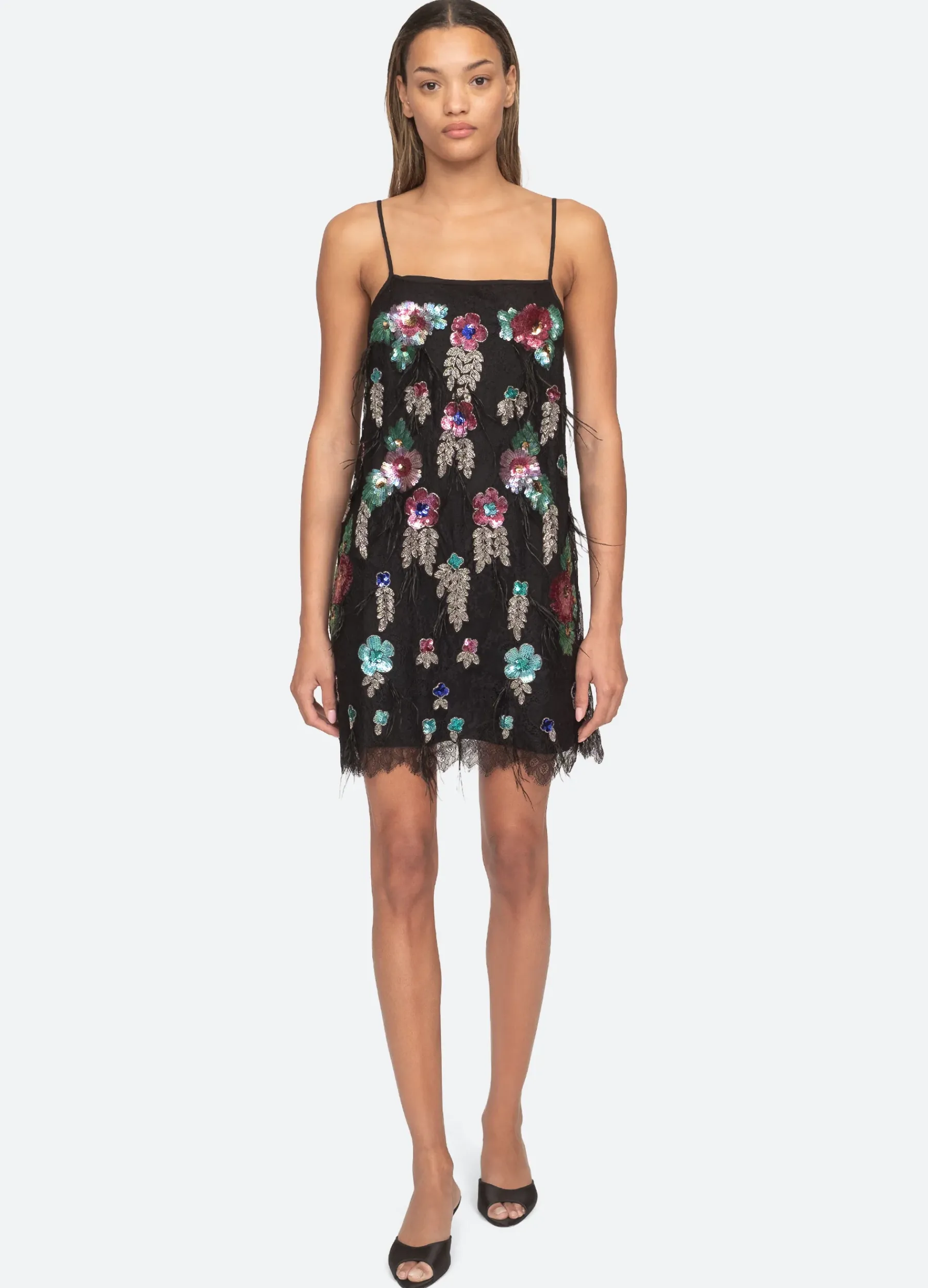The Bethany lace slip dress is accented with floral sequin appliques, beaded detailing and feathers.