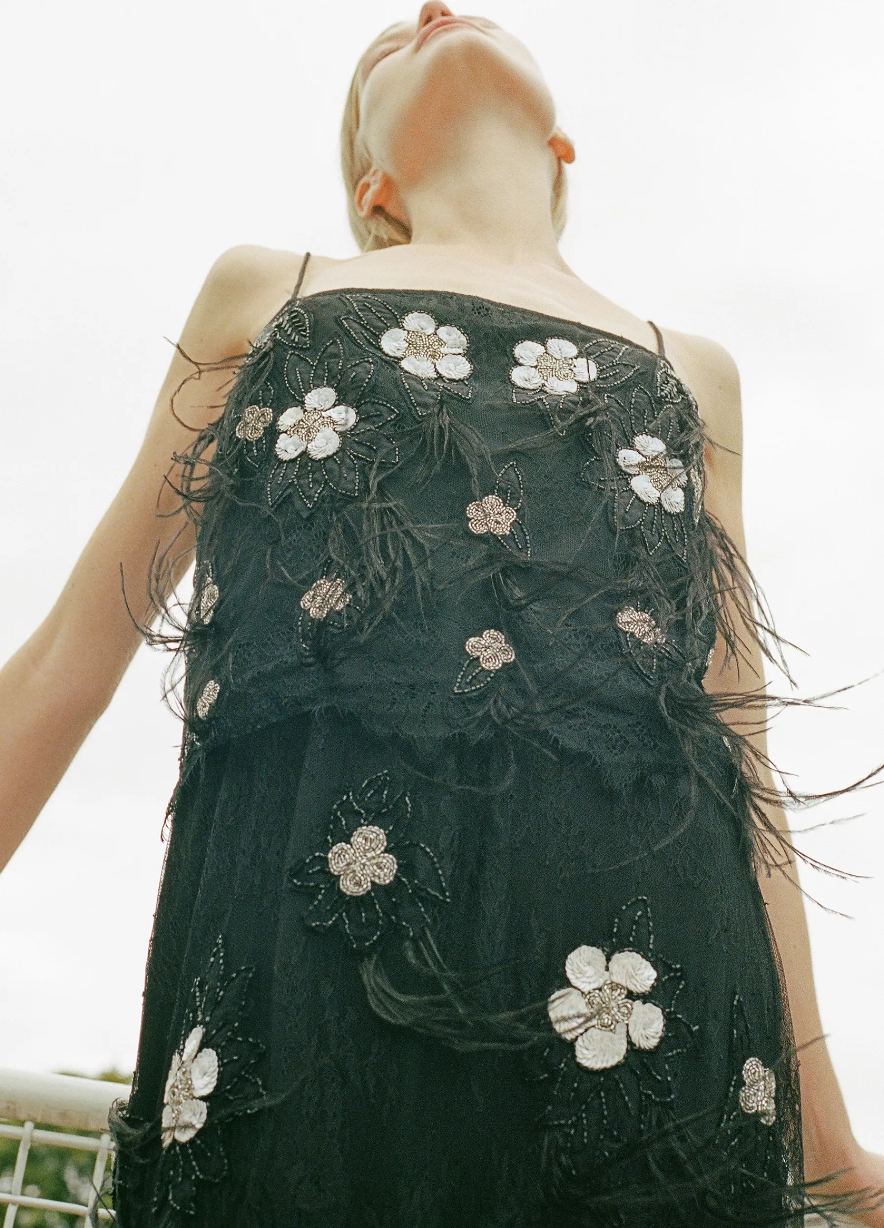 The Bethany lace tank top is accented with floral sequin appliques, beaded detailing and feathers.
