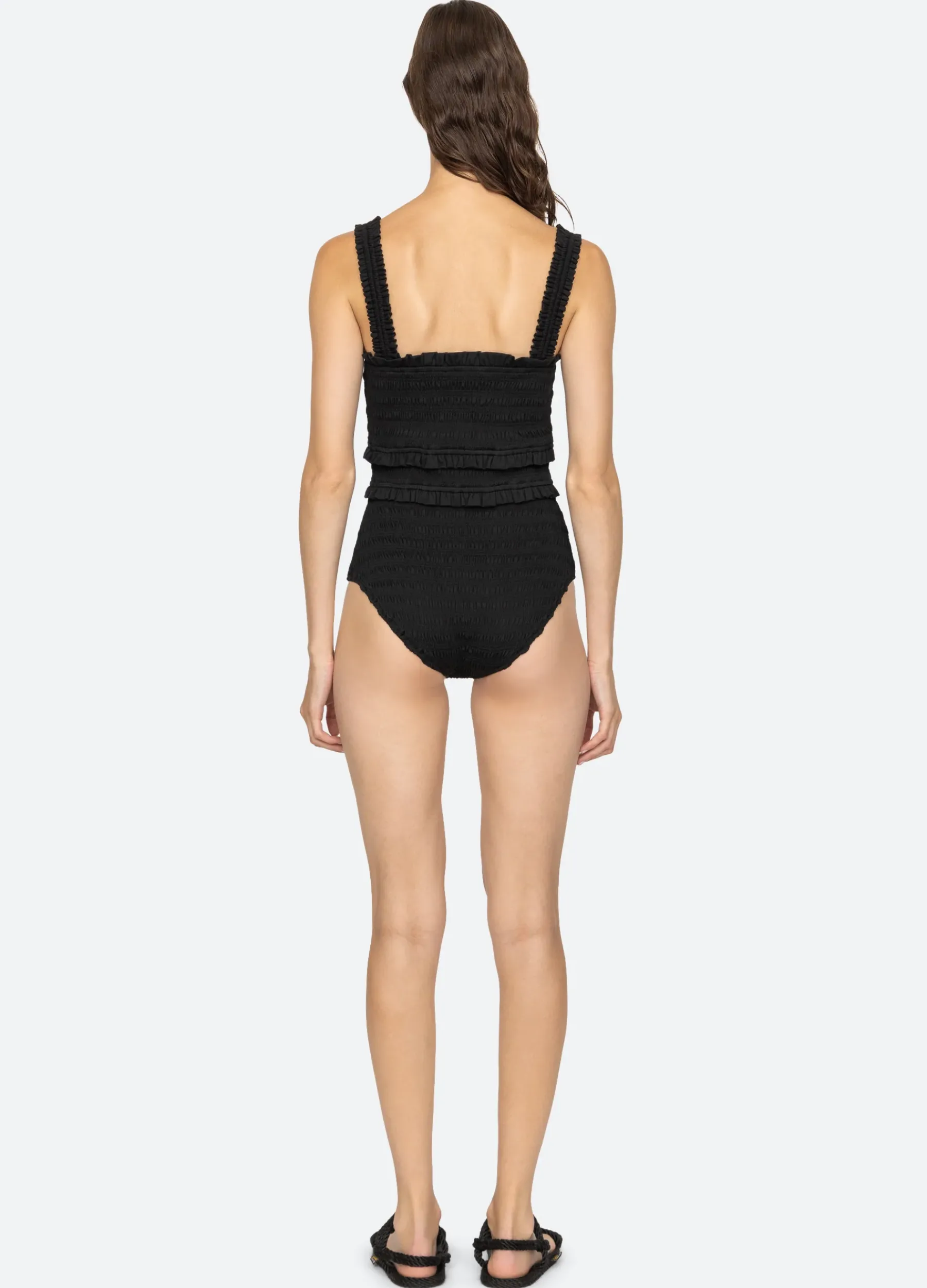 The Brice solid smocked one piece swimsuit features flattering smocking, ruffle detailing and a smocked bodice.