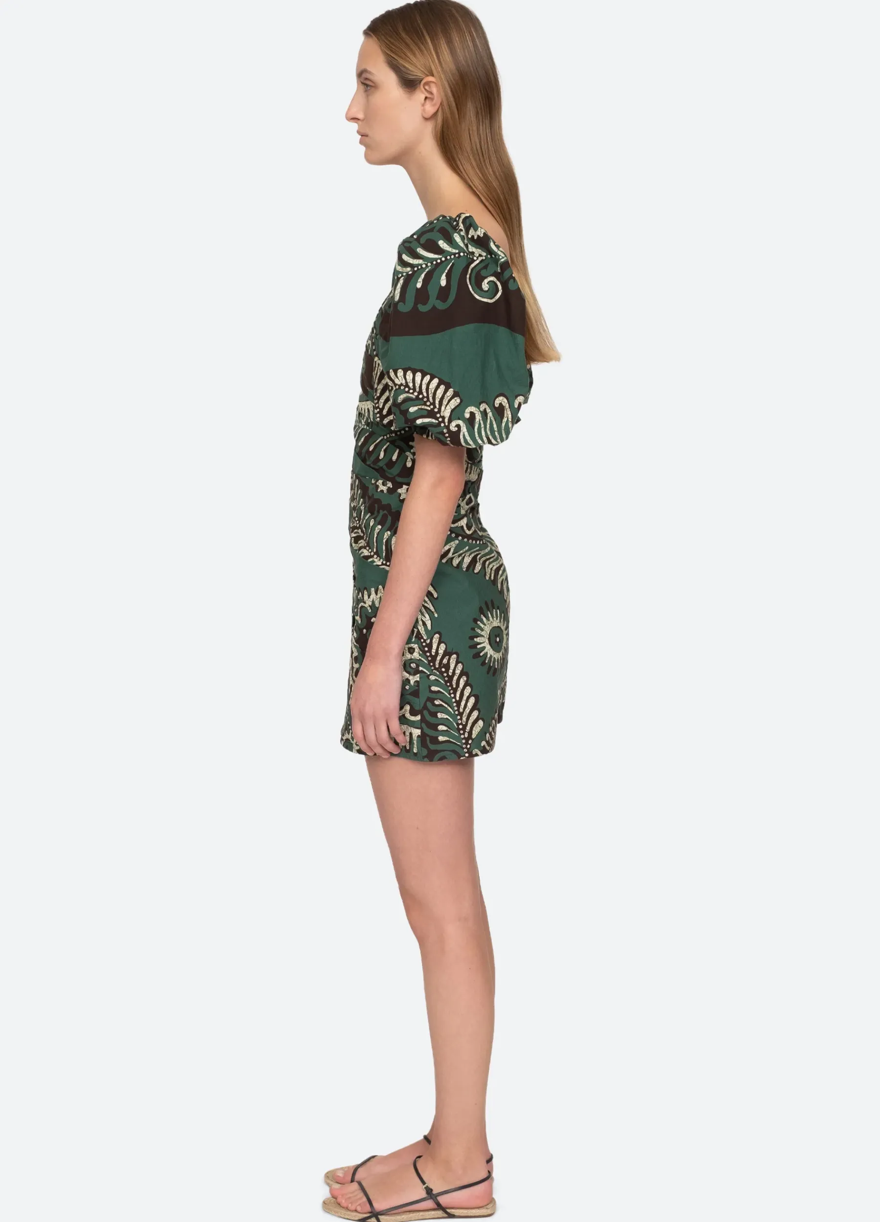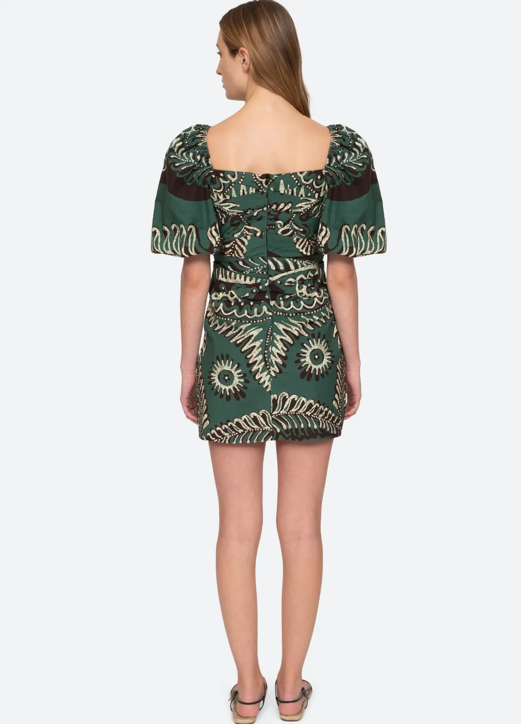 The Charlough graphic print mini dress features short puff sleeves, square neckline and draped detailing.
