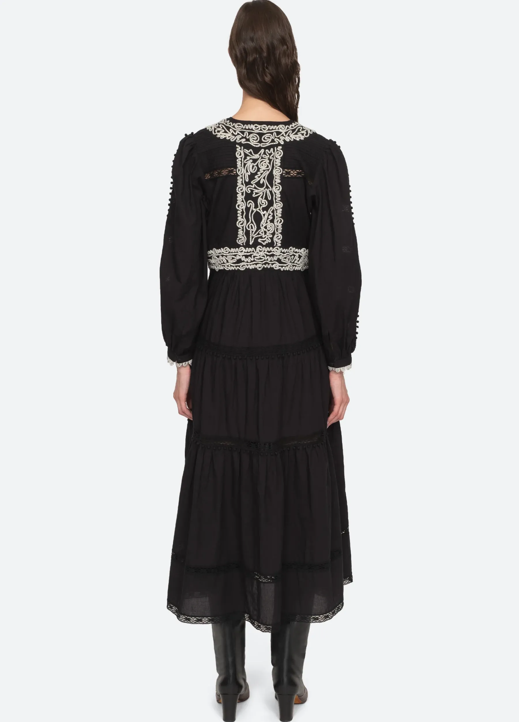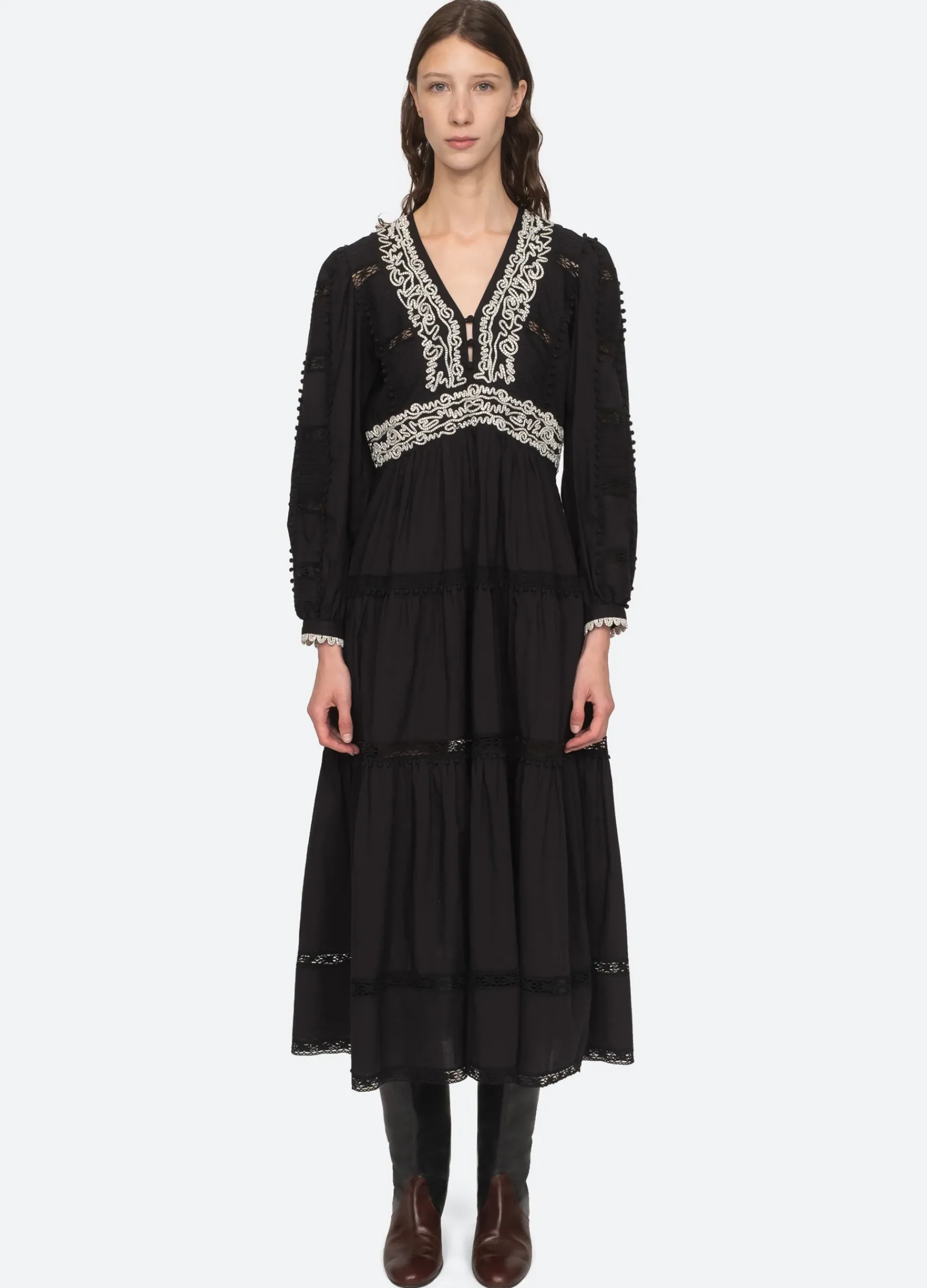 The Cordera embroidered long sleeve dress features a v-neckline, delicate lace insets and embroidered detailing on the bodice.