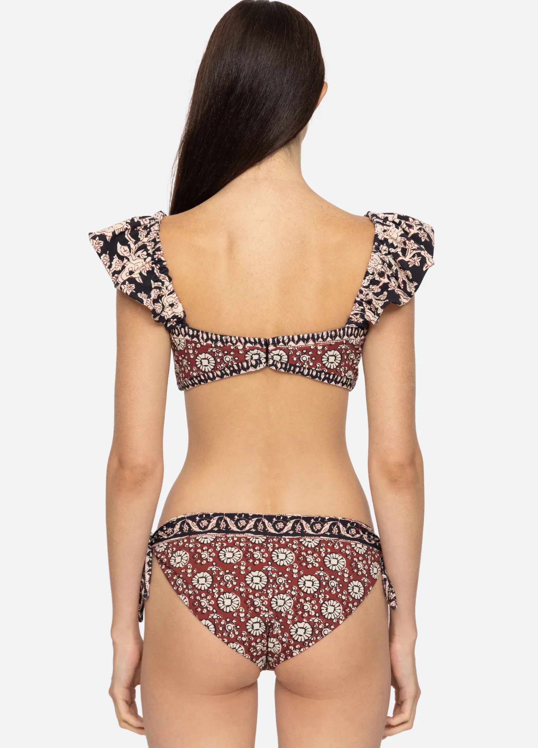 The Danae floral print bikini top features flutter sleeves, and front tie.